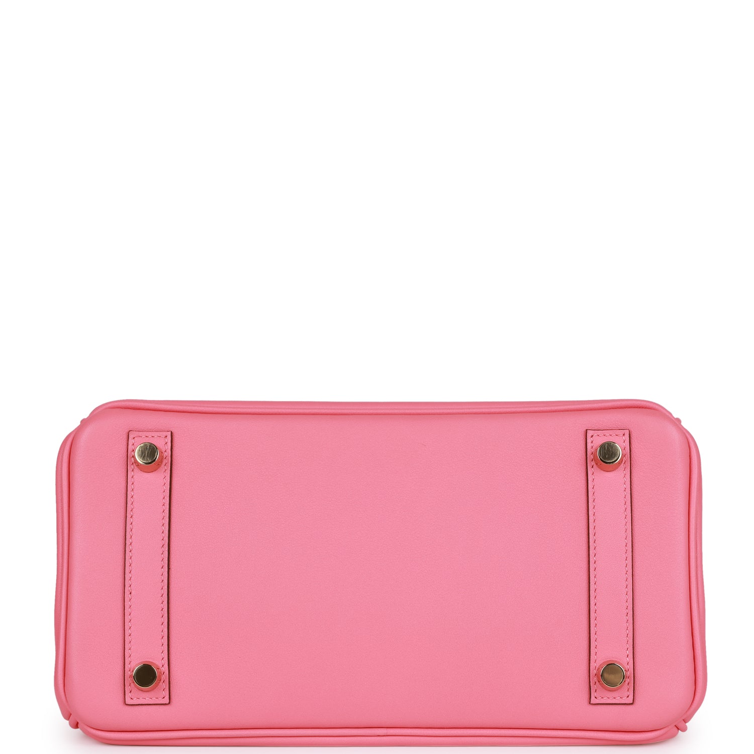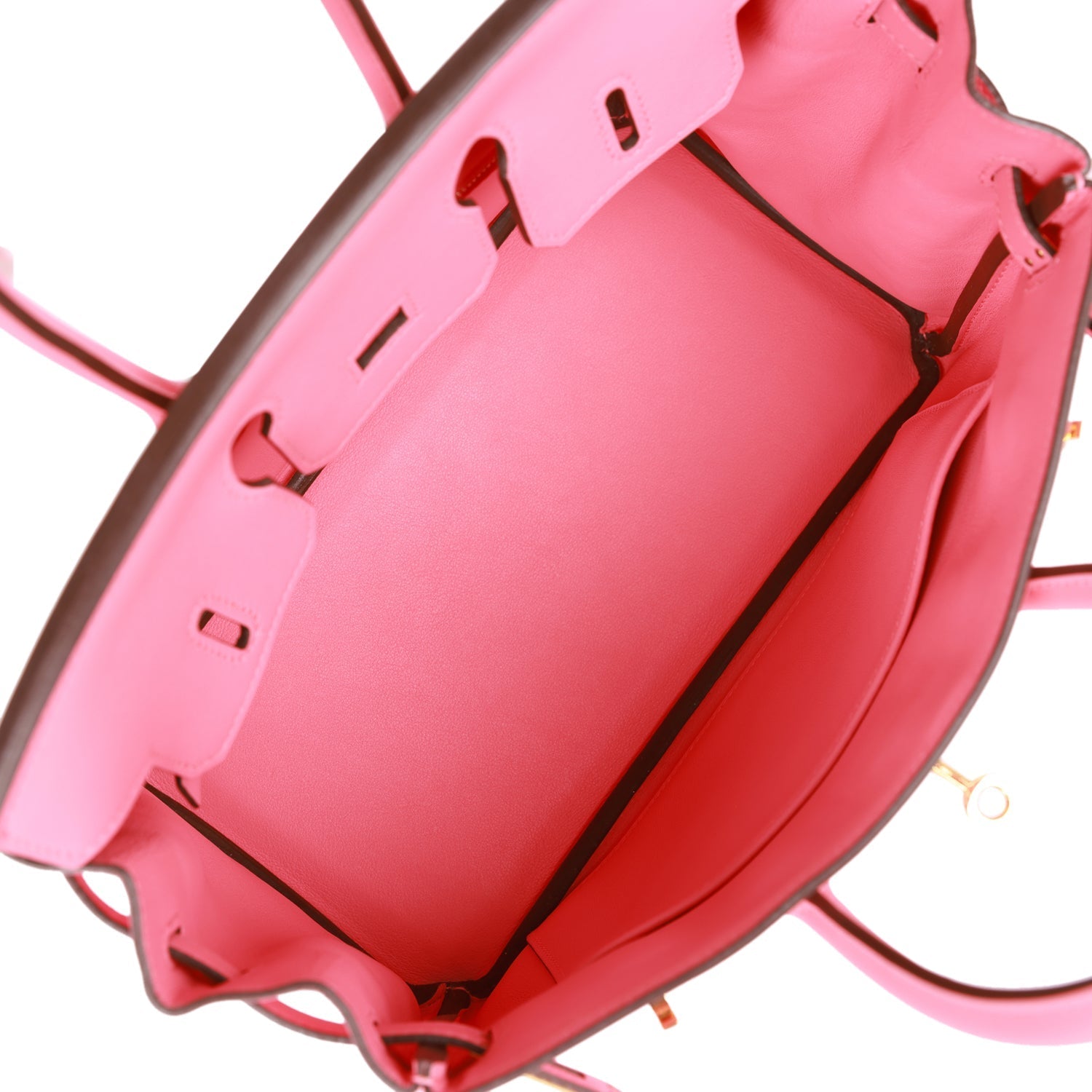 This Birkin is in Rose Azalee swift with gold hardware and features tonal stitching, front flap, two straps with center toggle closure, clochette with lock and two keys, and double rolled handles.