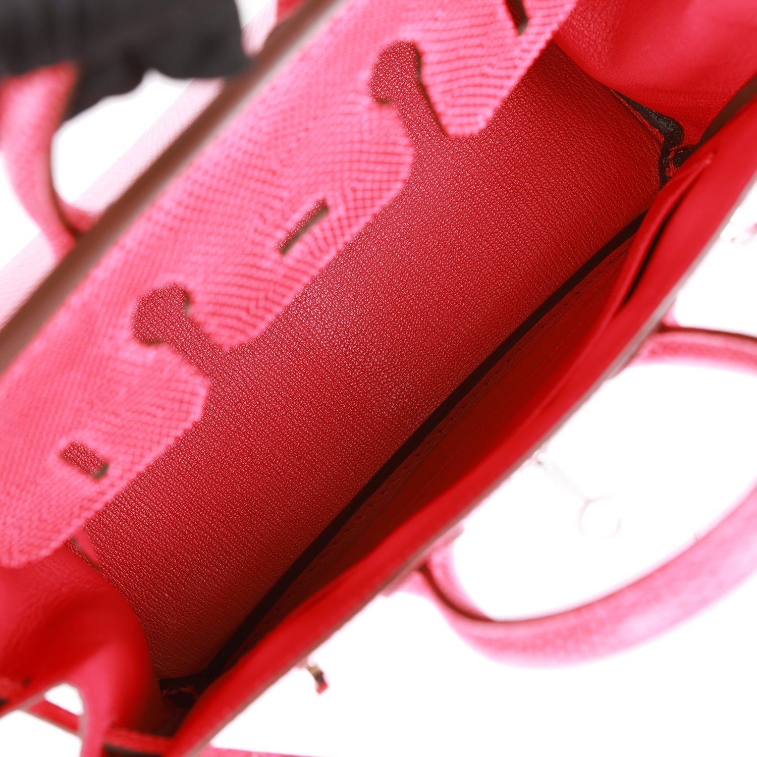 The interior is lined with Rose Extreme chevre and has one zip pocket with an Hermes engraved zipper pull and an open pocket on the opposite side.