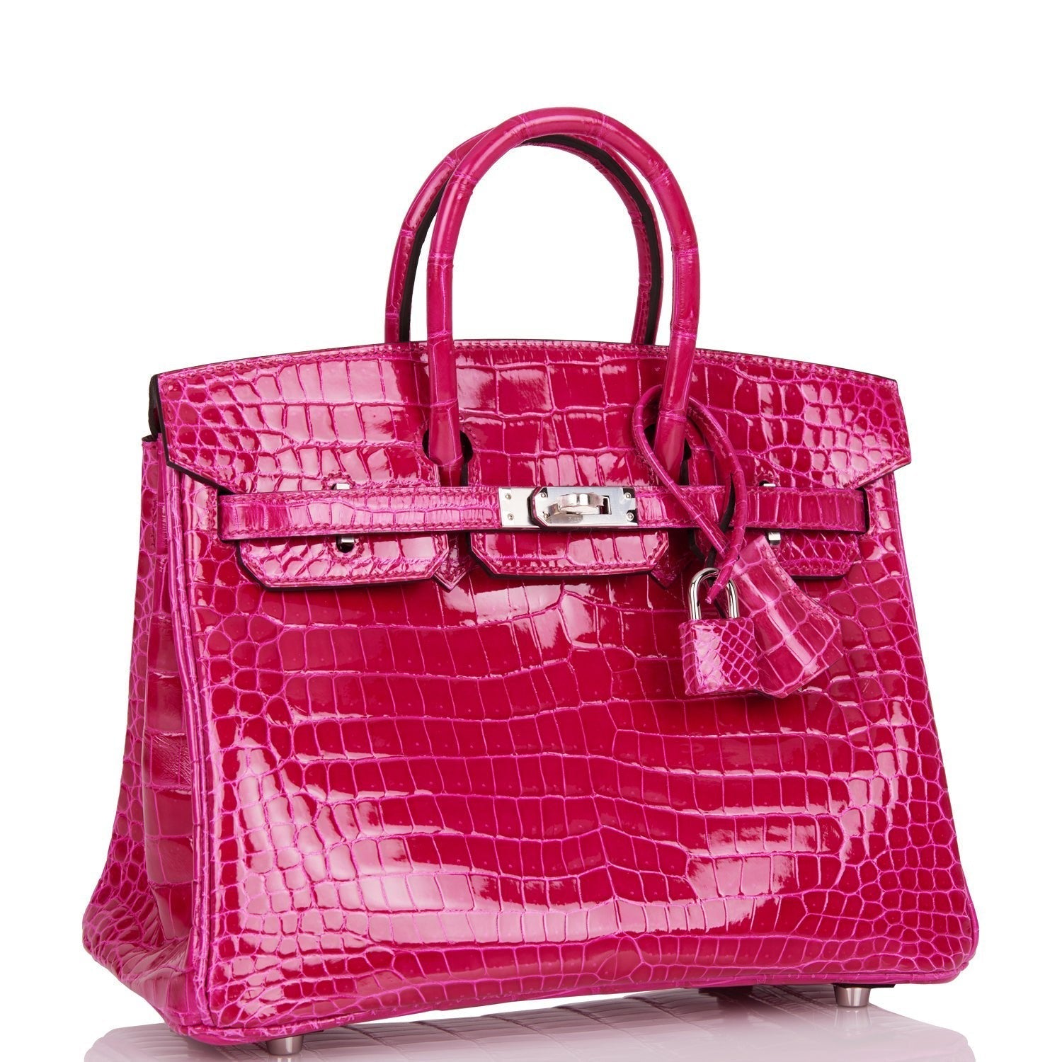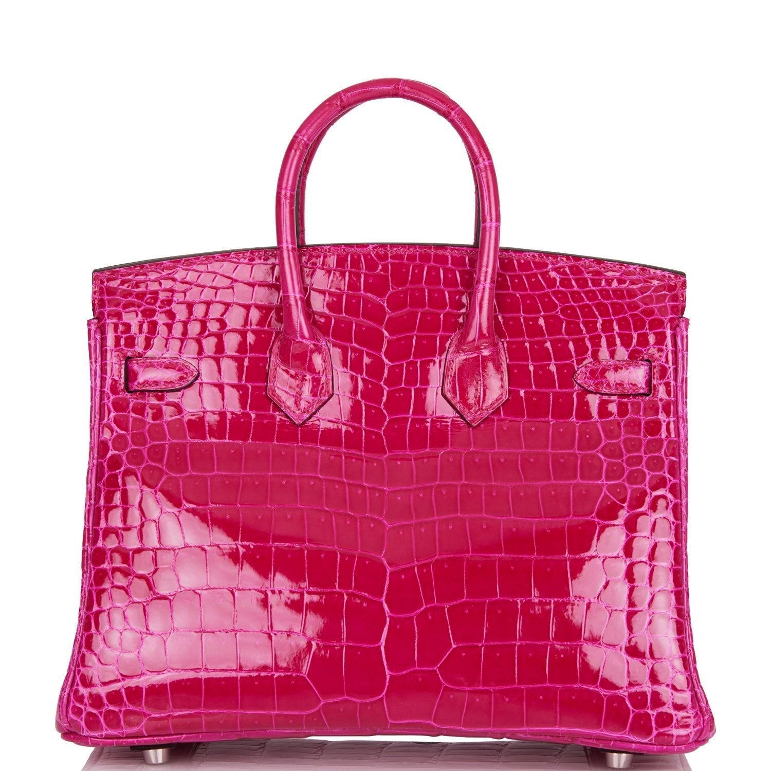 This Birkin is in Rose Mexico shiny Porosus crocodile leather with palladium hardware and has tonal stitching, front strap, two straps with center toggle closure, clochette with lock and two keys and double rolled handles.