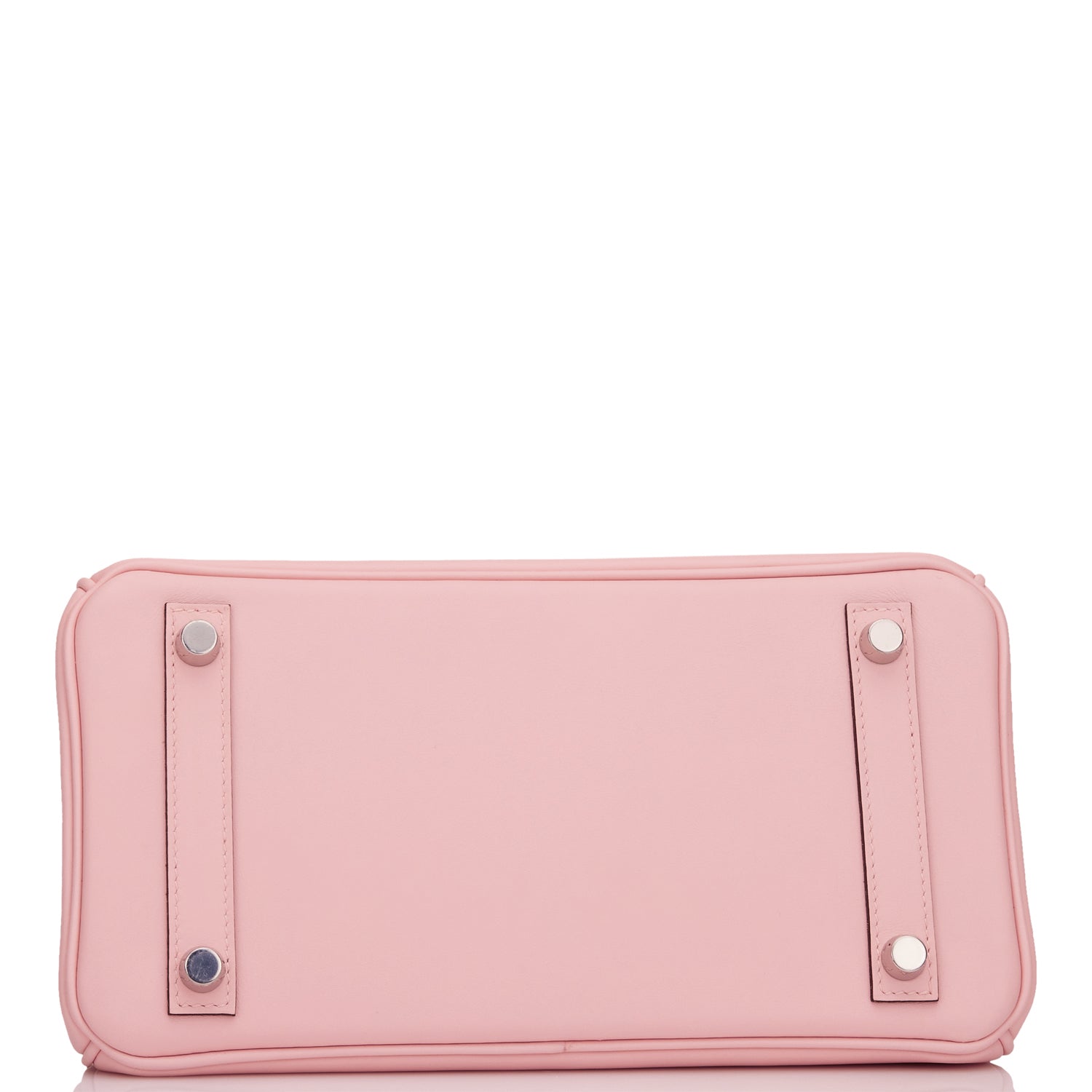 This Birkin is of Rose Sakura Jonathan leather with palladium hardware and features tonal stitching, front flap, two straps with center toggle closure, clochette with lock and two keys, and double rolled handles.