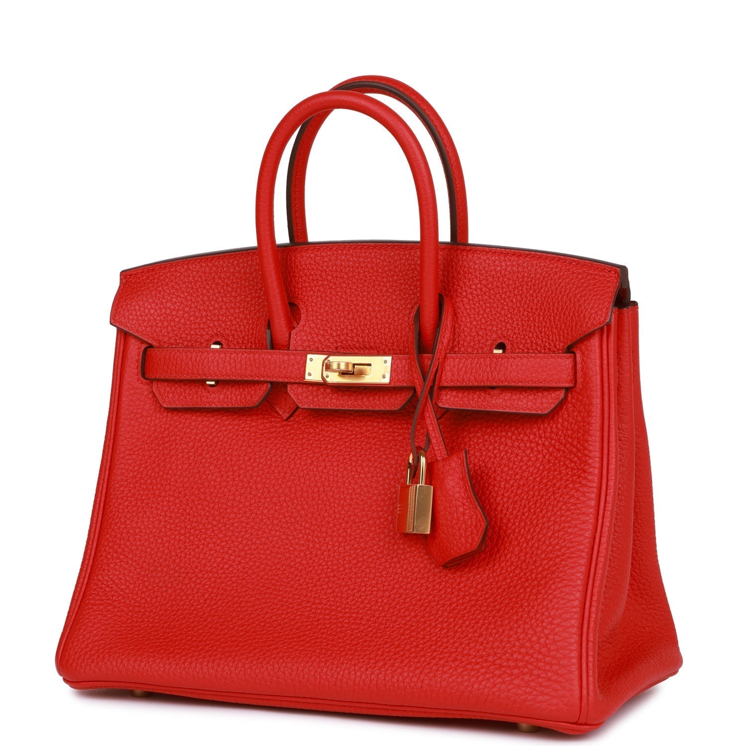 This Birkin is in Rouge de Coeur togo leather with gold hardware and features tonal stitching, front flap, two straps with center toggle closure, clochette with lock and two keys, and double rolled handles.