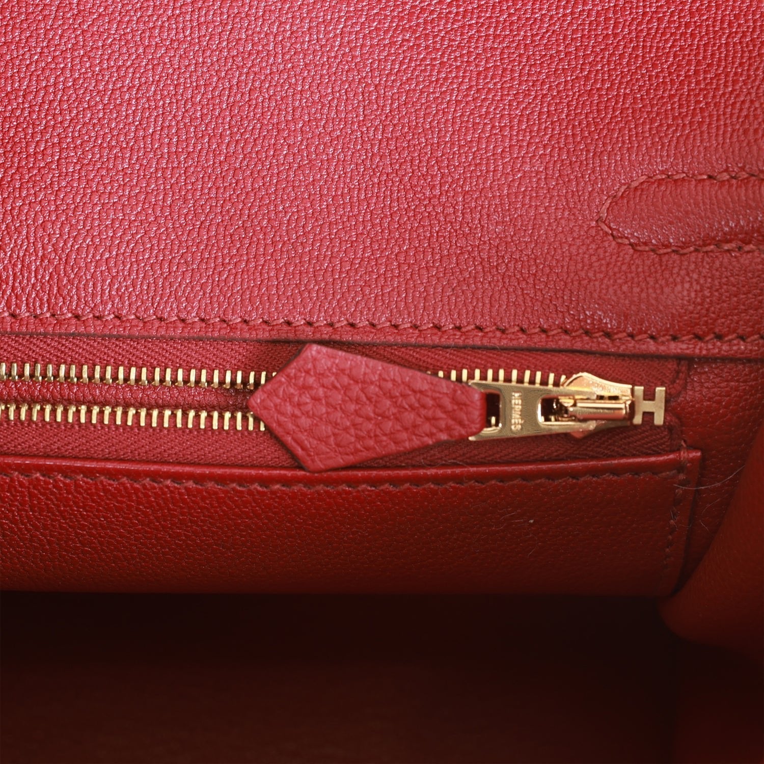 The interior is lined with Rouge Grenat chevre and has one zip pocket with an Hermes engraved zipper pull and an open pocket on the opposite side.