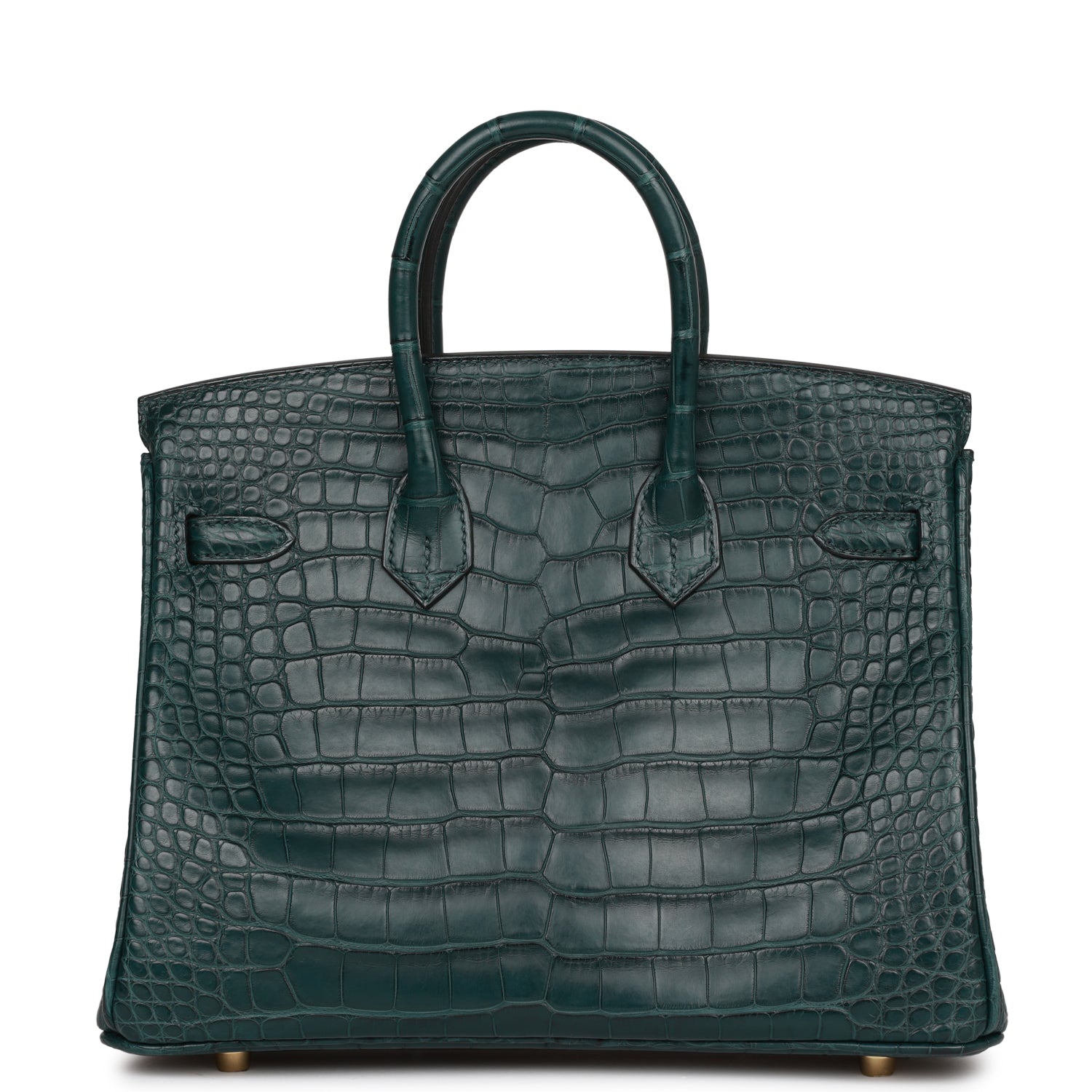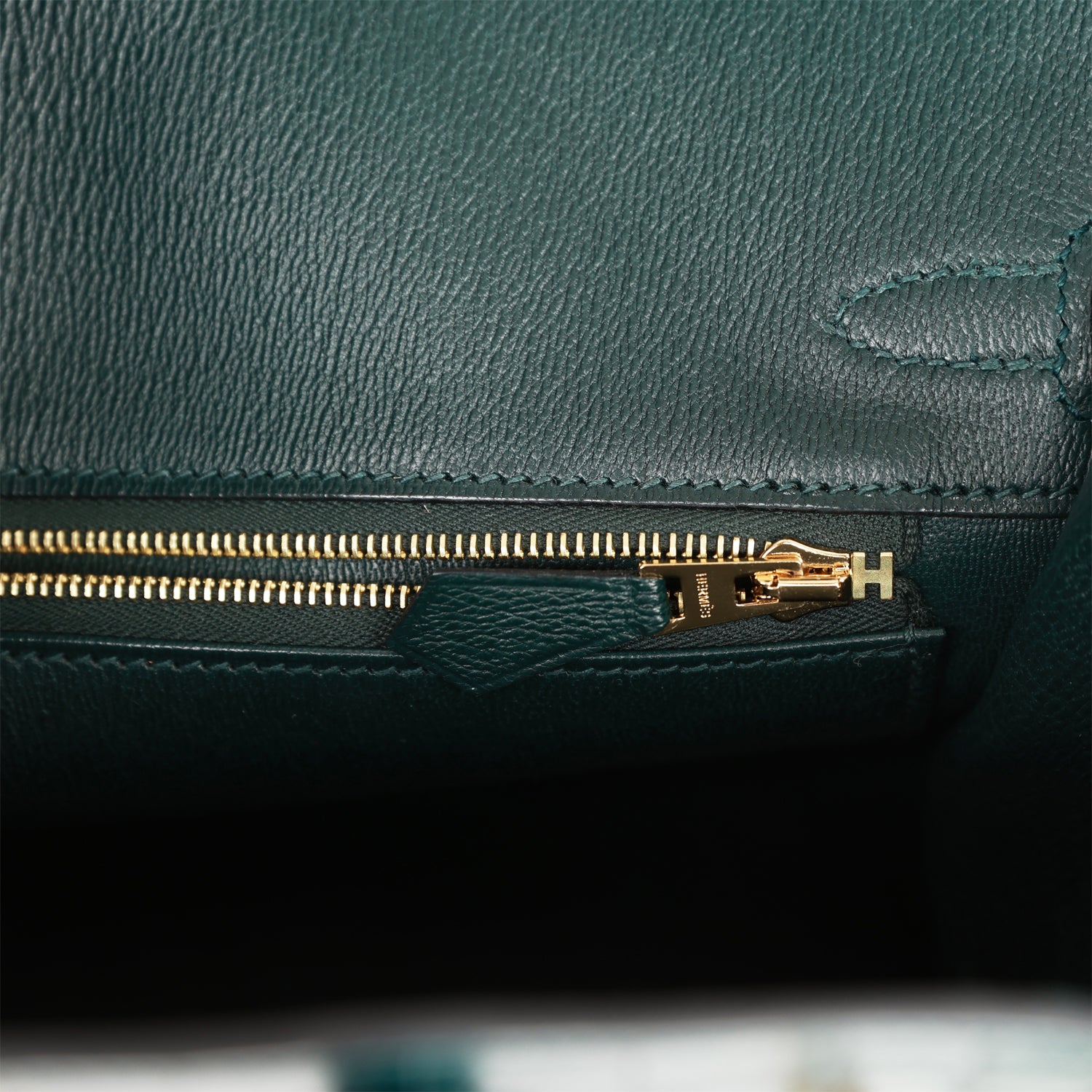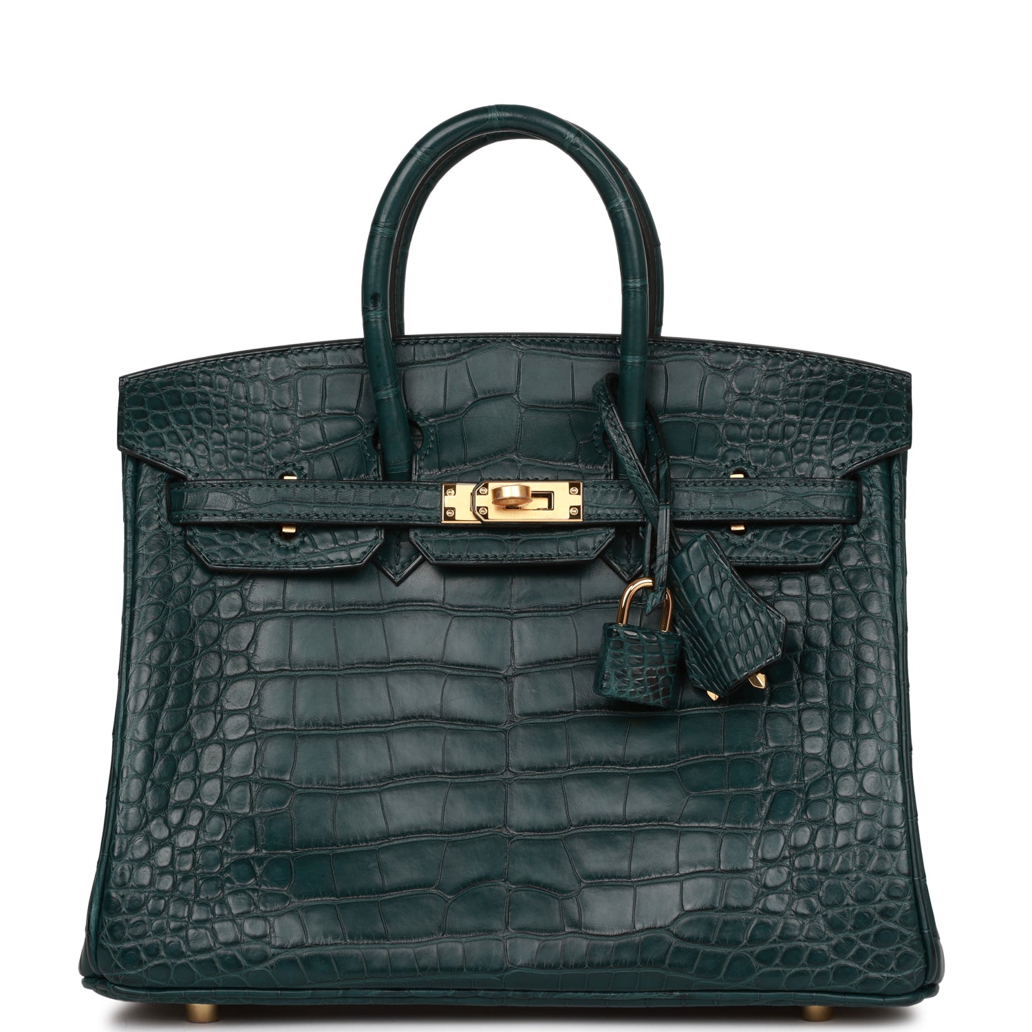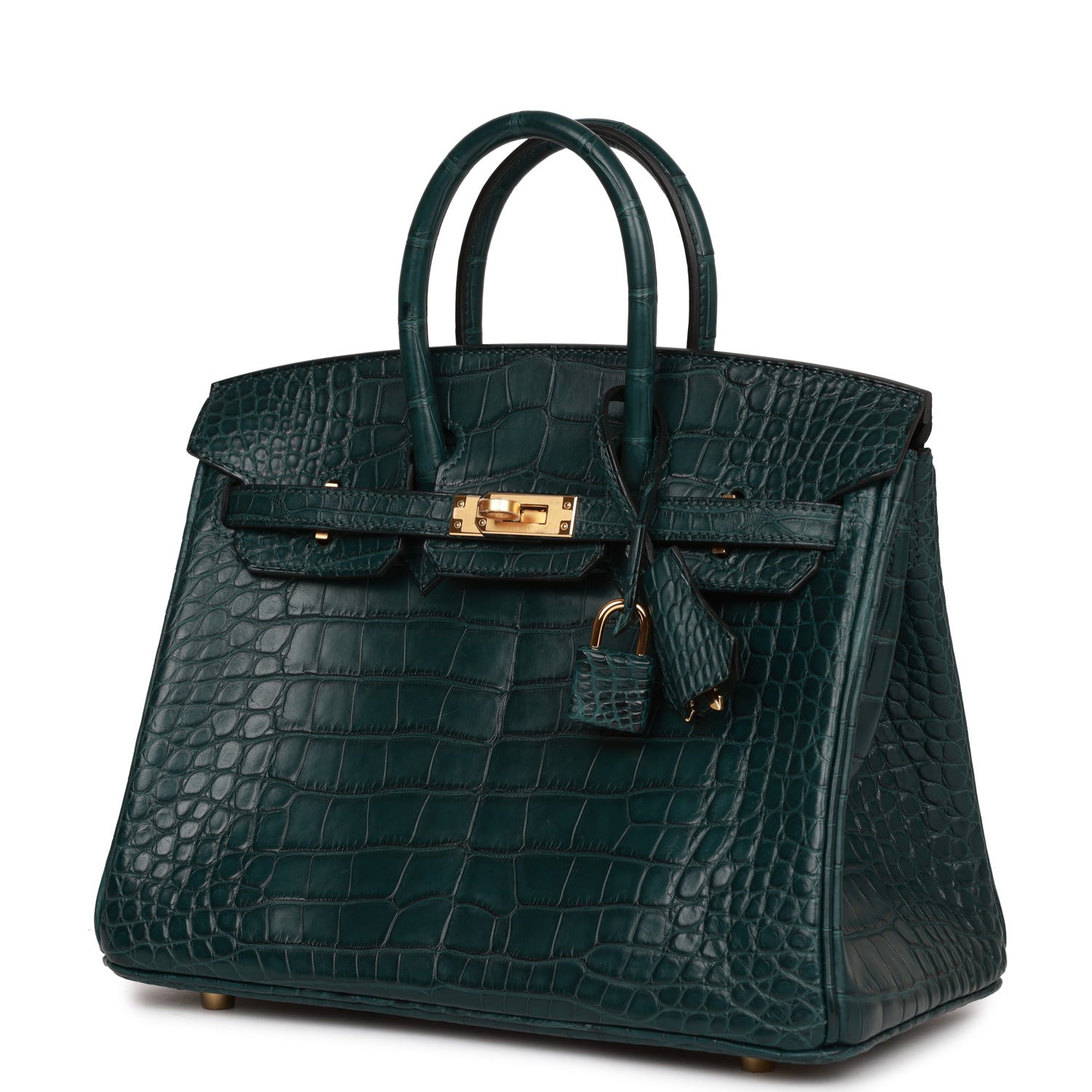 This Birkin is in Vert Cypress matte alligator leather with gold hardware and has tonal stitching, front strap, two straps with center toggle closure, clochette with lock and two keys and double rolled handles.