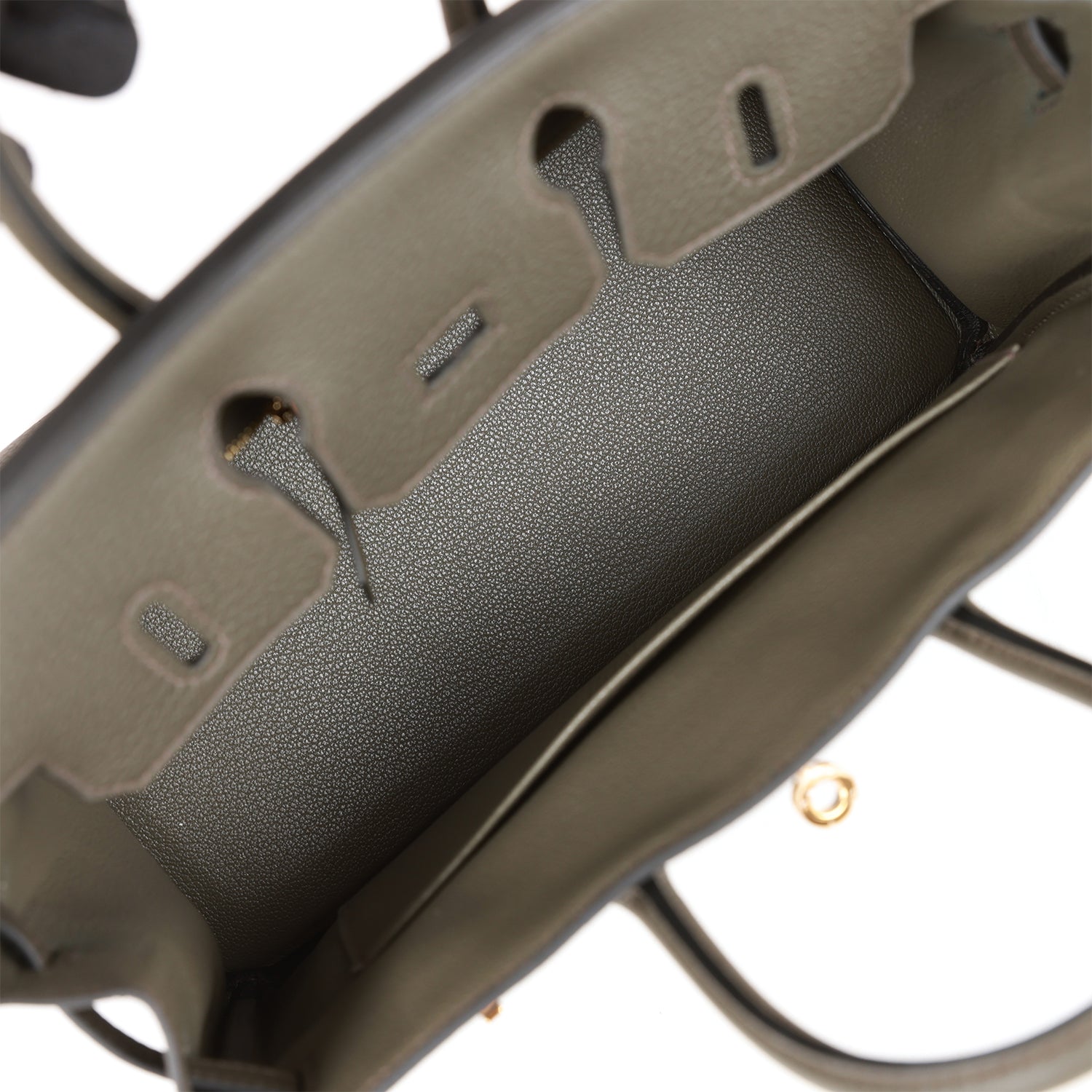 The interior is lined with Vert de Gris chevre and has one zip pocket with an Hermes engraved zipper pull and an open pocket on the opposite side.