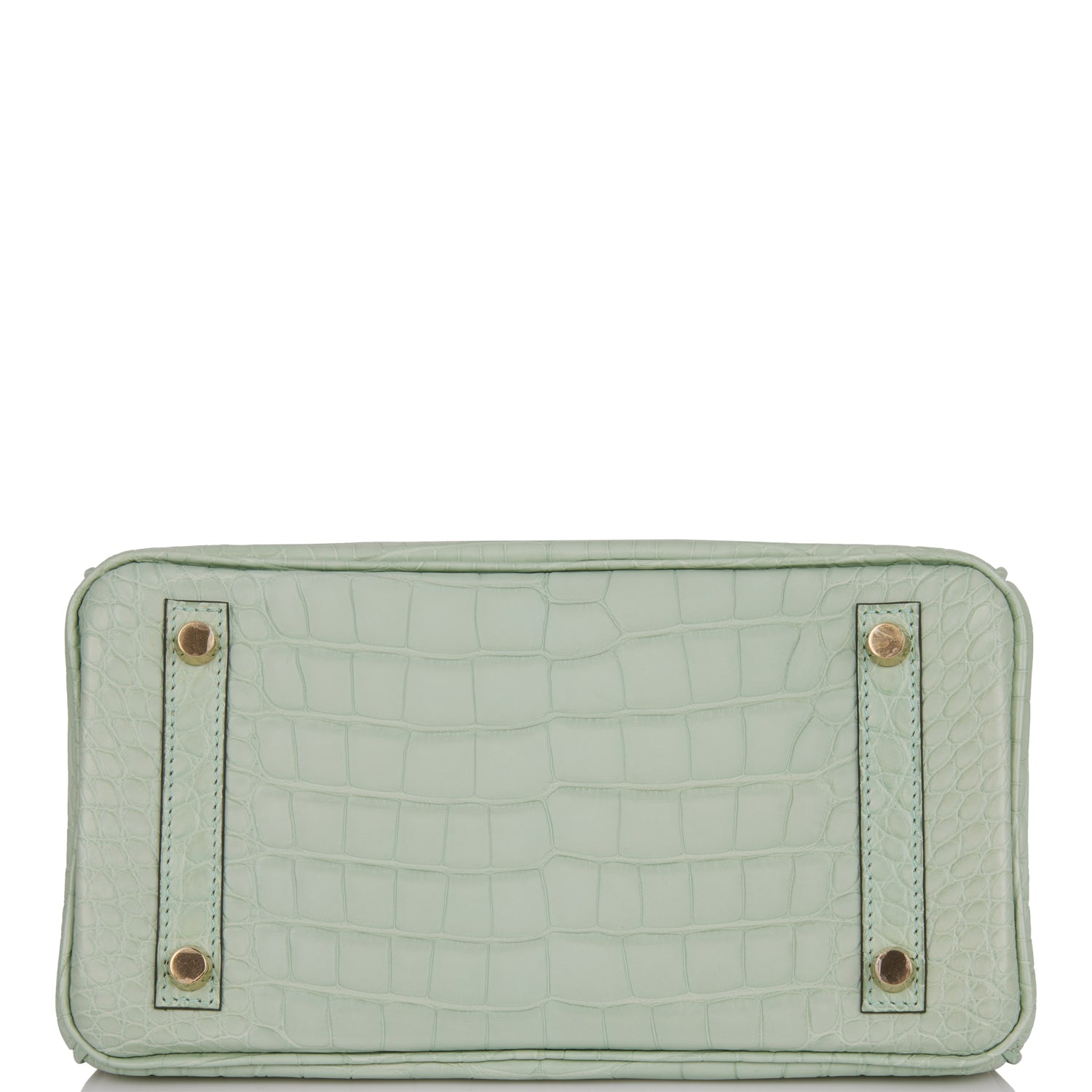 This Birkin is in Vert D'Eau matte Mississippienis alligator leather with gold hardware and has tonal stitching, front strap, two straps with center toggle closure, clochette with lock and two keys and double rolled handles.