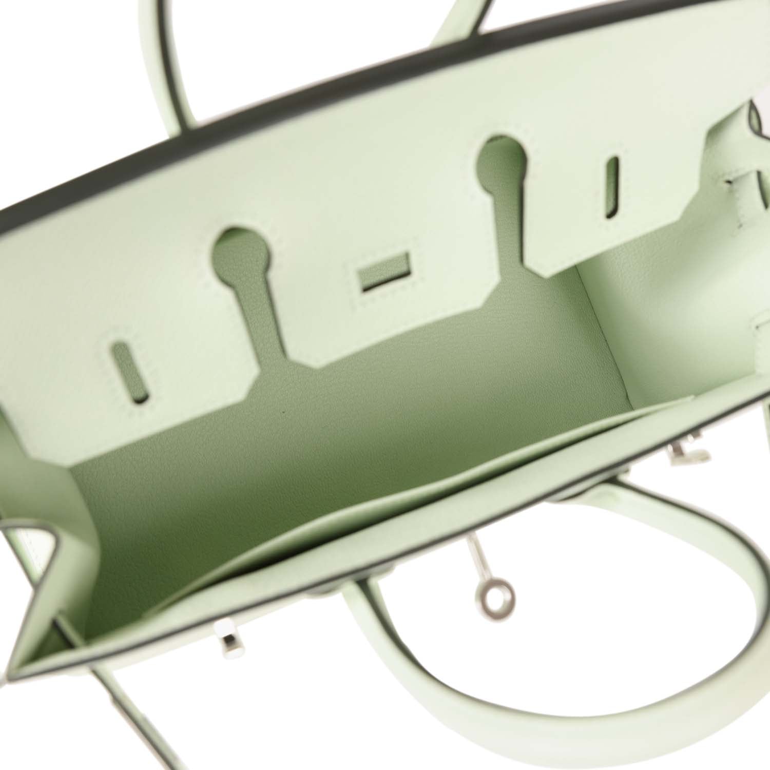This Birkin is of Vert Fizz epsom with palladium hardware and features tonal stitching, front flap, two straps with center toggle closure, clochette with lock and two keys, and double rolled handles.