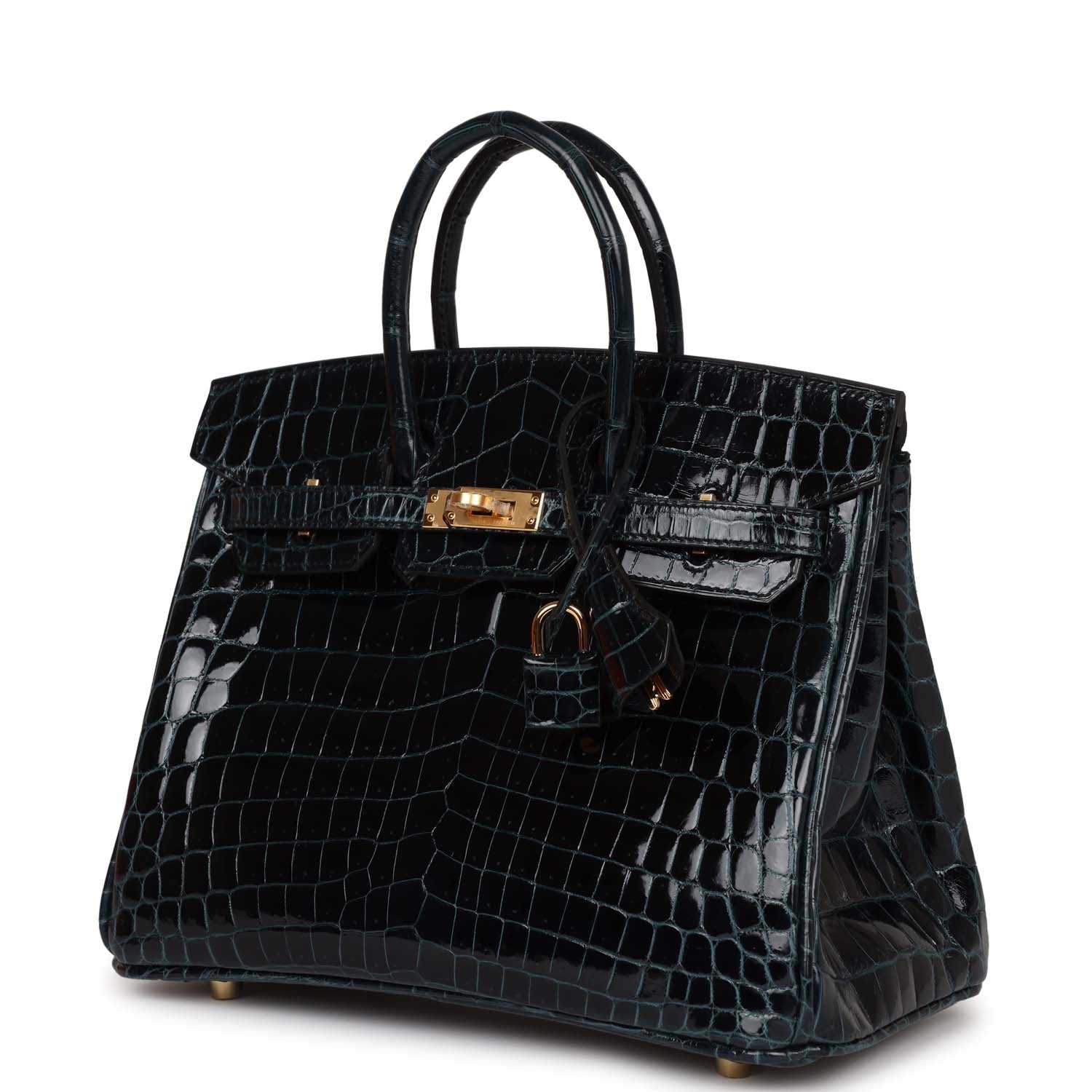 This Birkin is in Vert Rousseau Shiny Niloticus Crocodile with gold hardware, tonal stitching, front flap with two straps, front toggle closure, clochette with lock and two keys, and double rolled handles