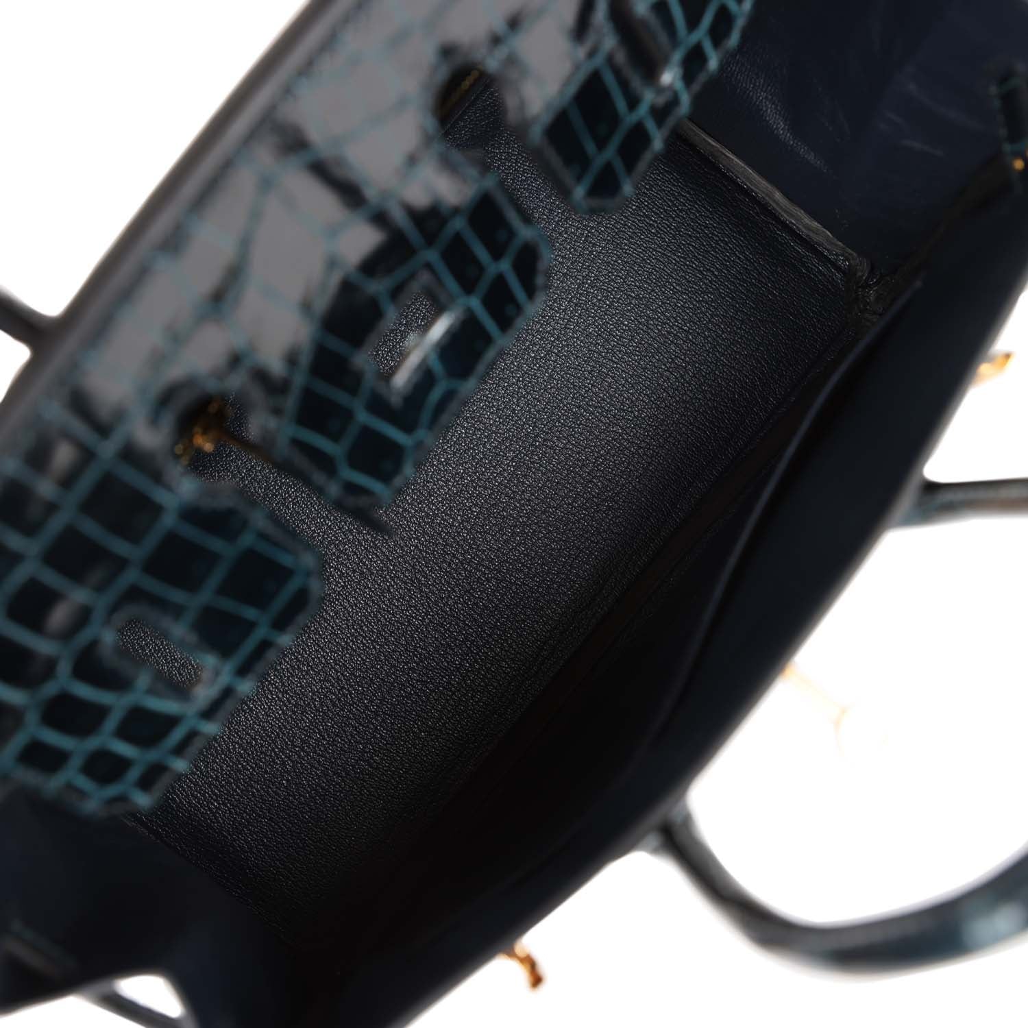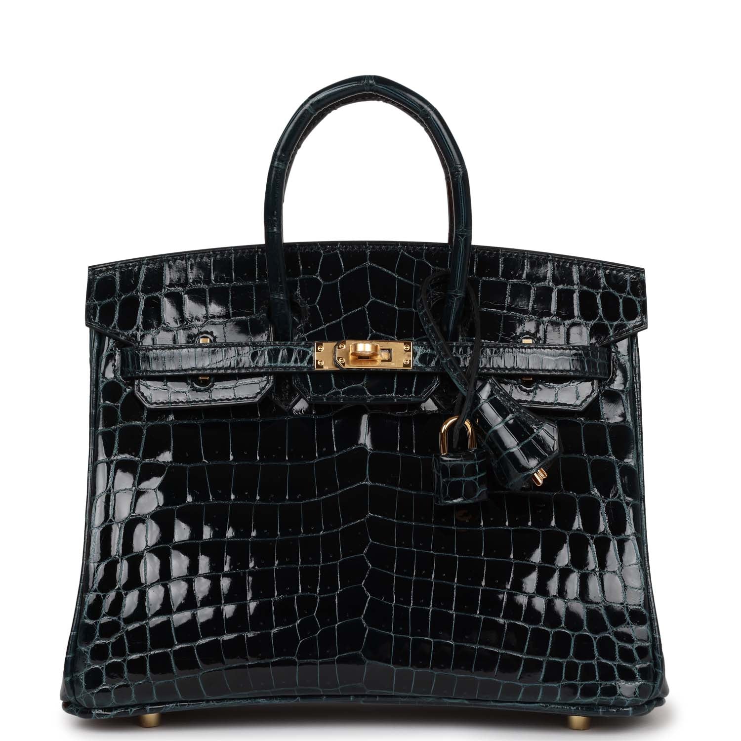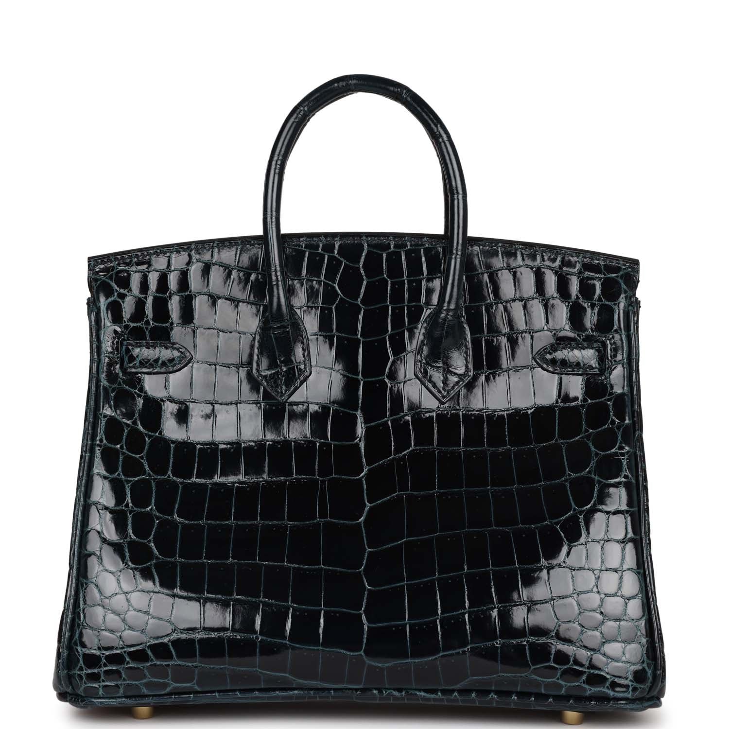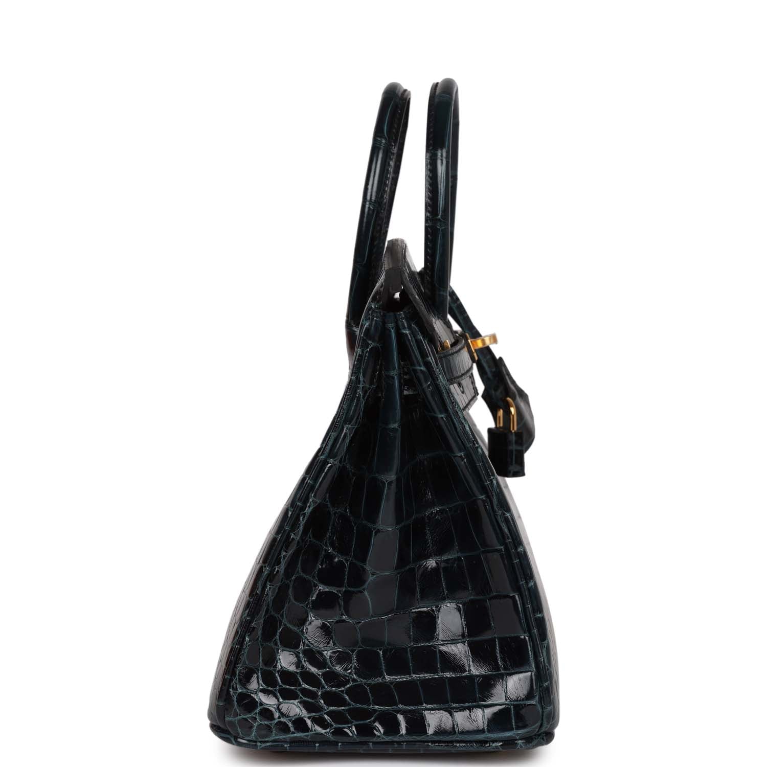 This Birkin is in Vert Rousseau Shiny Niloticus Crocodile with gold hardware, tonal stitching, front flap with two straps, front toggle closure, clochette with lock and two keys, and double rolled handles