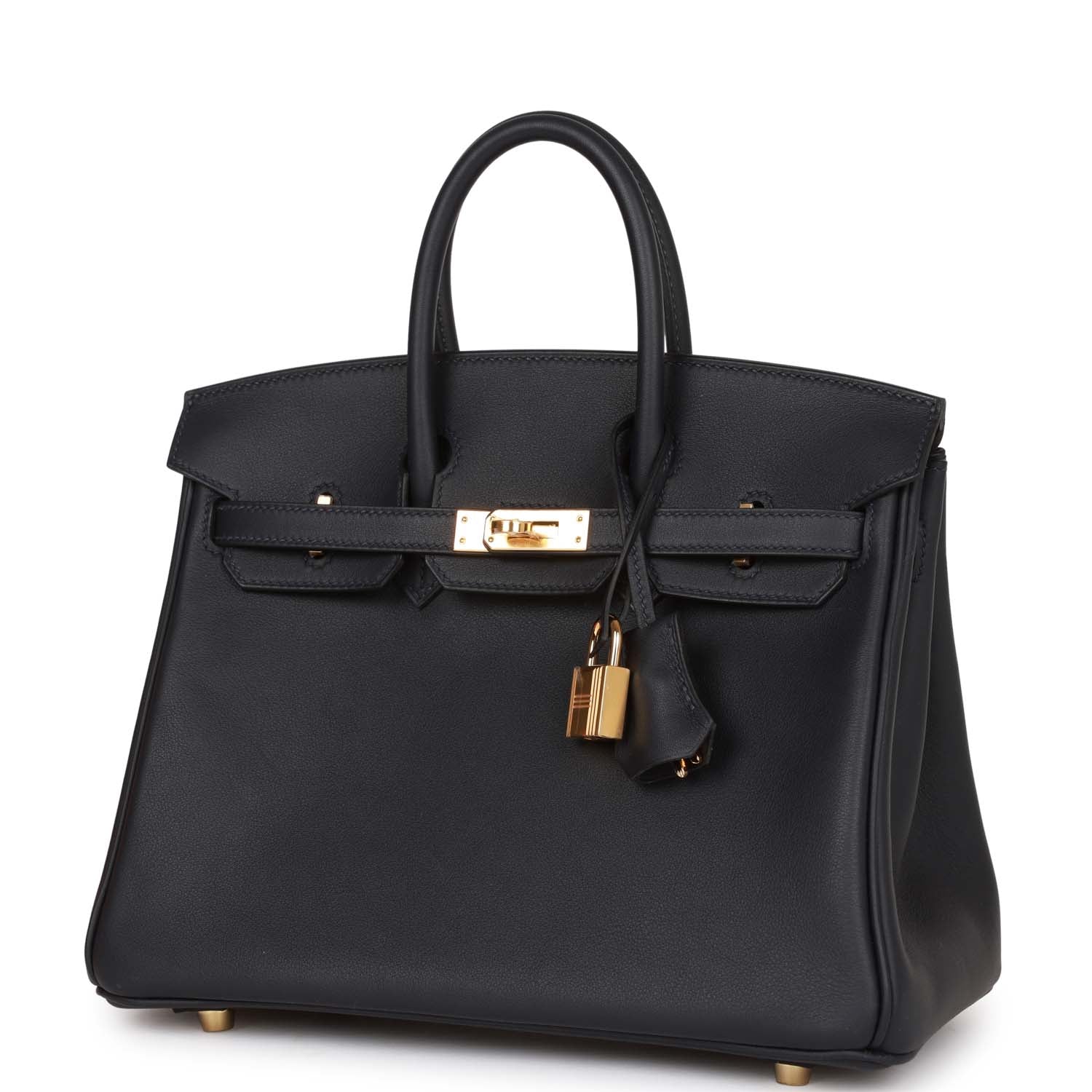 This Hermes Birkin 25 is in Caban swift leather with Gold hardware, tonal stitching, front flap with two straps, front toggle closure, clochette with lock and two keys, and double rolled handles.