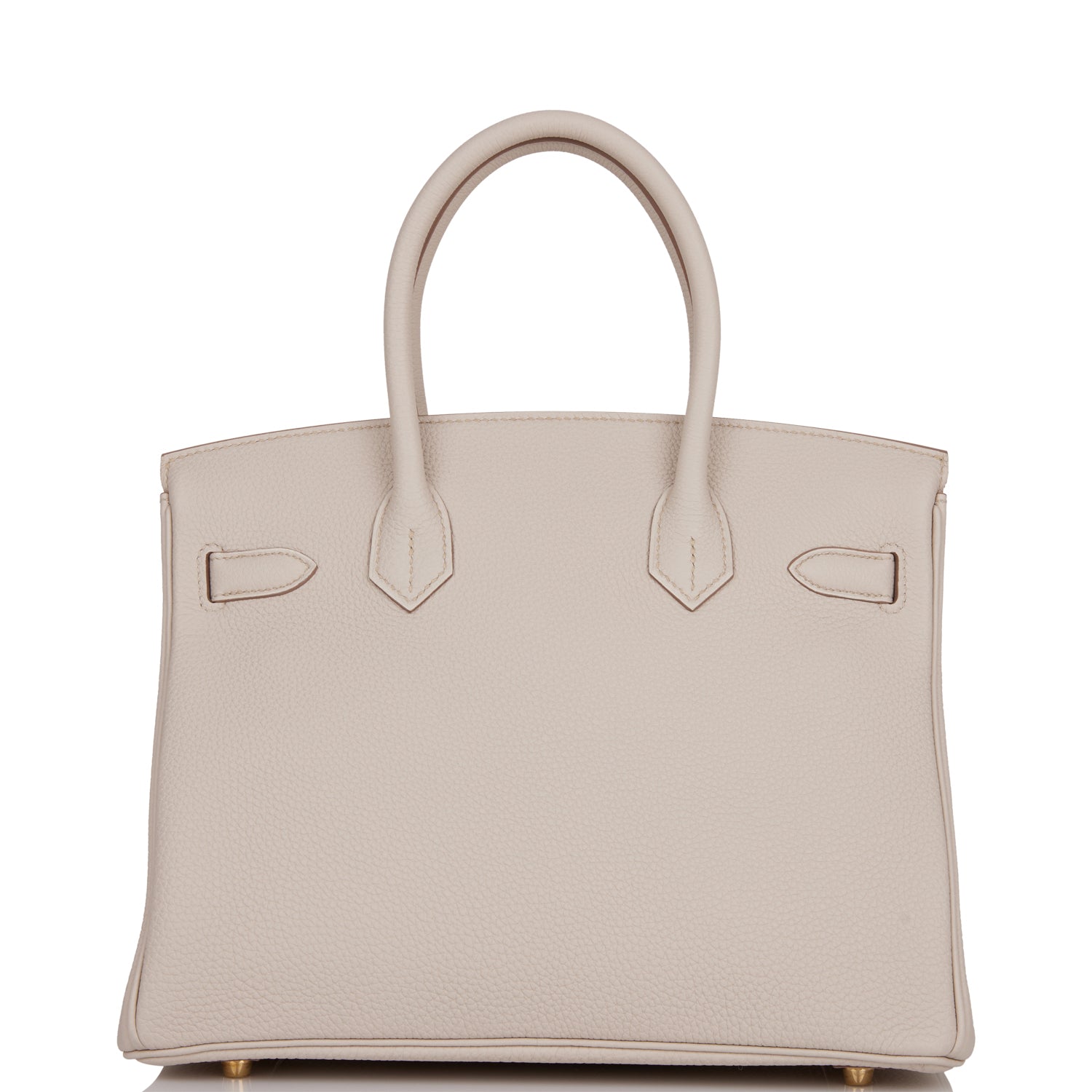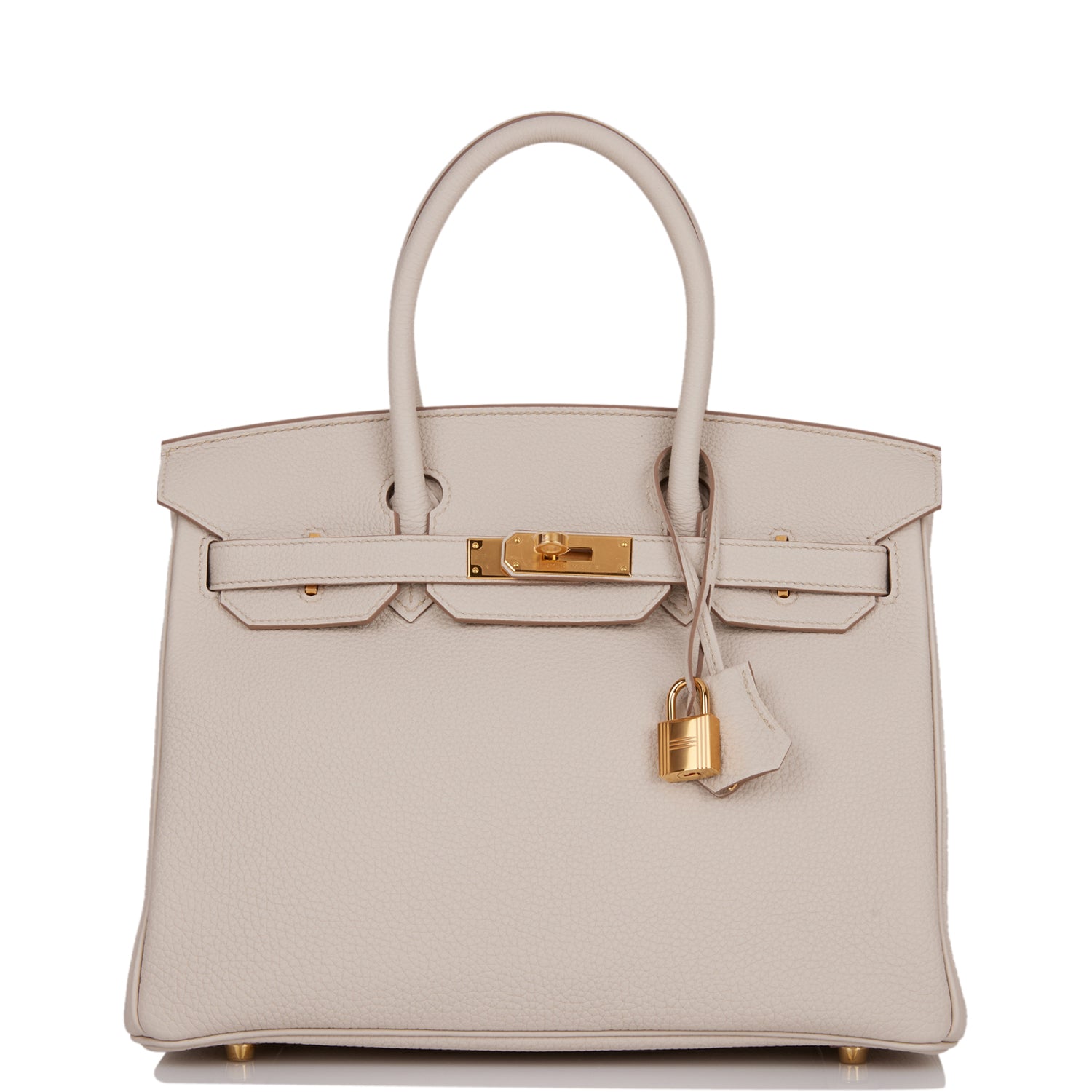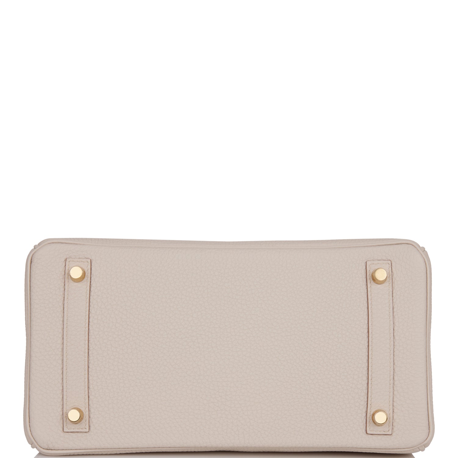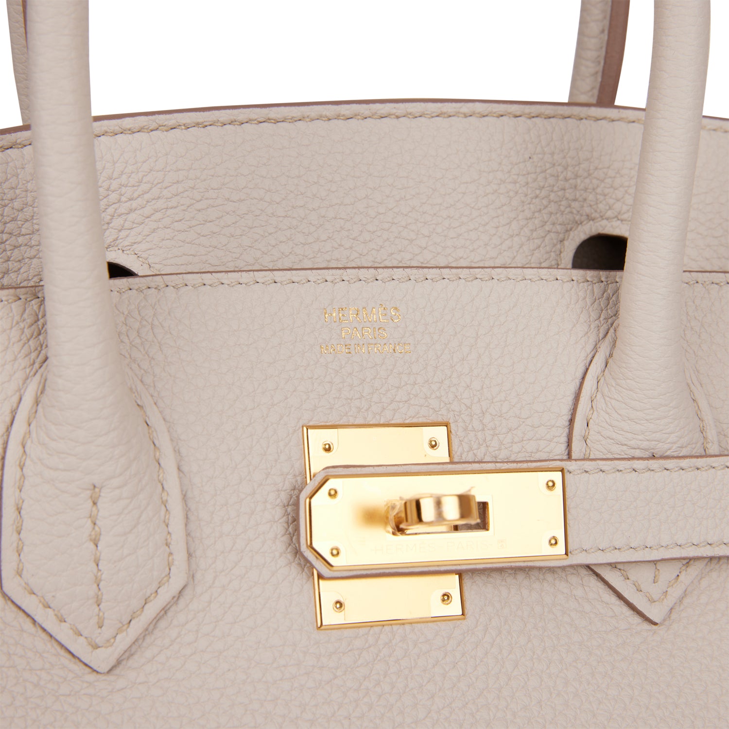 This Birkin is in Beton togo leather with gold hardware and has tonal stitching, front flap, two straps with center toggle closure, clochette with lock and two keys, and double rolled handles.