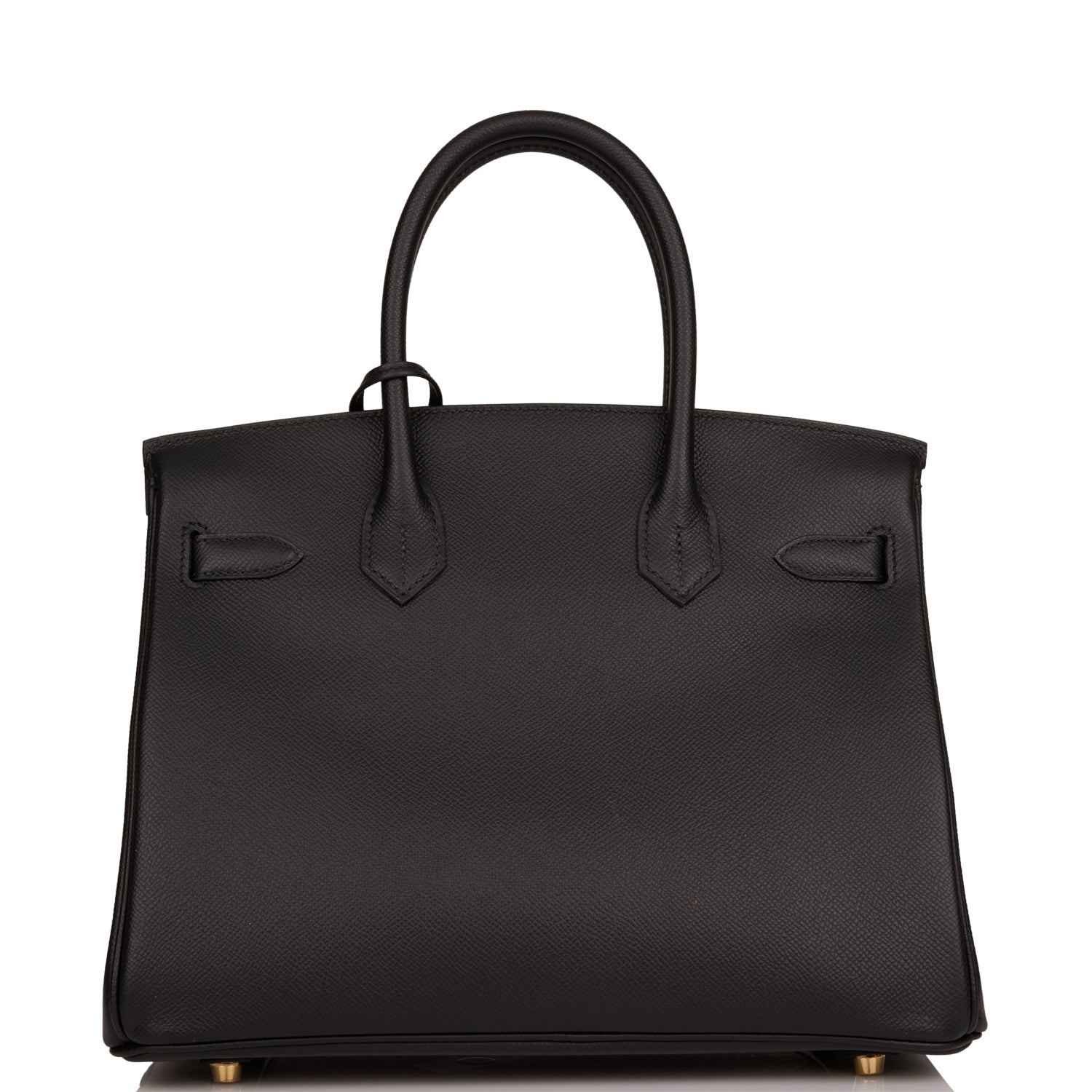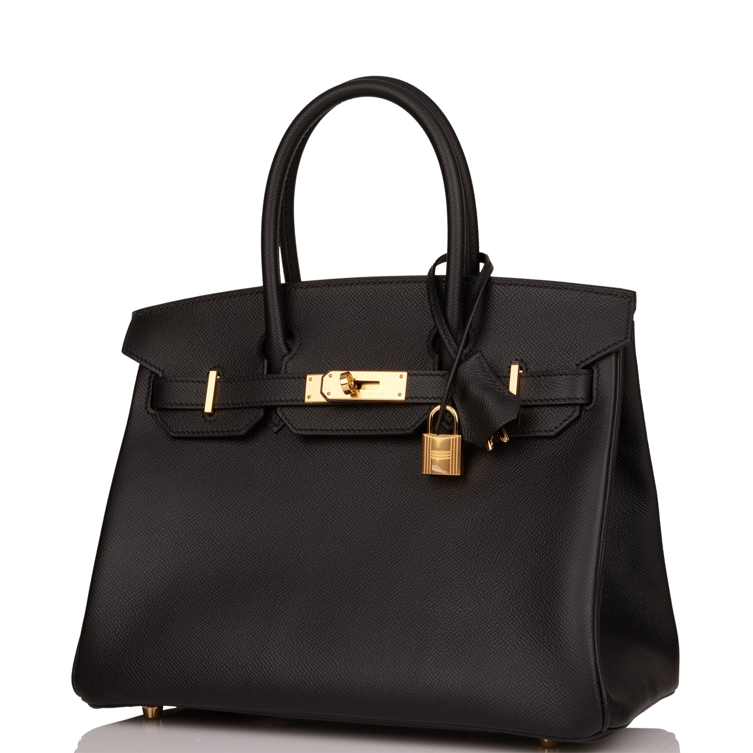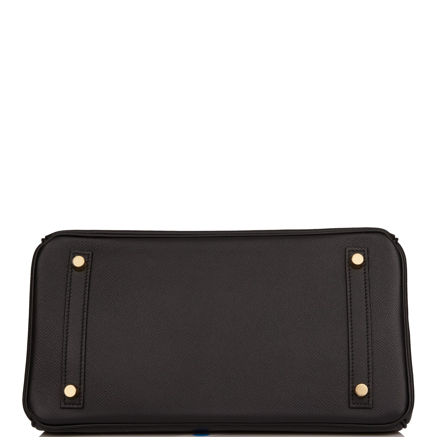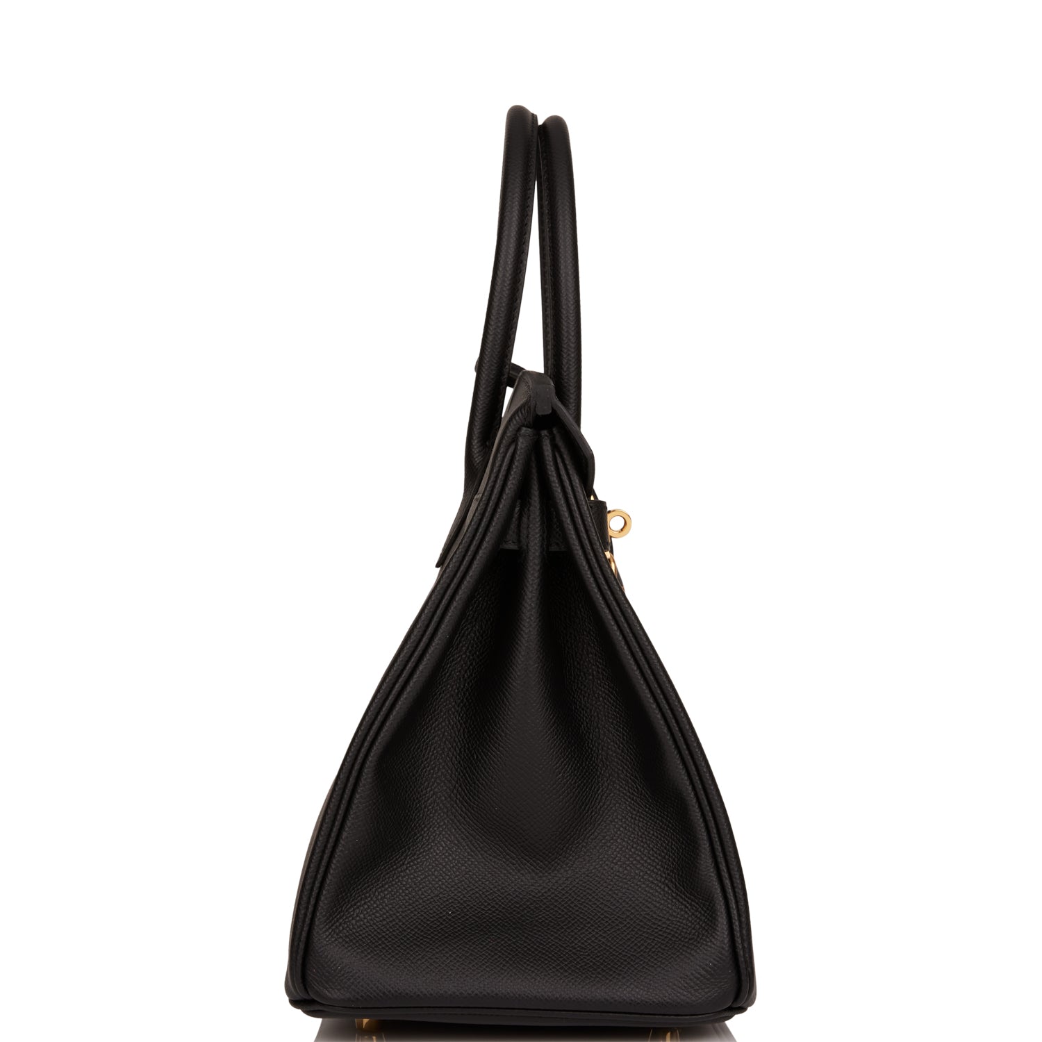 This Birkin is in Black epsom leather with gold hardware and has tonal stitching, front flap, two straps with center toggle closure, clochette with lock and two keys, and double rolled handles.