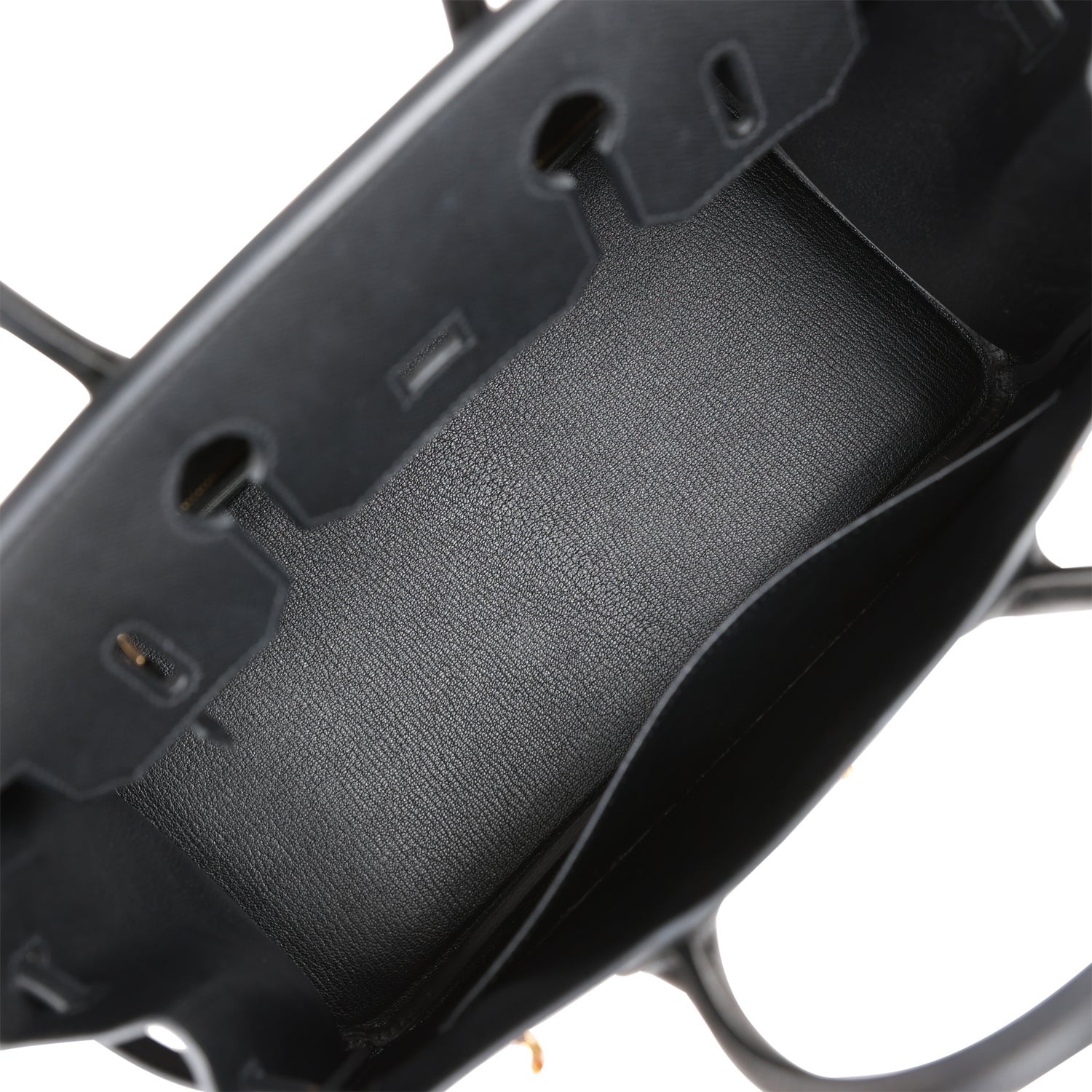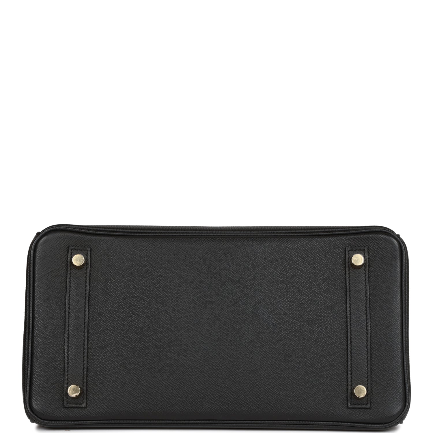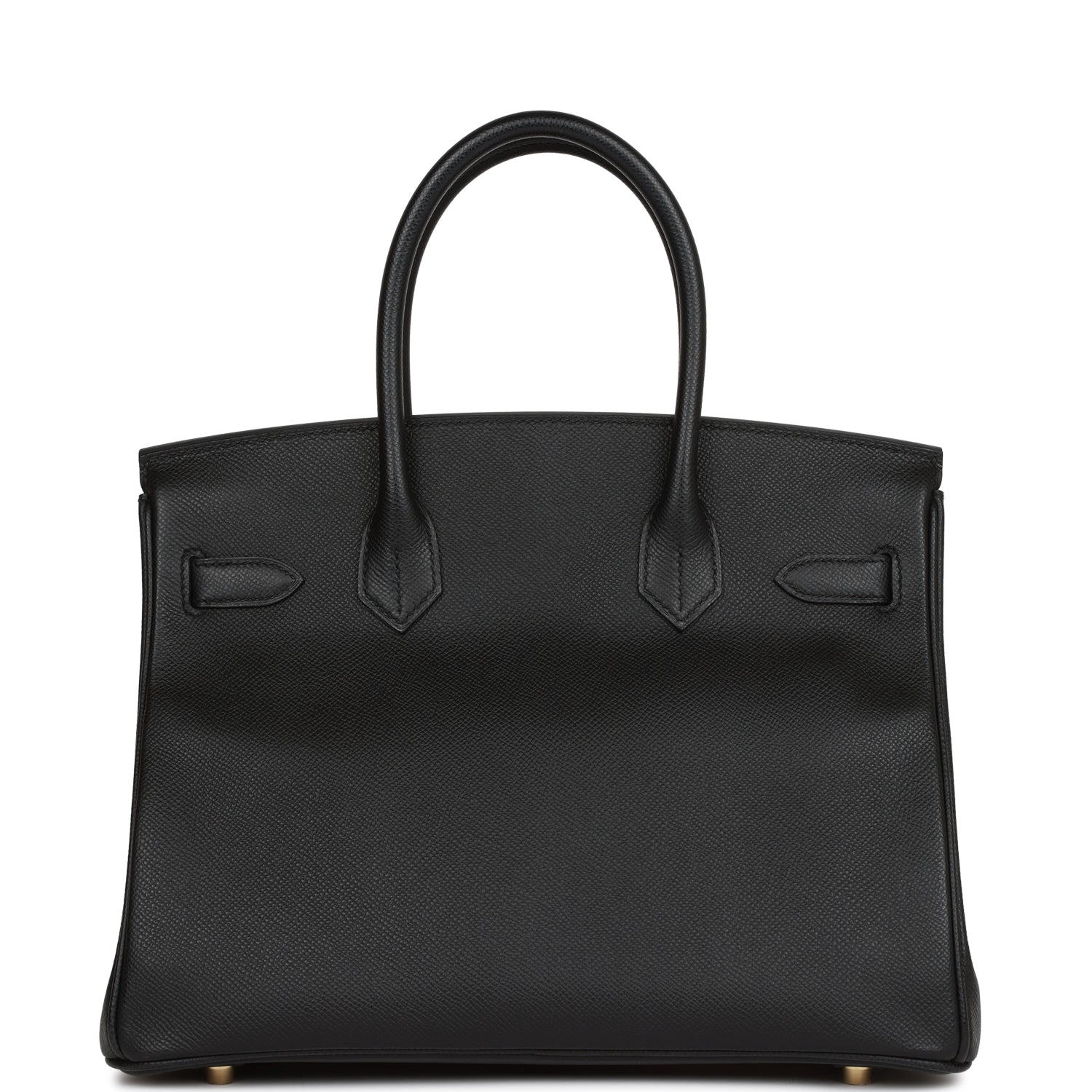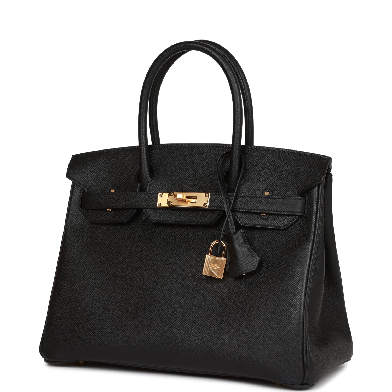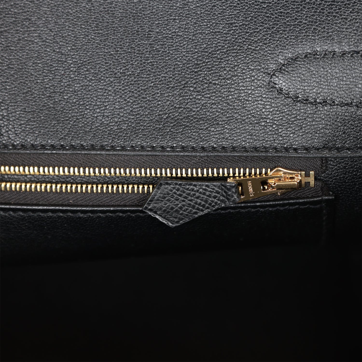 This Birkin is in Black epsom leather with gold hardware and has tonal stitching, front flap, two straps with center toggle closure, clochette with lock and two keys, and double rolled handles.