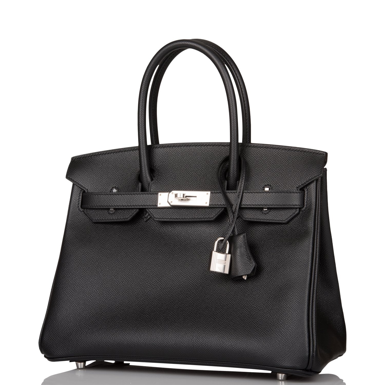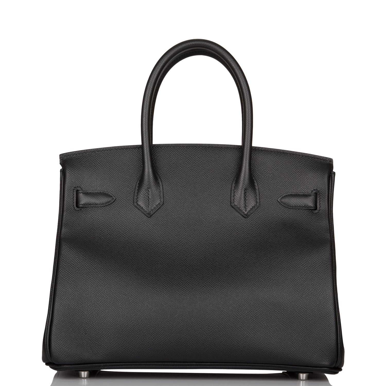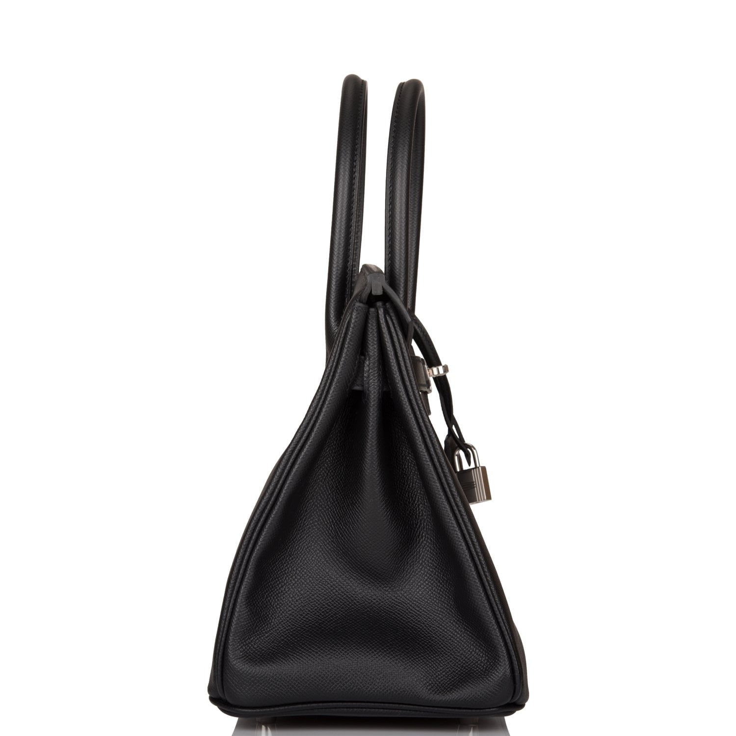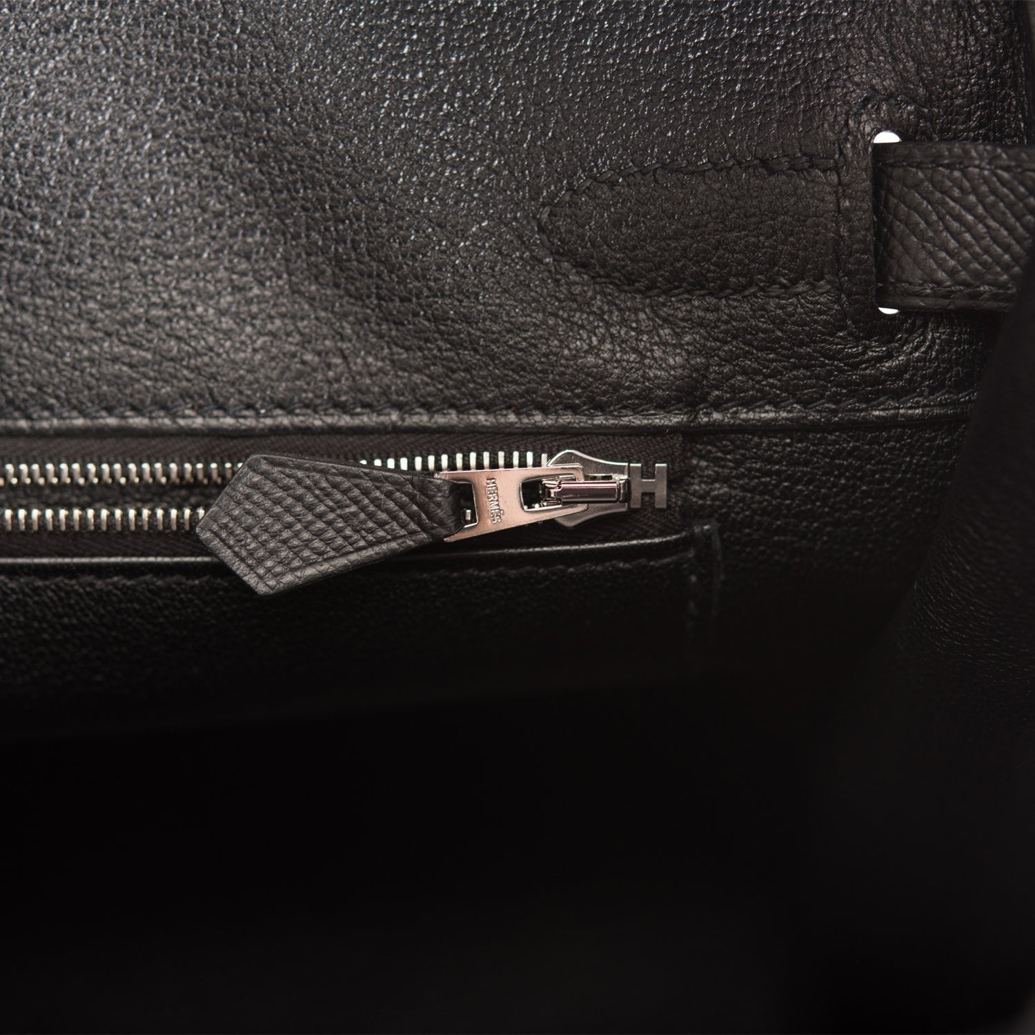 This Birkin is in Black epsom leather with palladium hardware and has tonal stitching, front flap, two straps with center toggle closure, clochette with lock and two keys, and double rolled handles.