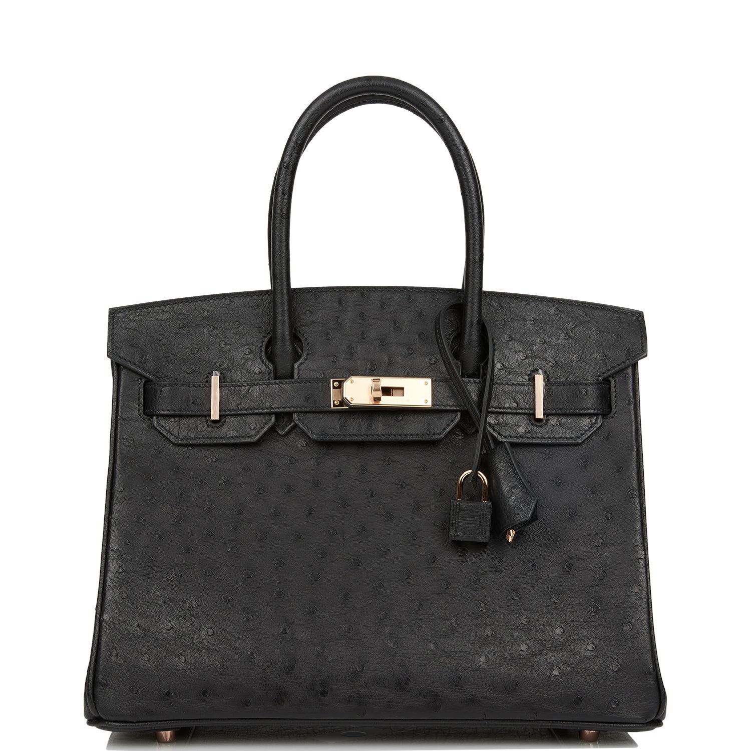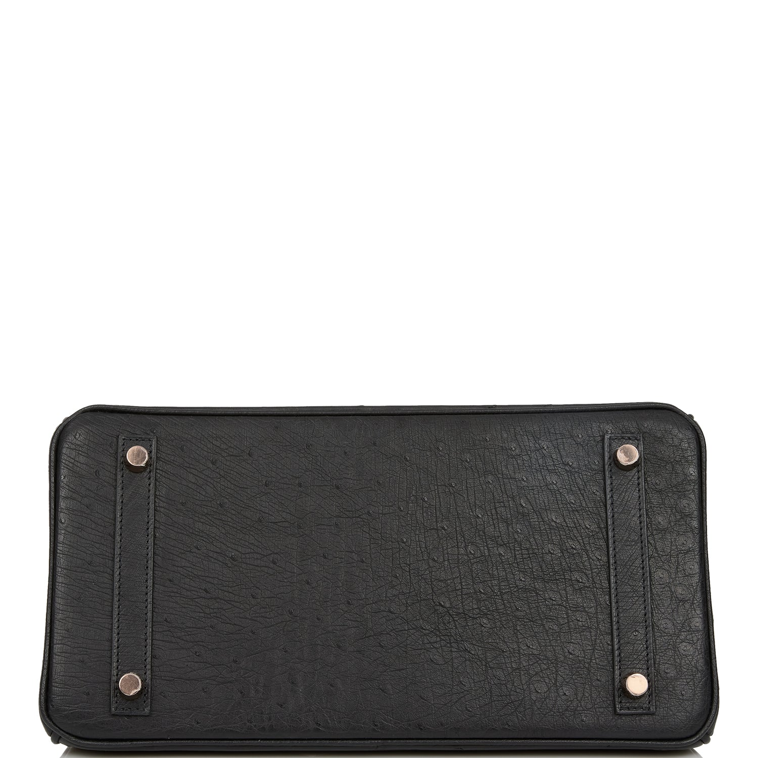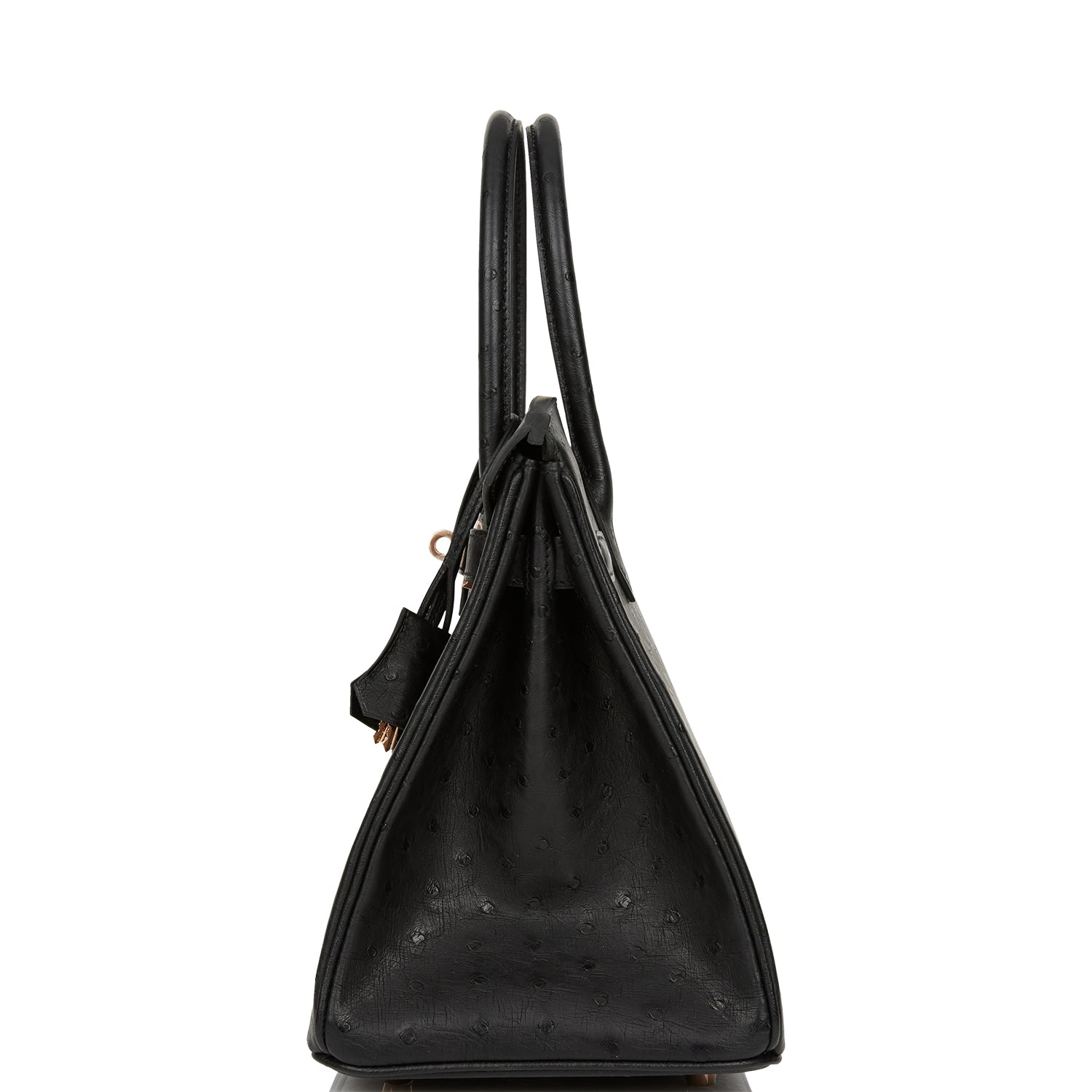 This Birkin is in black ostrich with rose gold hardware and features tonal stitching, front flap, two straps with center toggle closure, clochette with lock and two keys, and double rolled handles.
