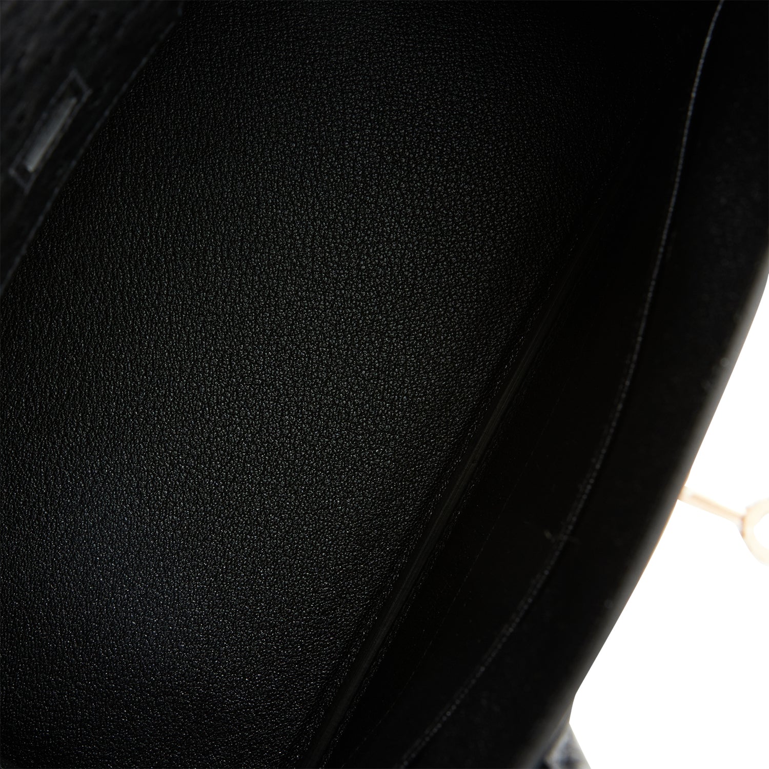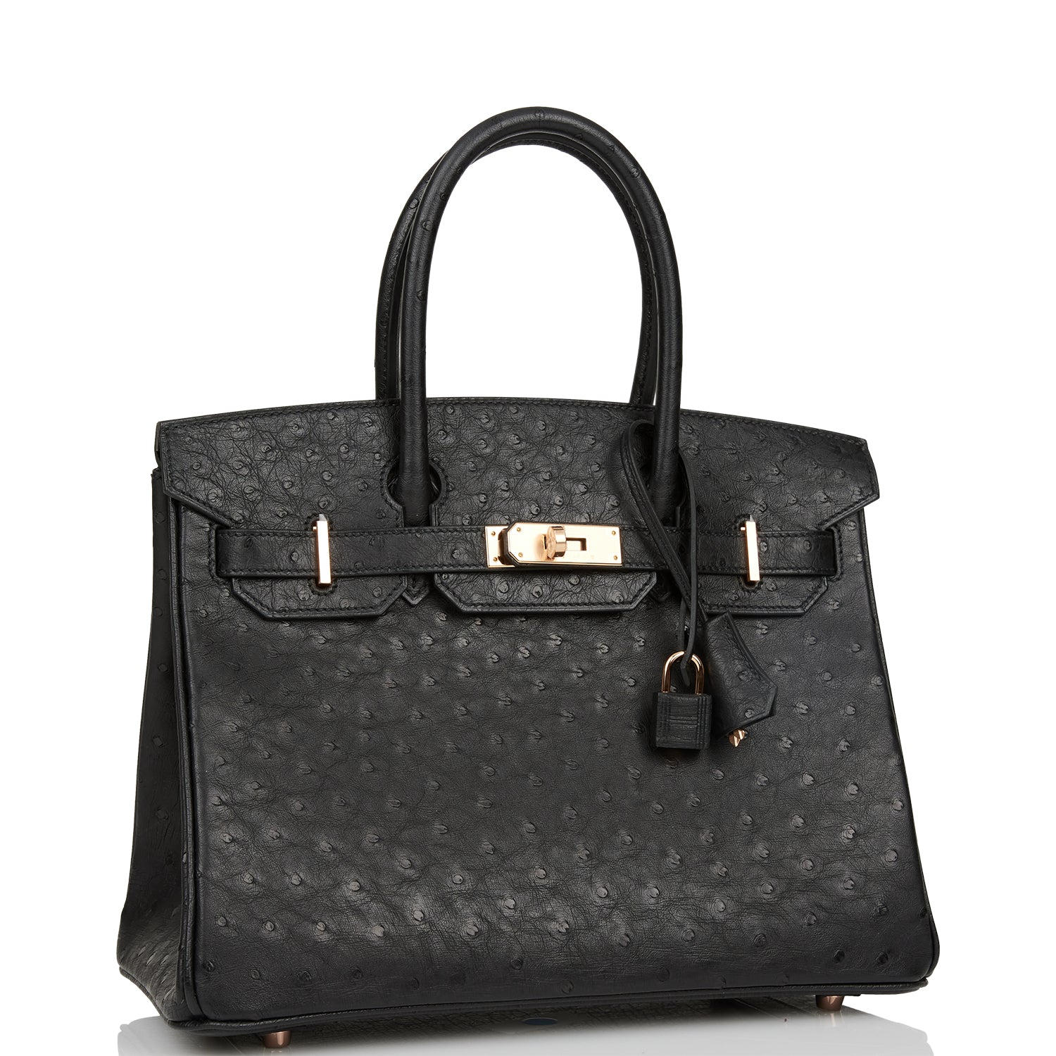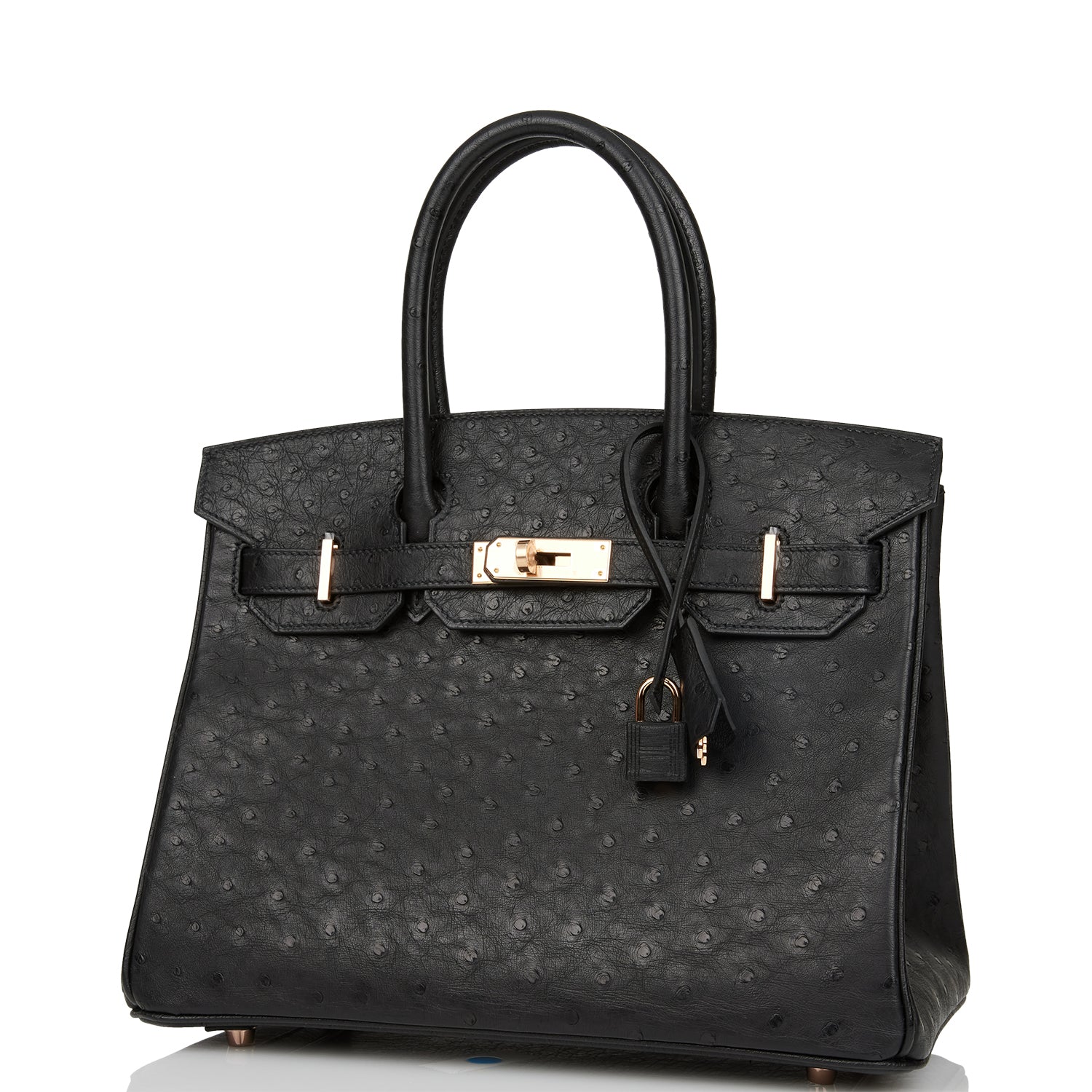 This Birkin is in black ostrich with rose gold hardware and features tonal stitching, front flap, two straps with center toggle closure, clochette with lock and two keys, and double rolled handles.