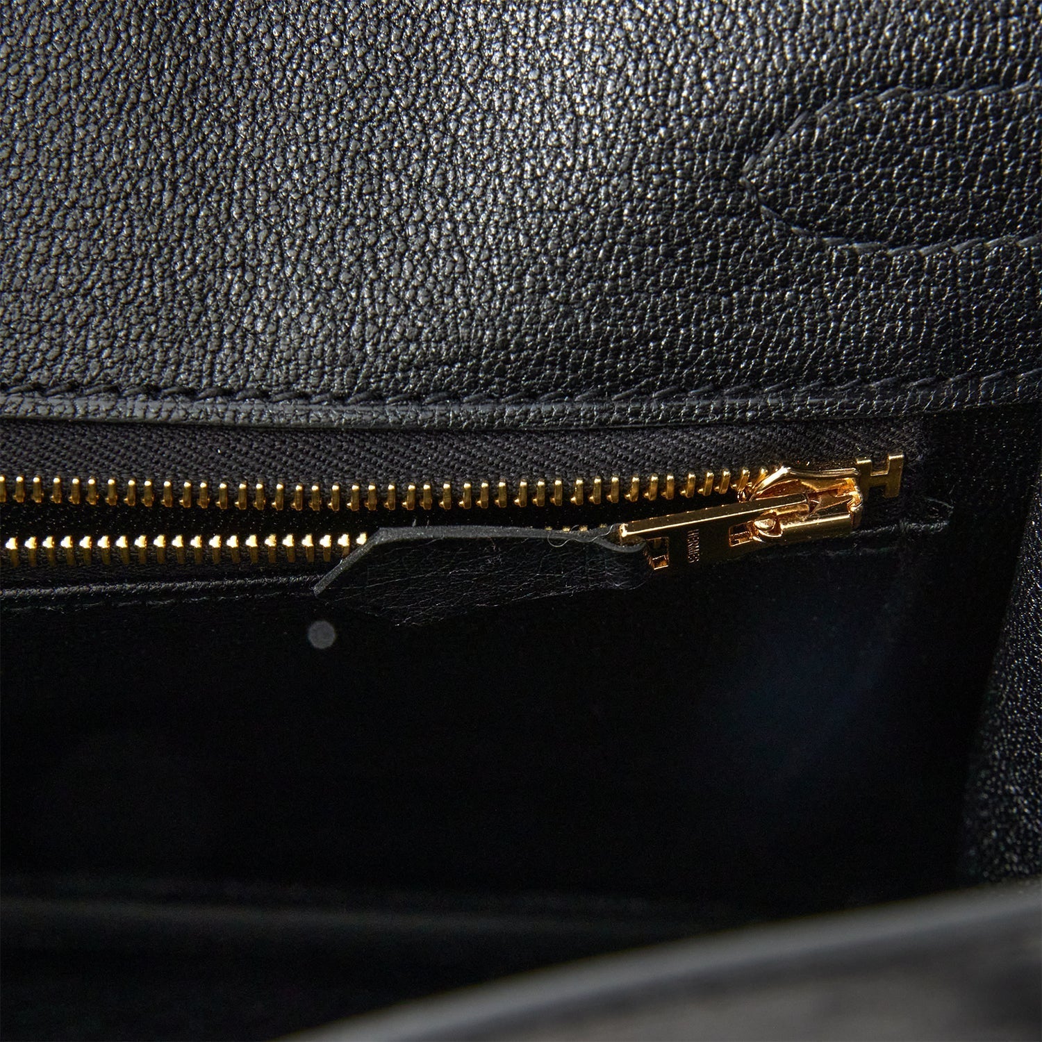 The interior is lined with black chevre and has a zip pocket with an Hermes engraved zipper pull and an open pocket on the opposite side.