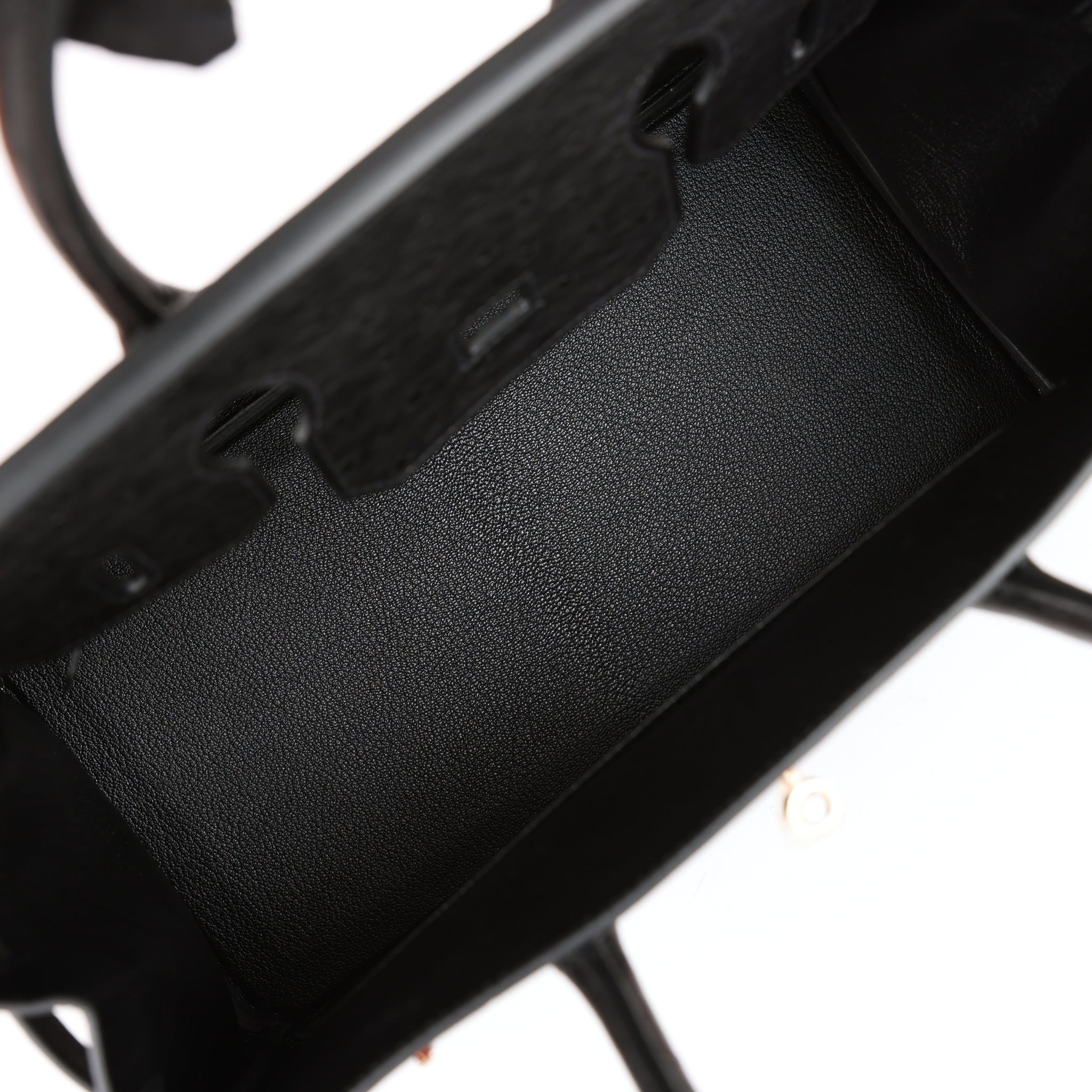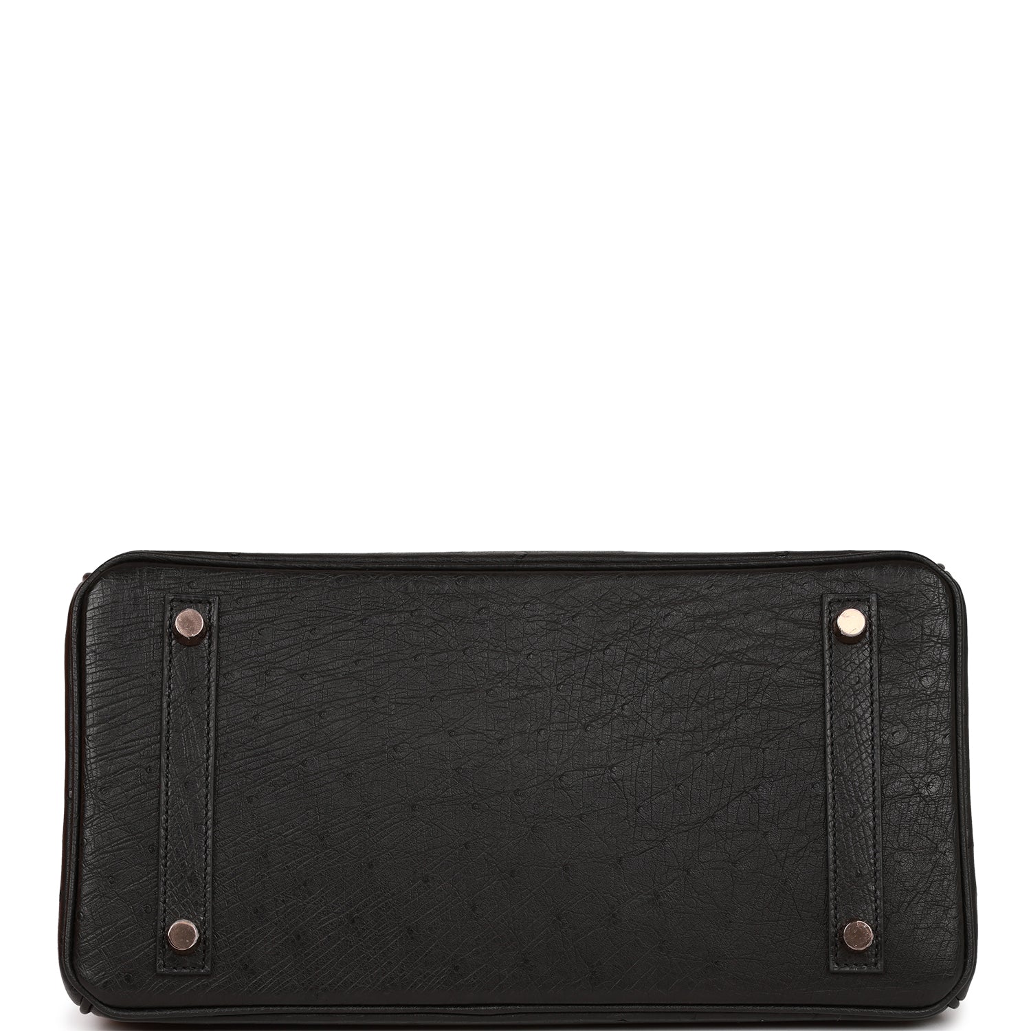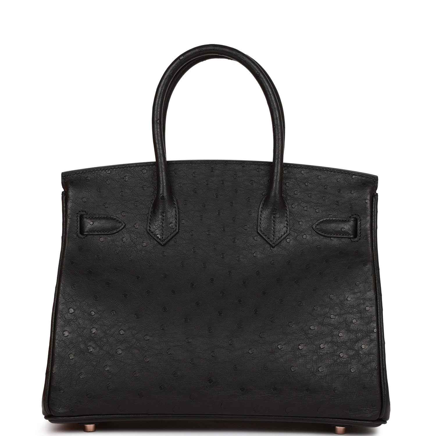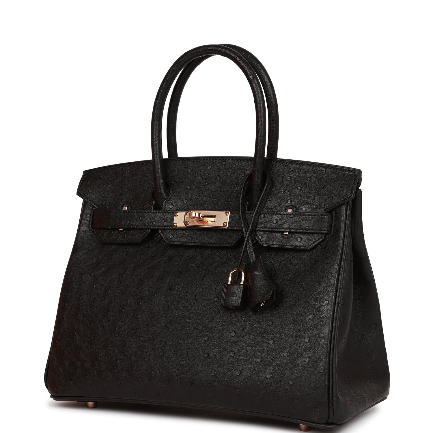 This Birkin is in black ostrich with rose gold hardware and features tonal stitching, front flap, two straps with center toggle closure, clochette with lock and two keys, and double rolled handles.