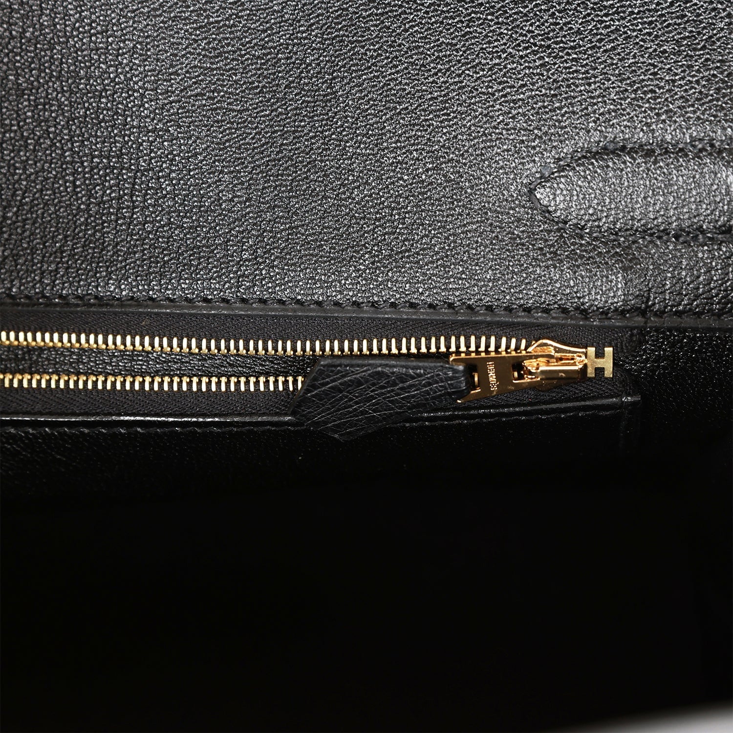 The interior is lined with black chevre and has a zip pocket with an Hermes engraved zipper pull and an open pocket on the opposite side.