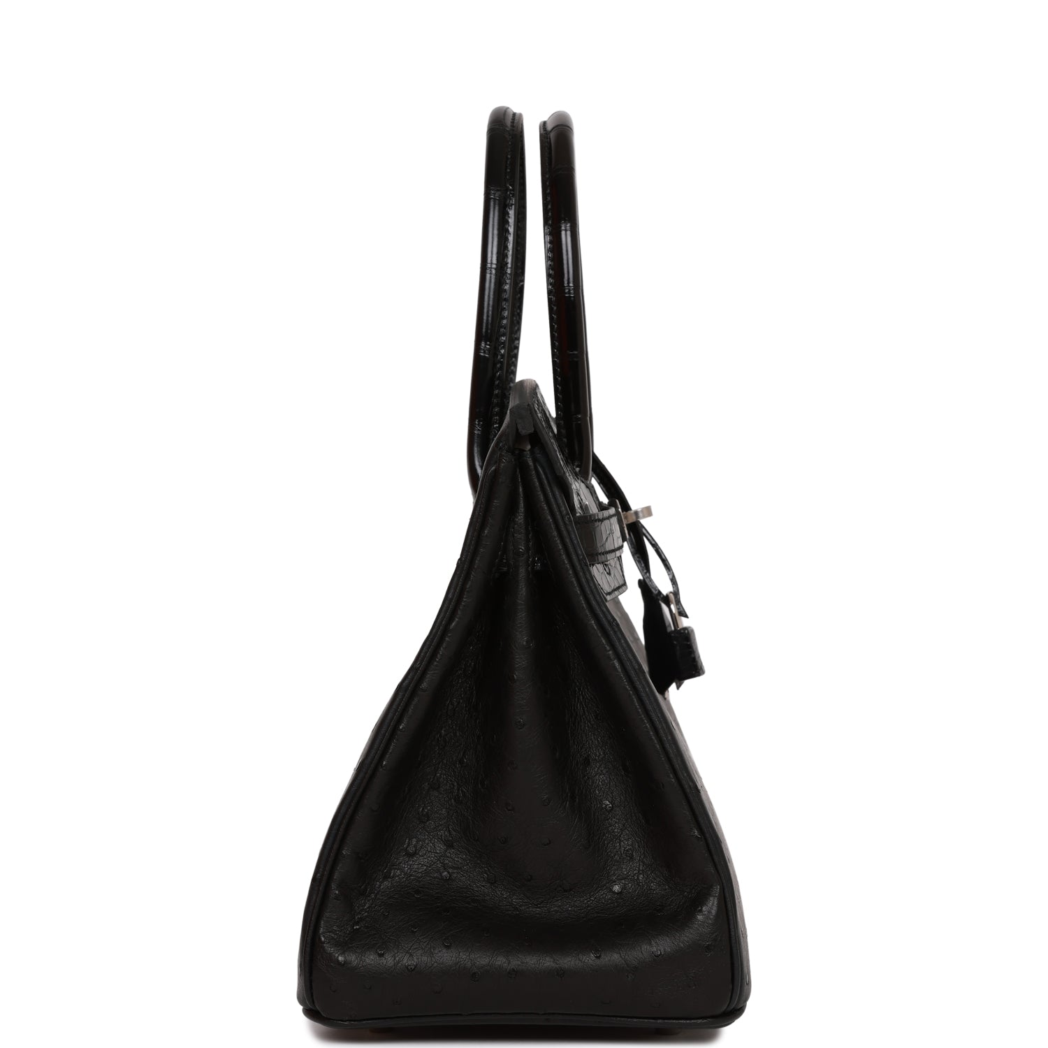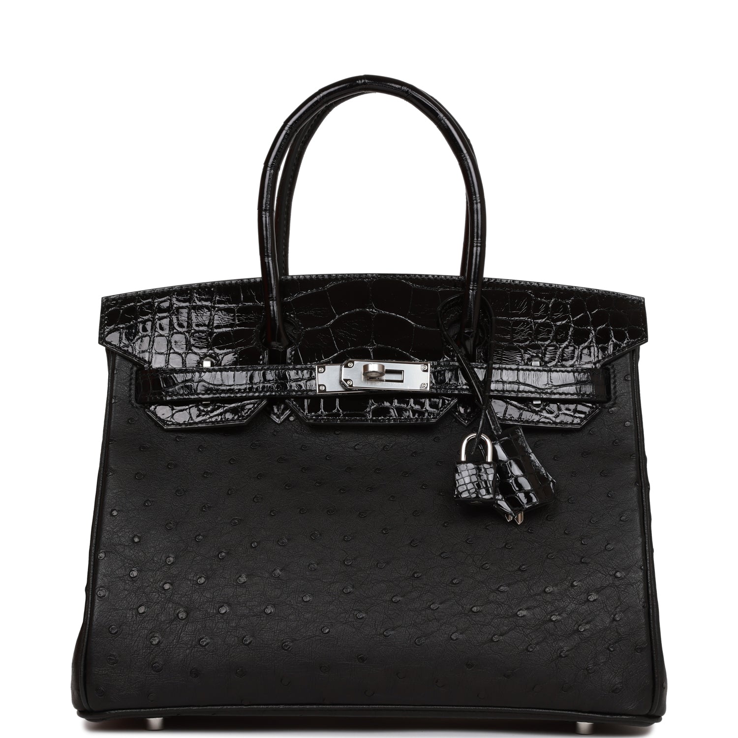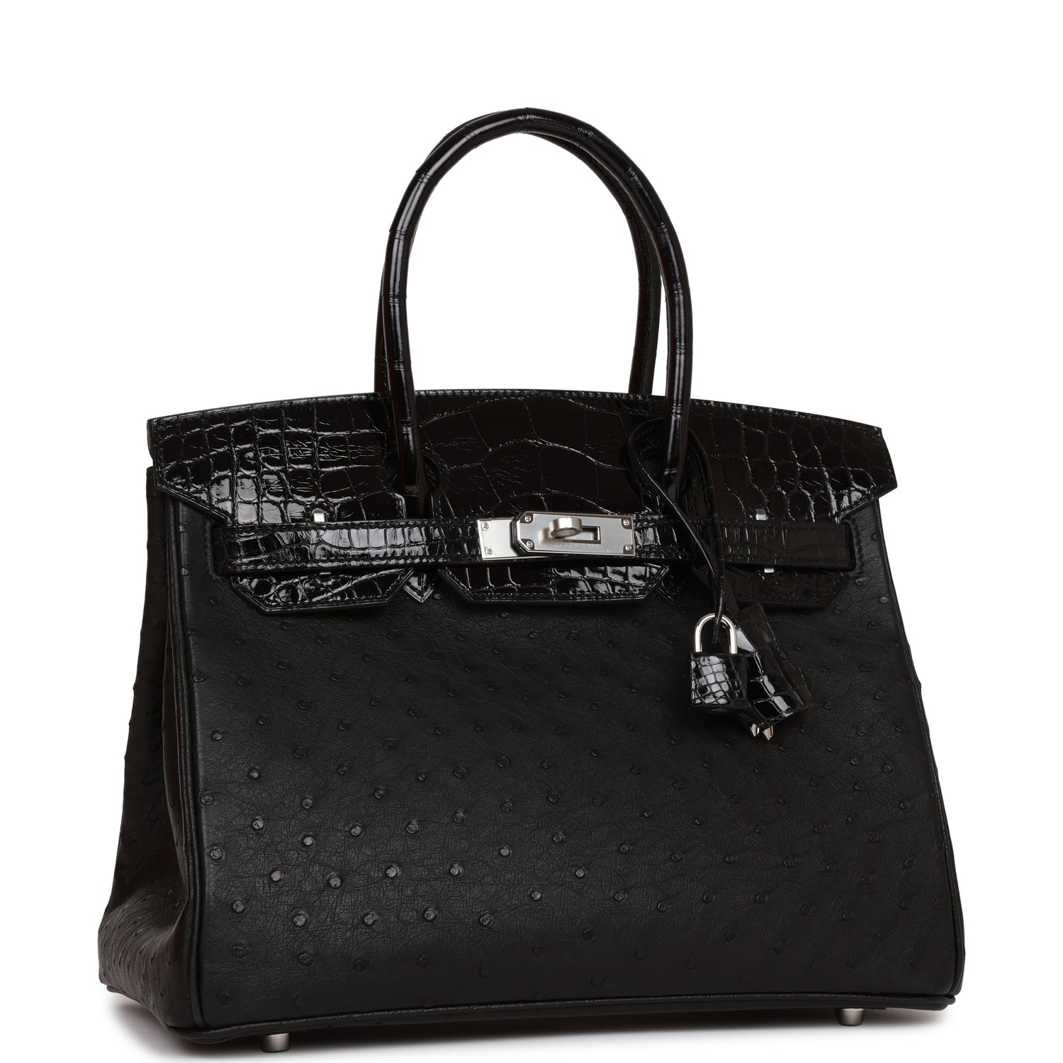This Birkin "Touch" is in Black shiny alligator and ostrich with palladium hardware and has tonal stitching, two straps with front toggle closure, clochette with lock and two keys and double rolled crocodile handles.