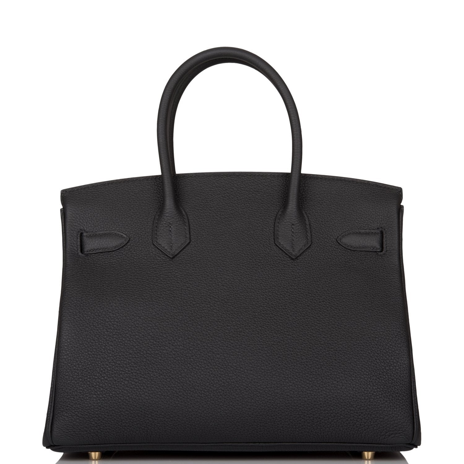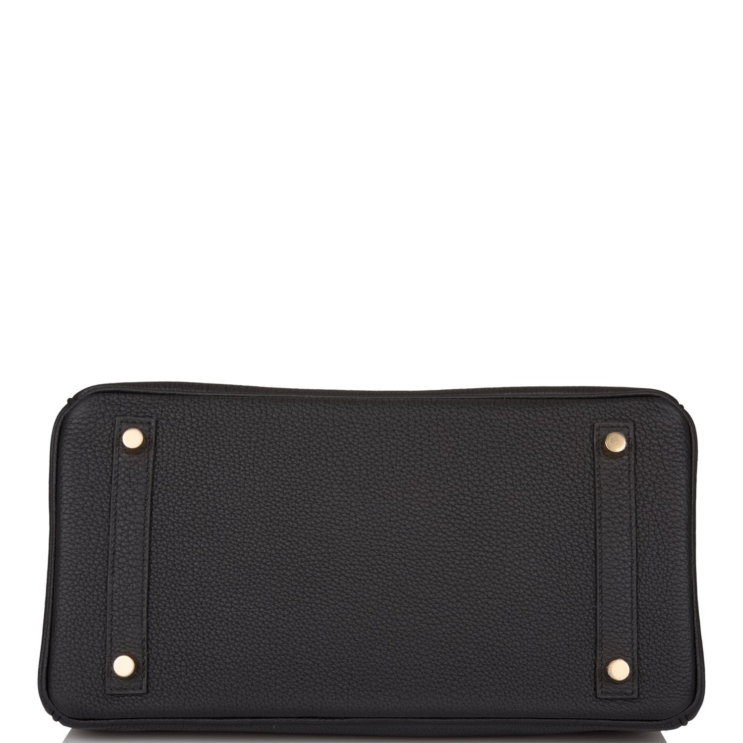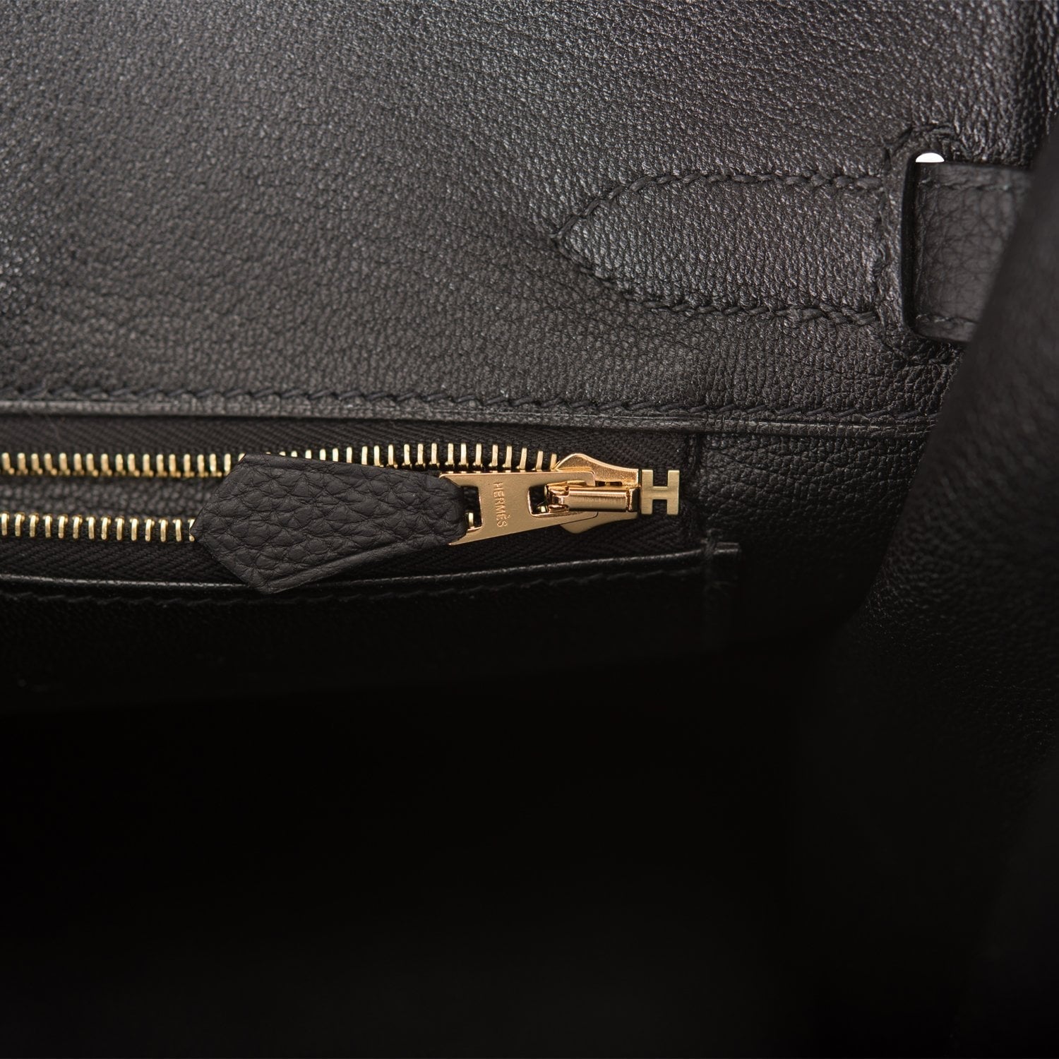 This Birkin is in Black togo leather with gold hardware and has tonal stitching, front flap, two straps with center toggle closure, clochette with lock and two keys, and double rolled handles.