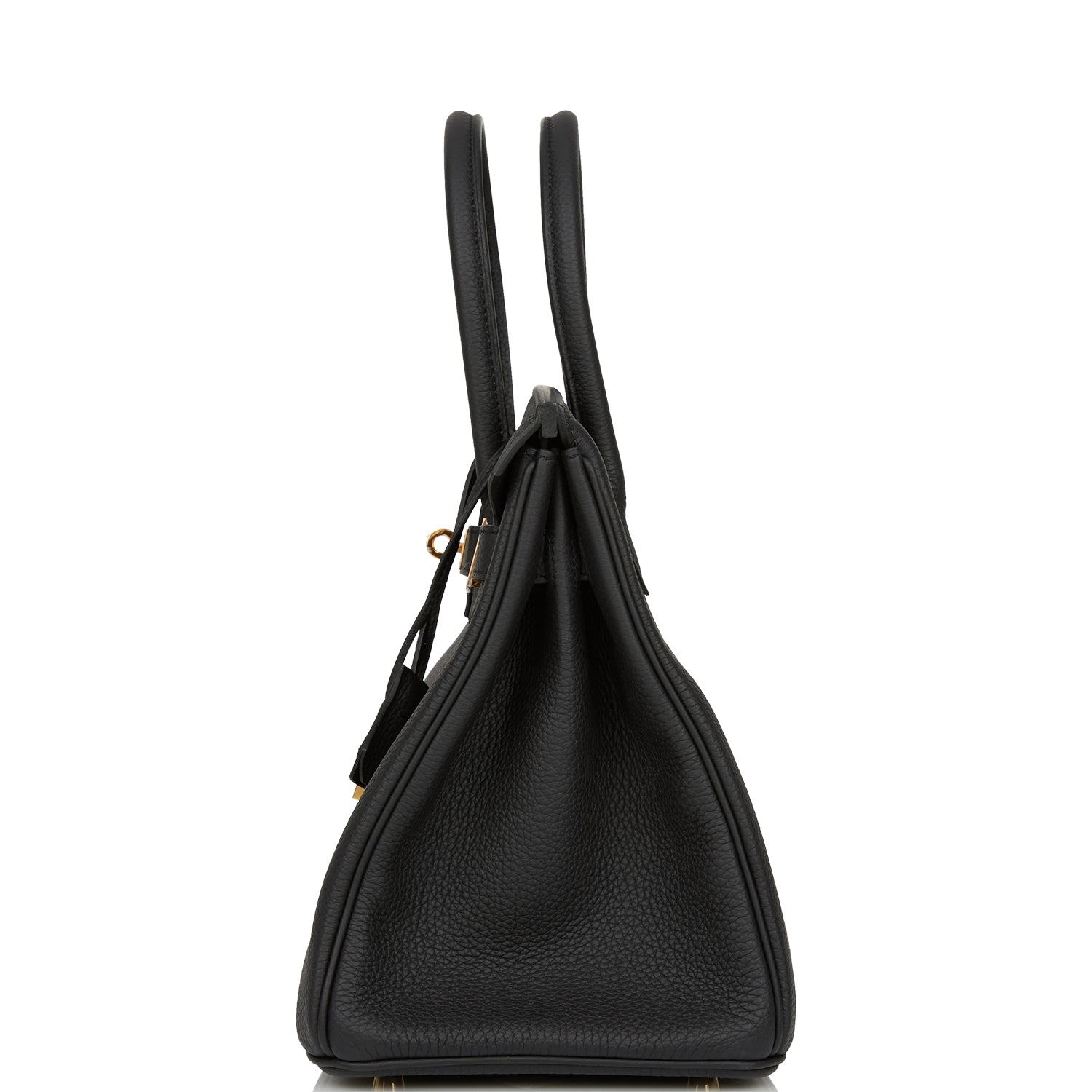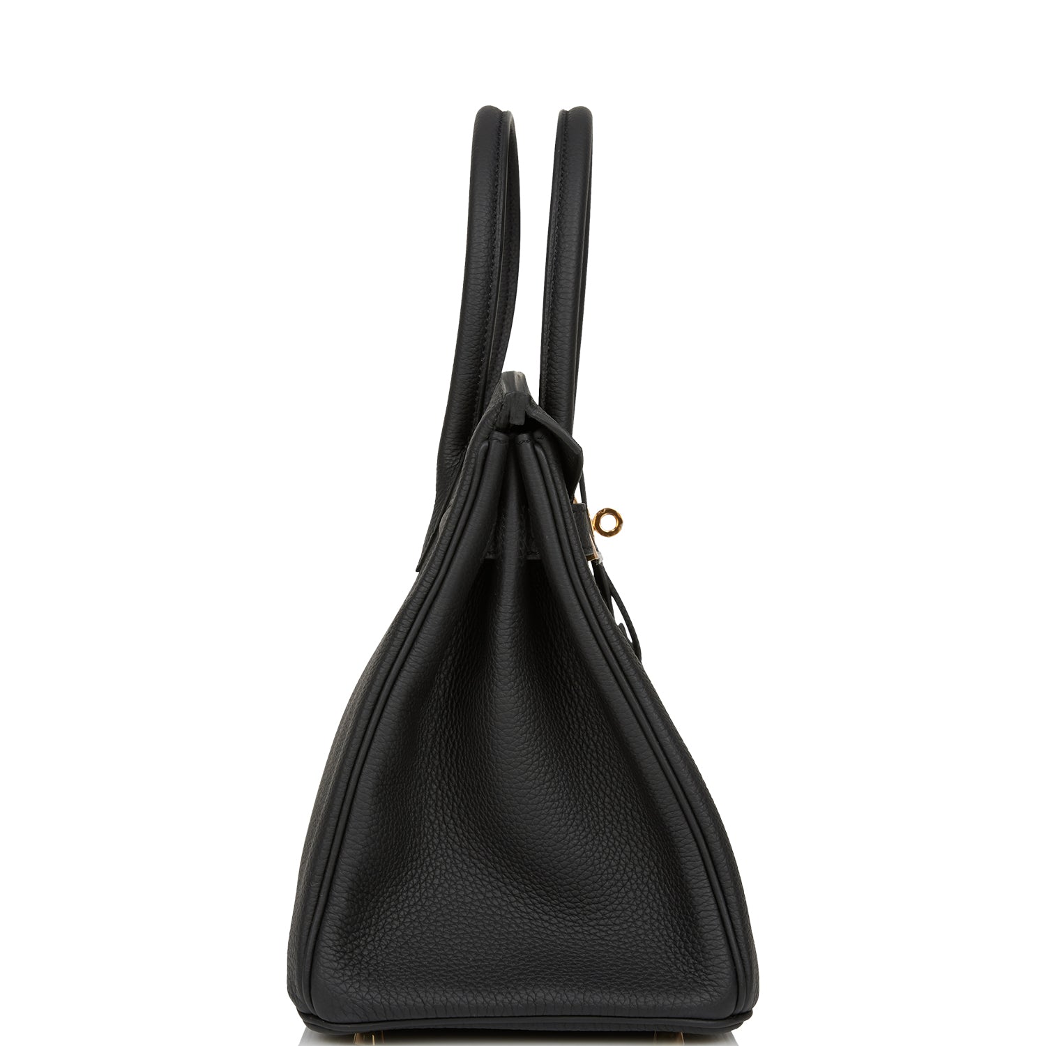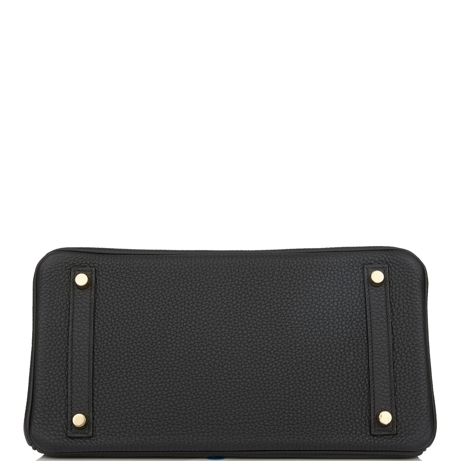 This Birkin is in Black togo leather with gold hardware and has tonal stitching, front flap, two straps with center toggle closure, clochette with lock and two keys, and double rolled handles.