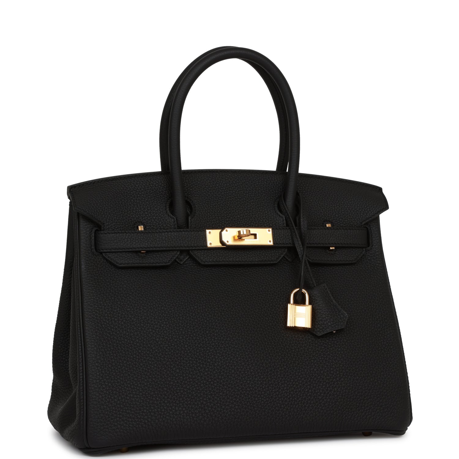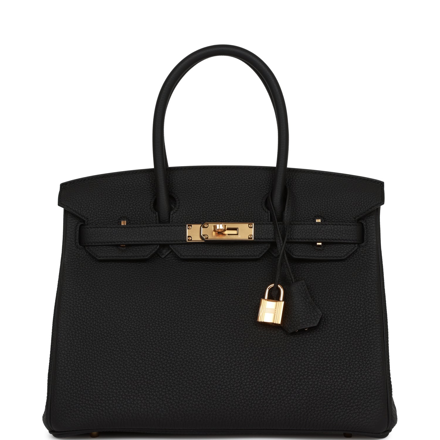 This Birkin is in Black togo leather with gold hardware and has tonal stitching, front flap, two straps with center toggle closure, clochette with lock and two keys, and double rolled handles.