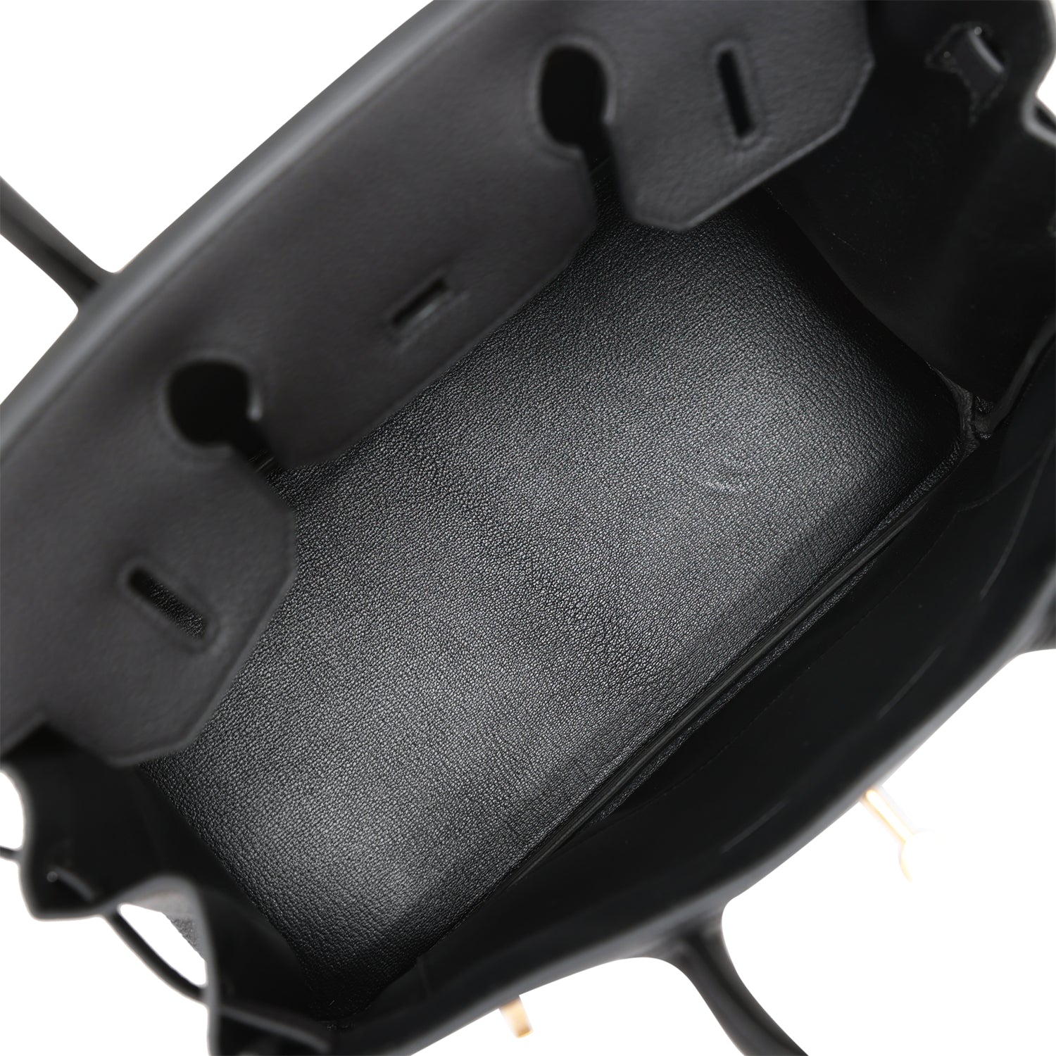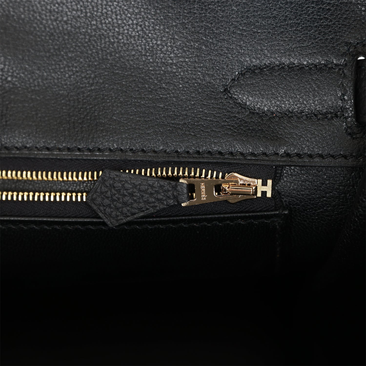 The interior is lined with black chevre and has one zip pocket with an Hermes engraved zipper pull and an open pocket on the opposite side.