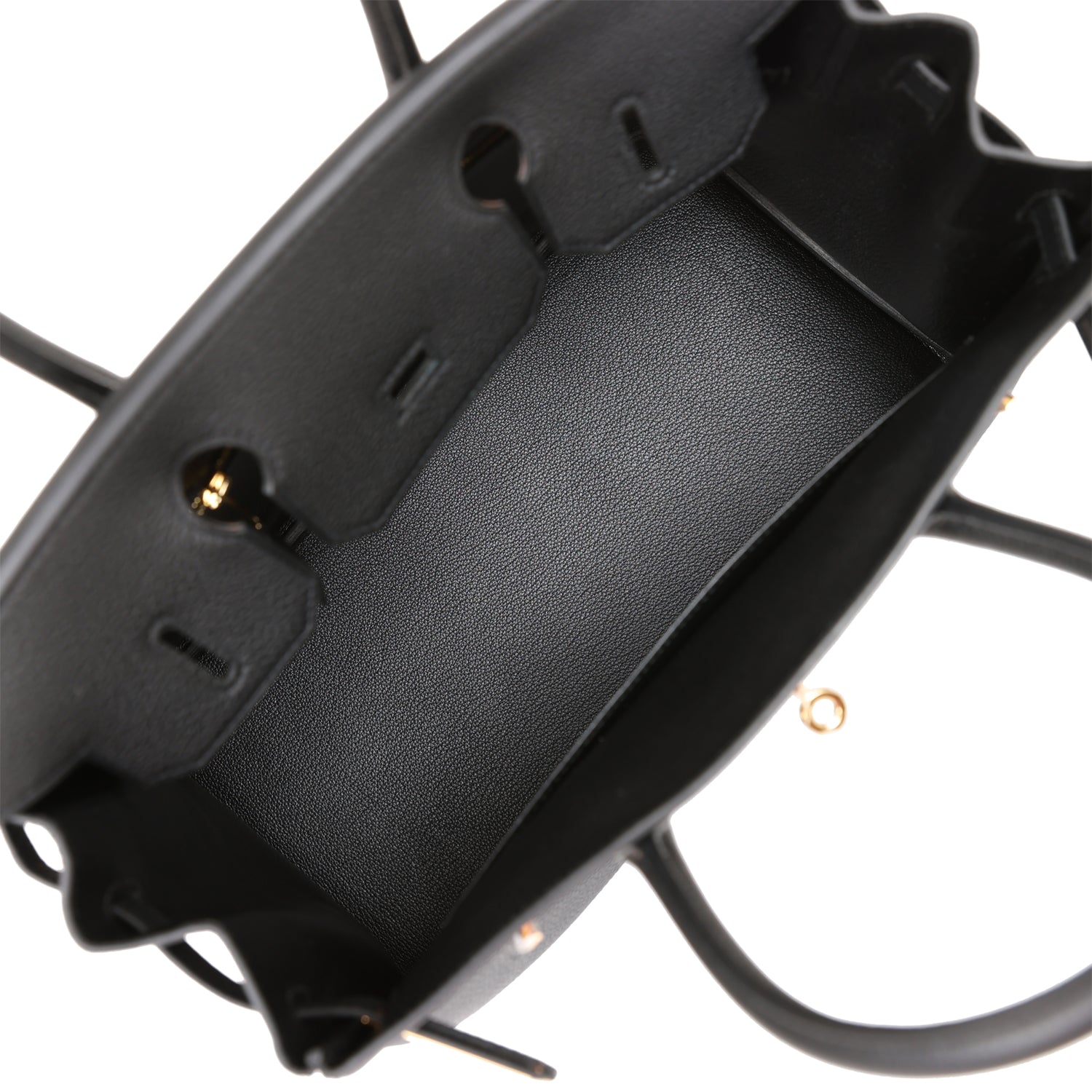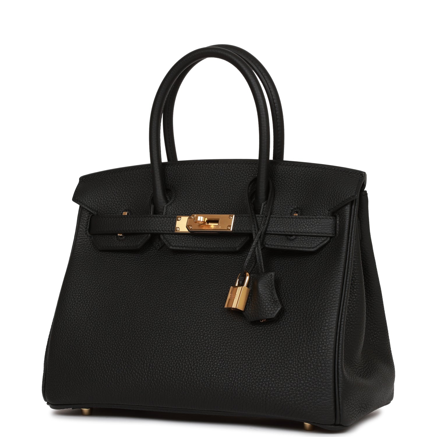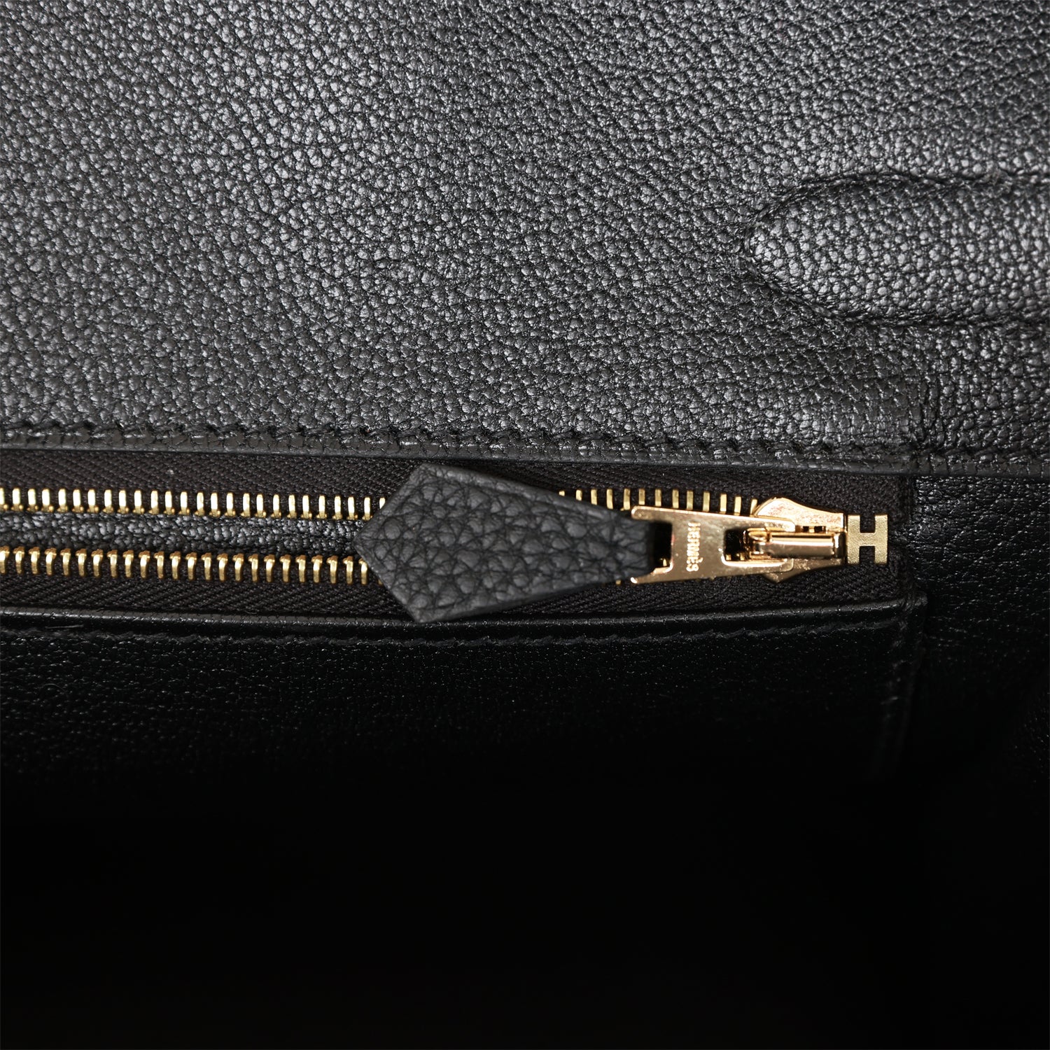 This Birkin is in Black togo leather with gold hardware and has tonal stitching, front flap, two straps with center toggle closure, clochette with lock and two keys, and double rolled handles.