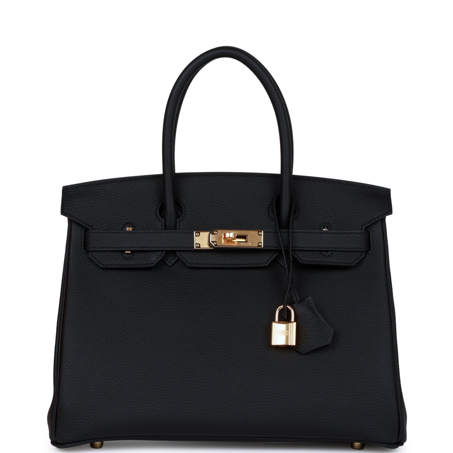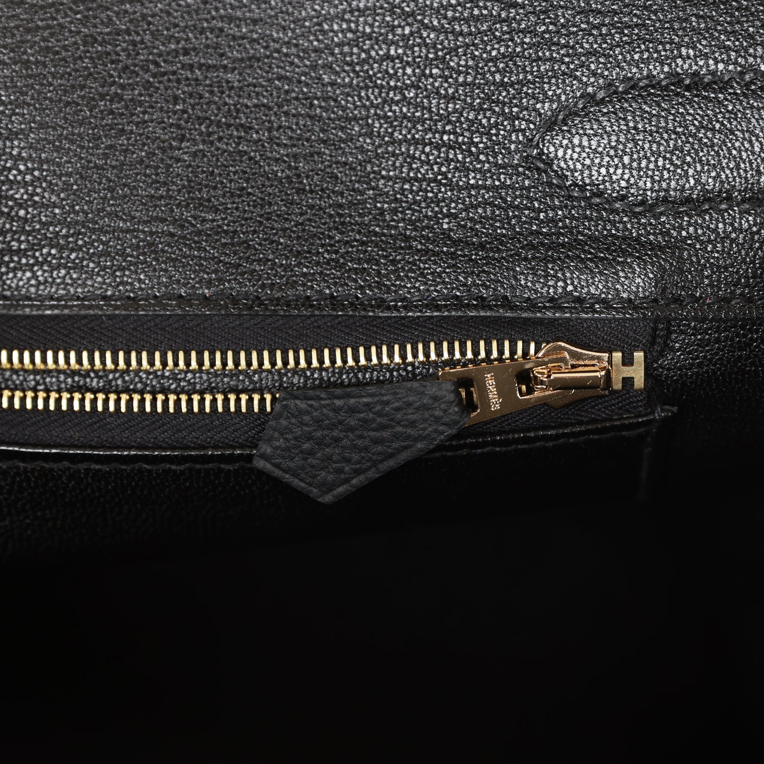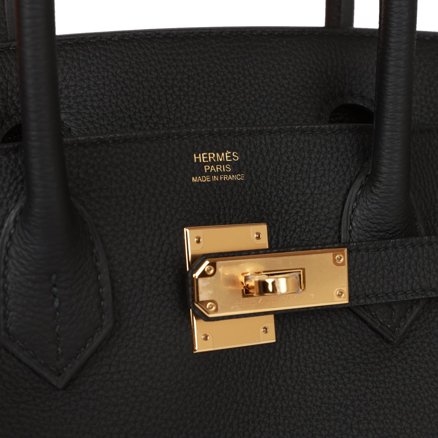 This Hermes Birkin is in Black togo leather with gold hardware and has tonal stitching, front flap, two straps with center toggle closure, clochette with lock and two keys, and double rolled handles.