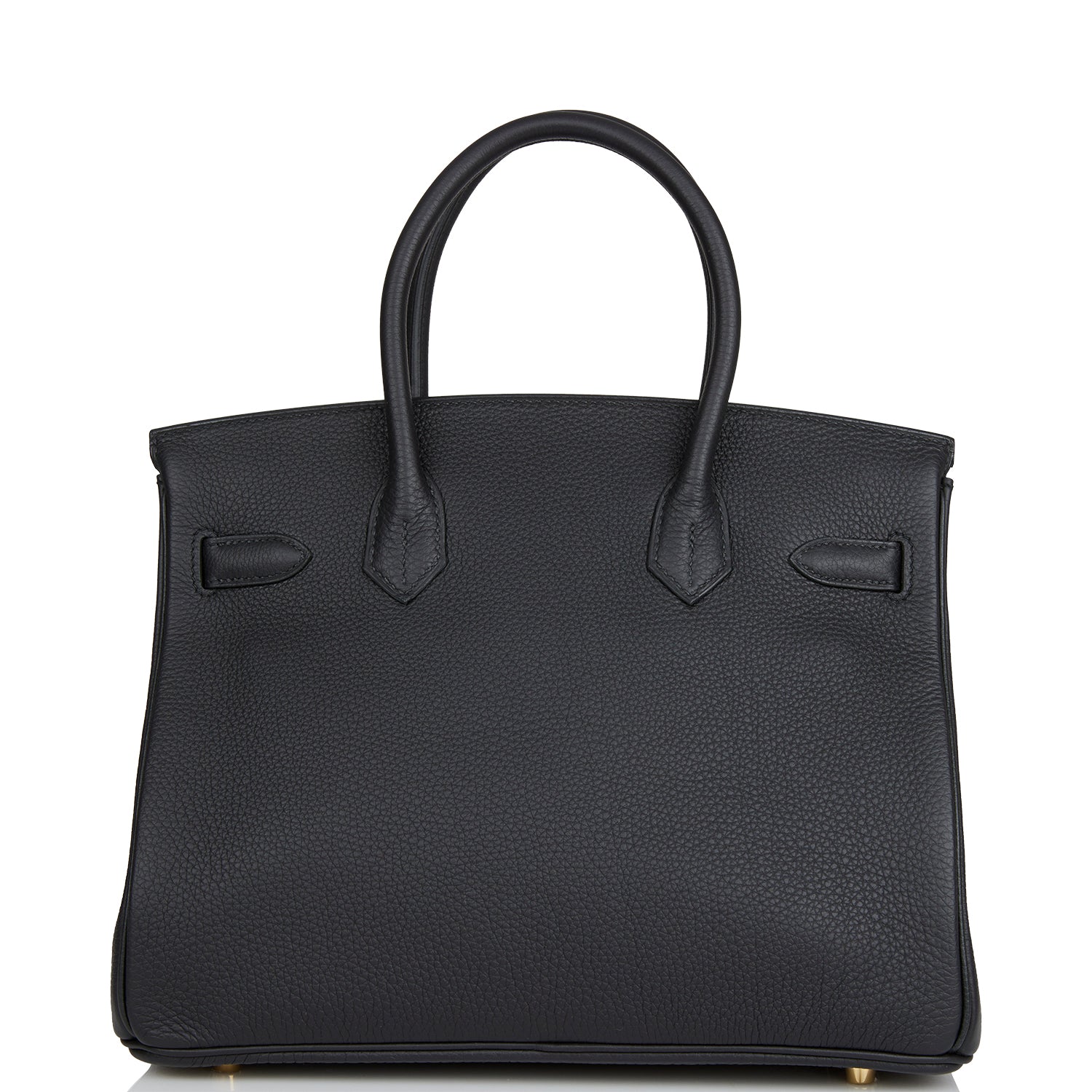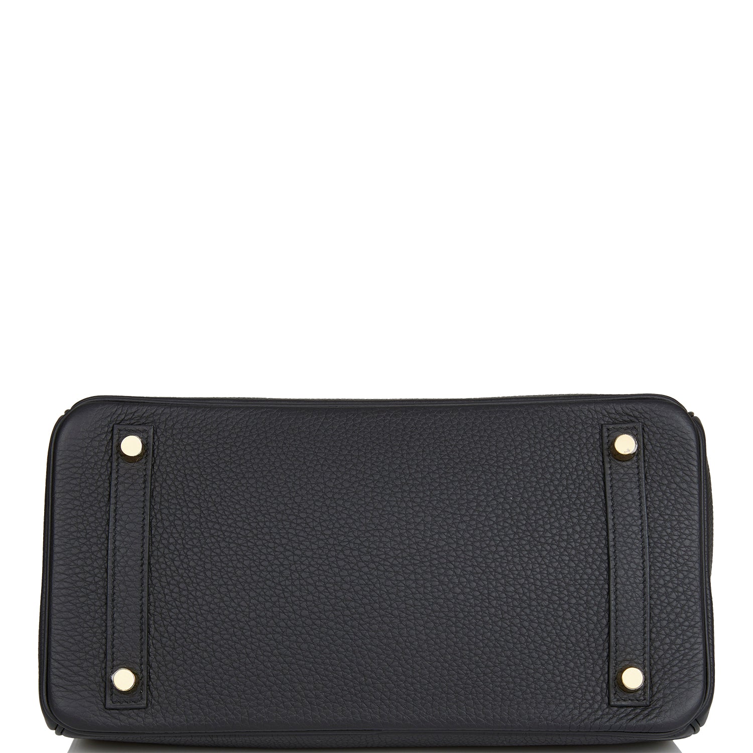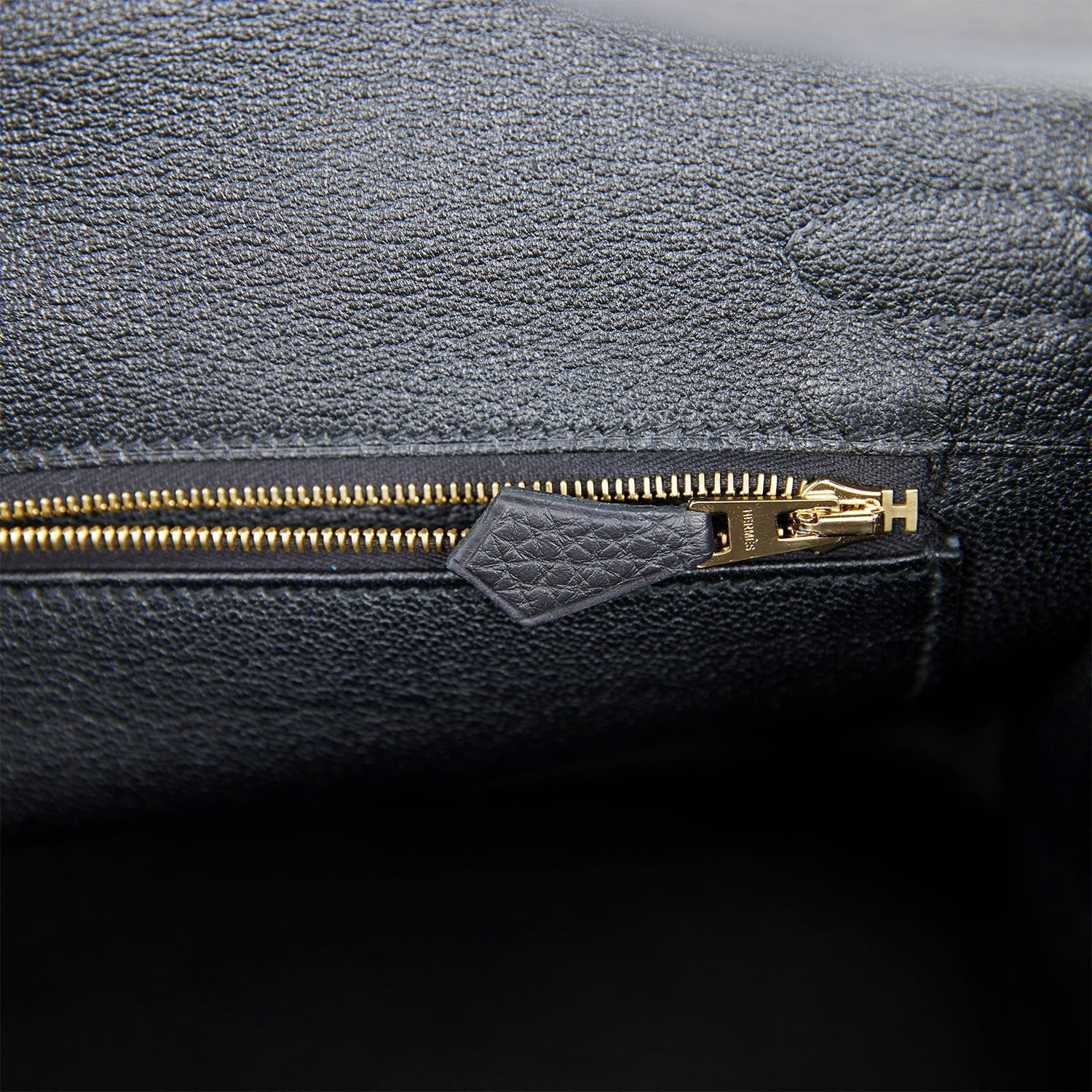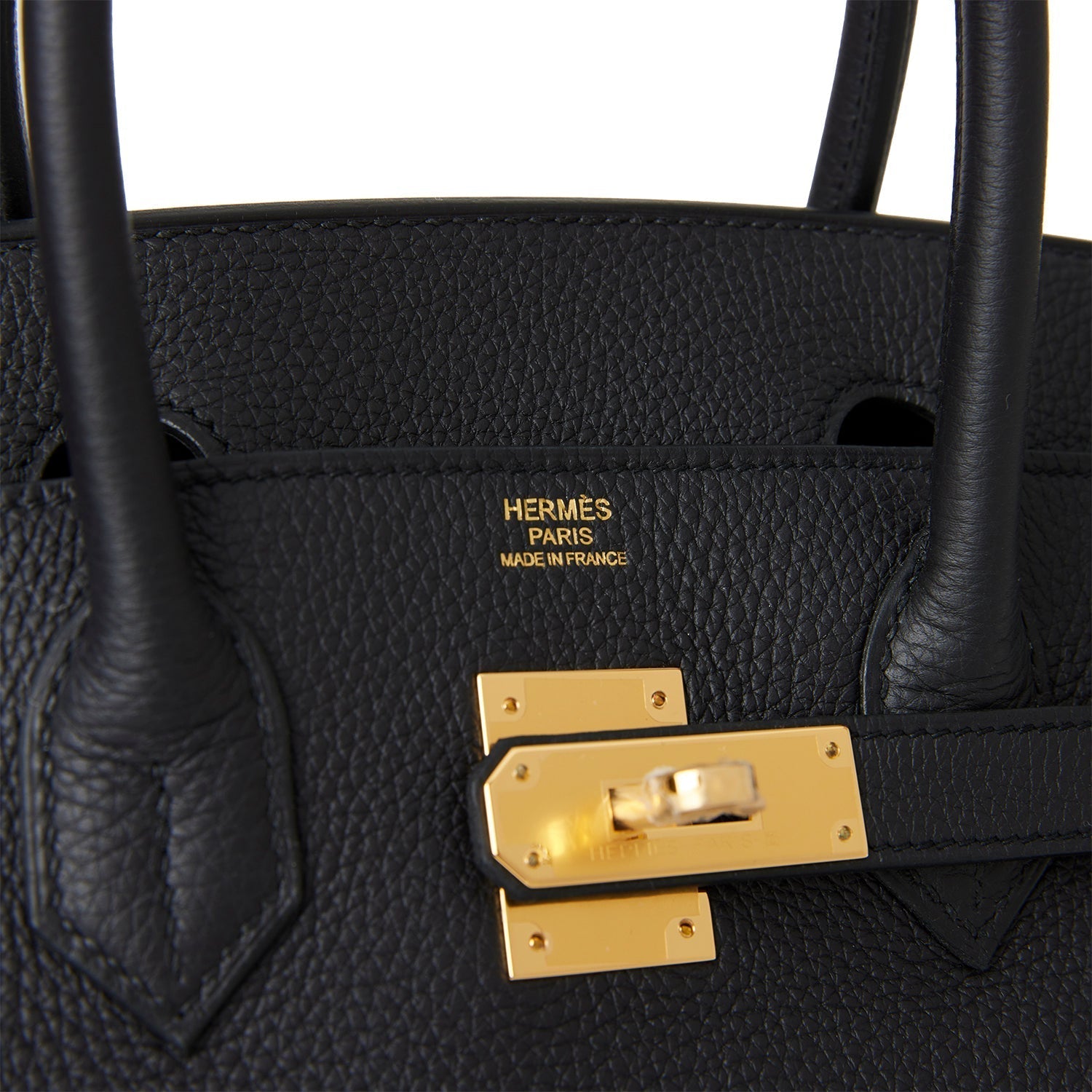 This Birkin is in Black togo leather with gold hardware and has tonal stitching, front flap, two straps with center toggle closure, clochette with lock and two keys, and double rolled handles.