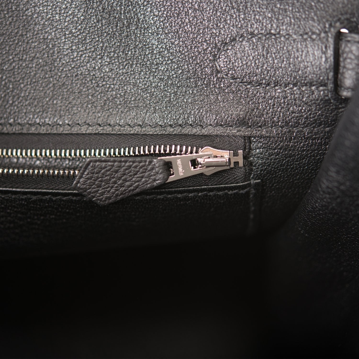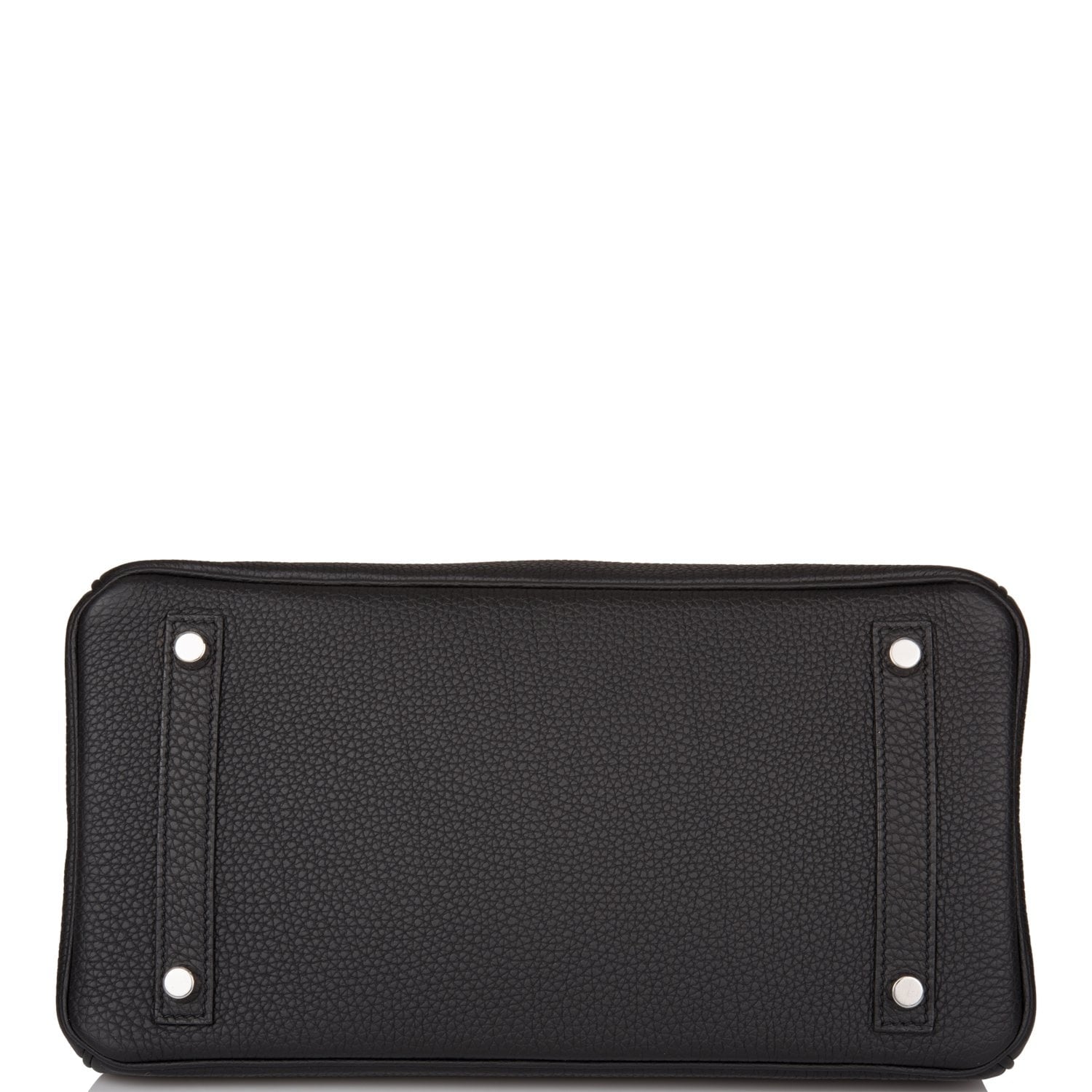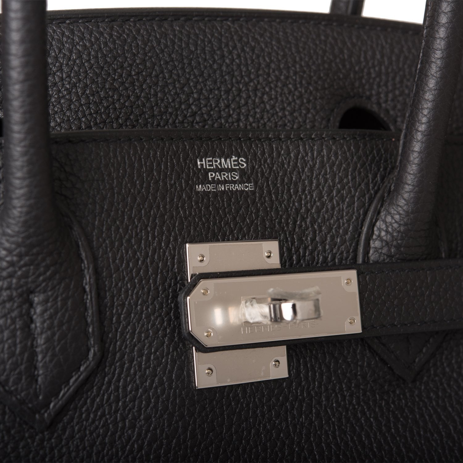 This Birkin is in Black togo leather with palladium hardware and has tonal stitching, front flap, two straps with center toggle closure, clochette with lock and two keys, and double rolled handles.