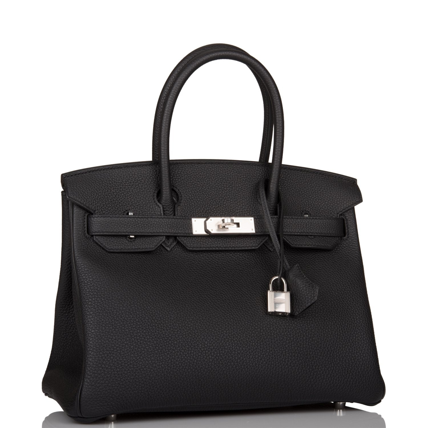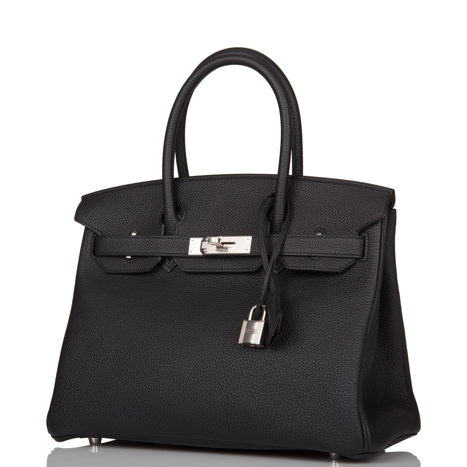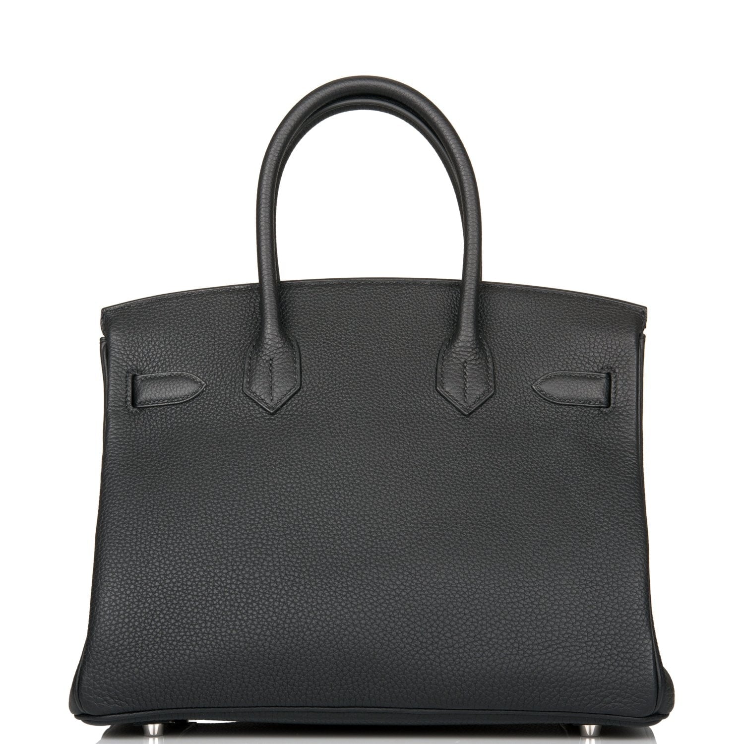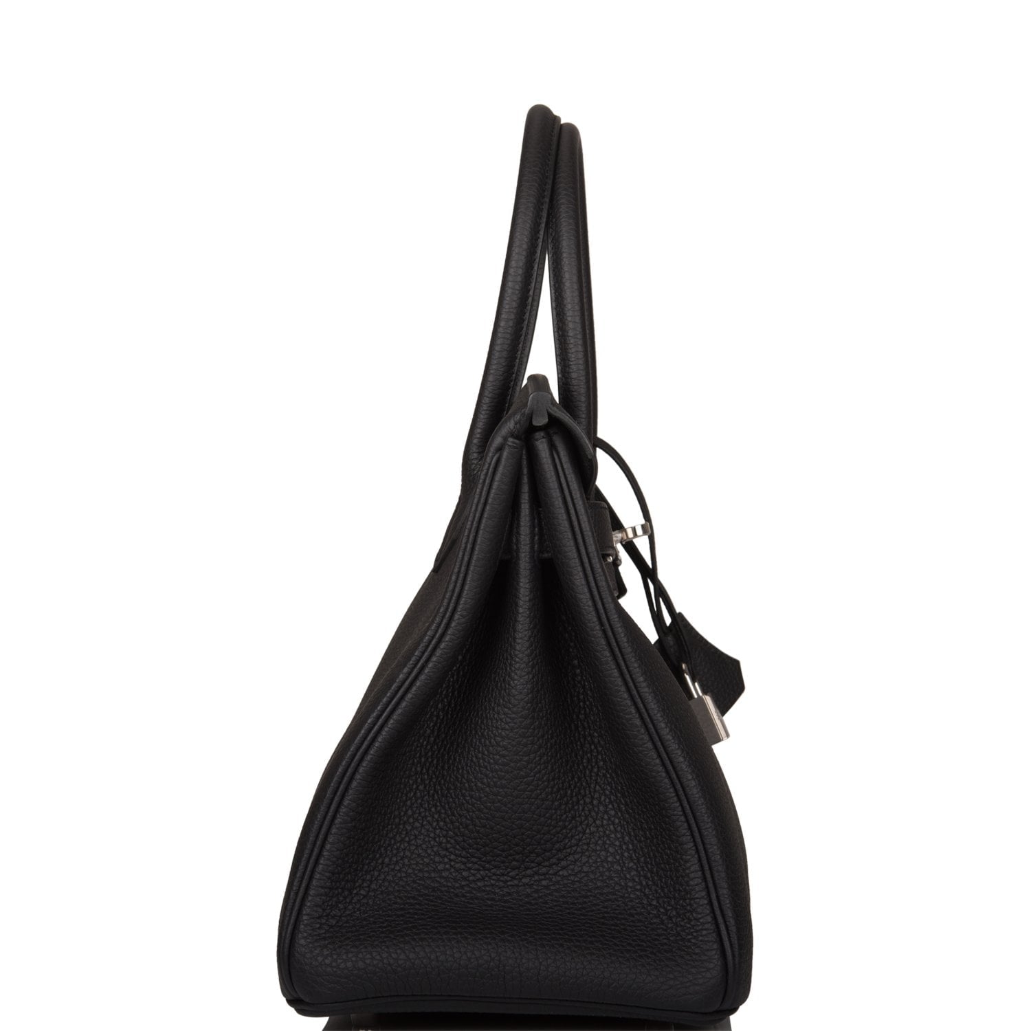 This Birkin is in Black togo leather with palladium hardware and has tonal stitching, front flap, two straps with center toggle closure, clochette with lock and two keys, and double rolled handles.