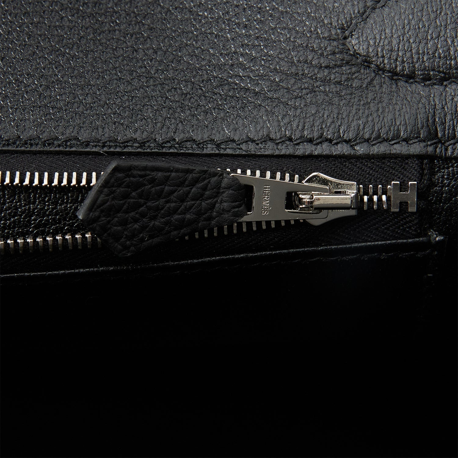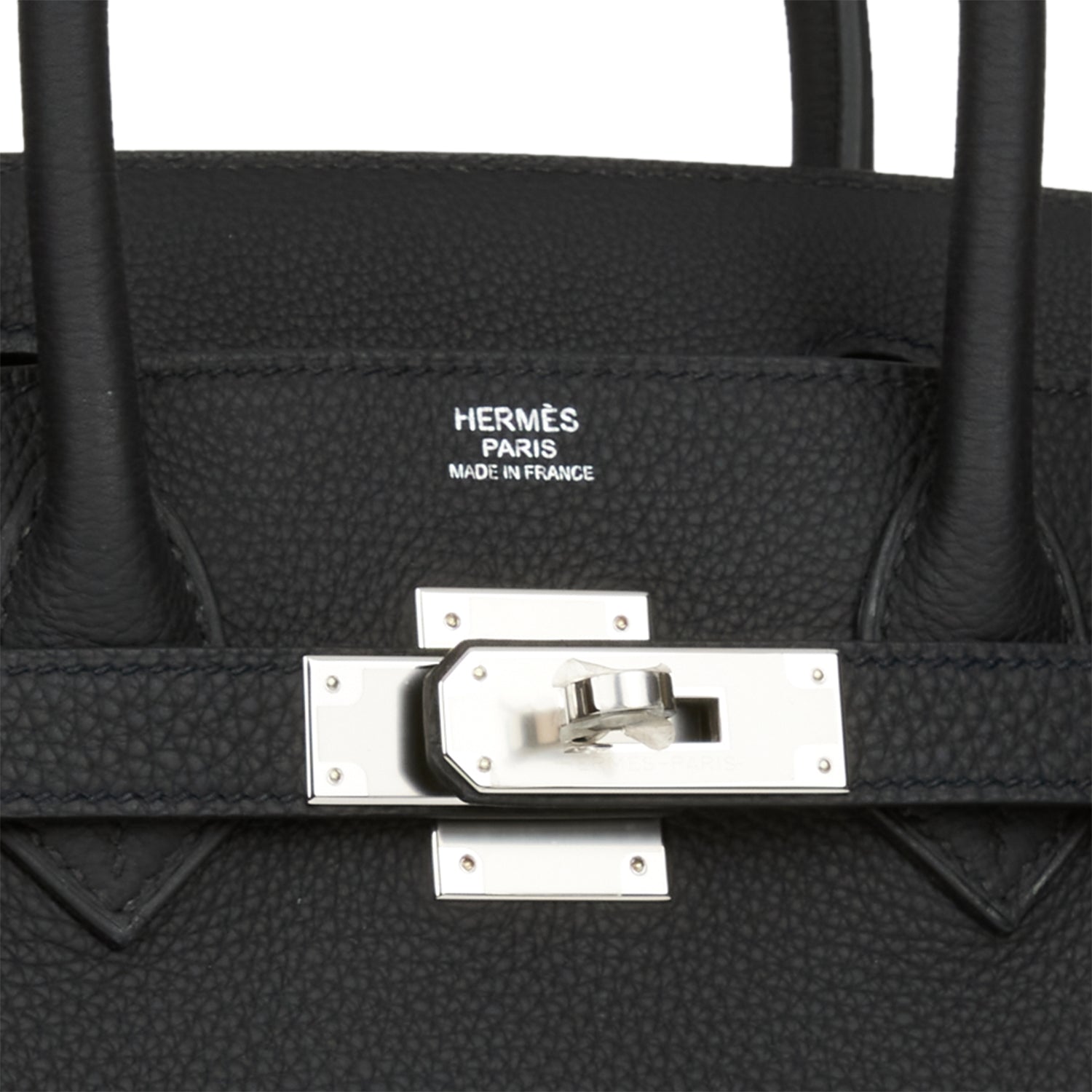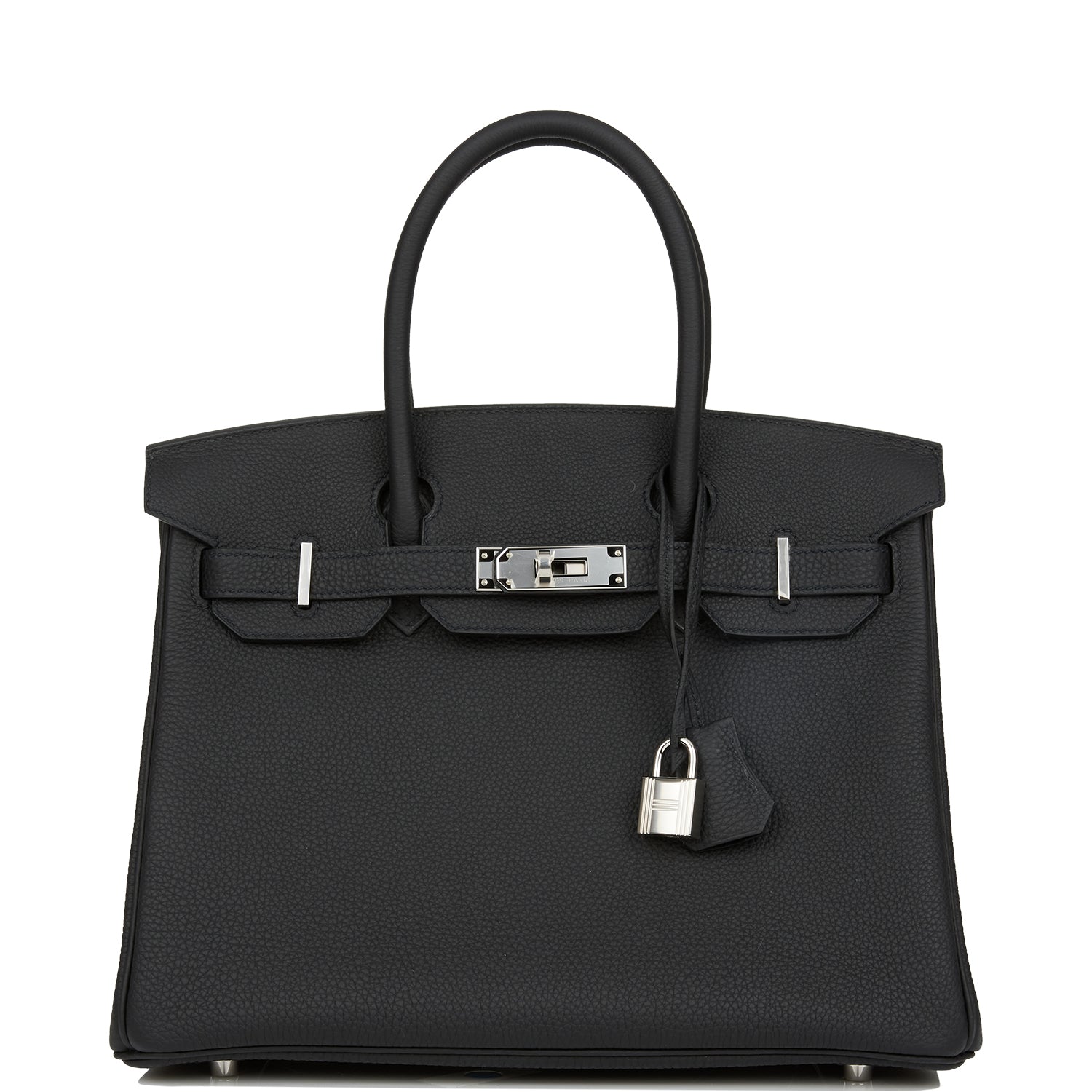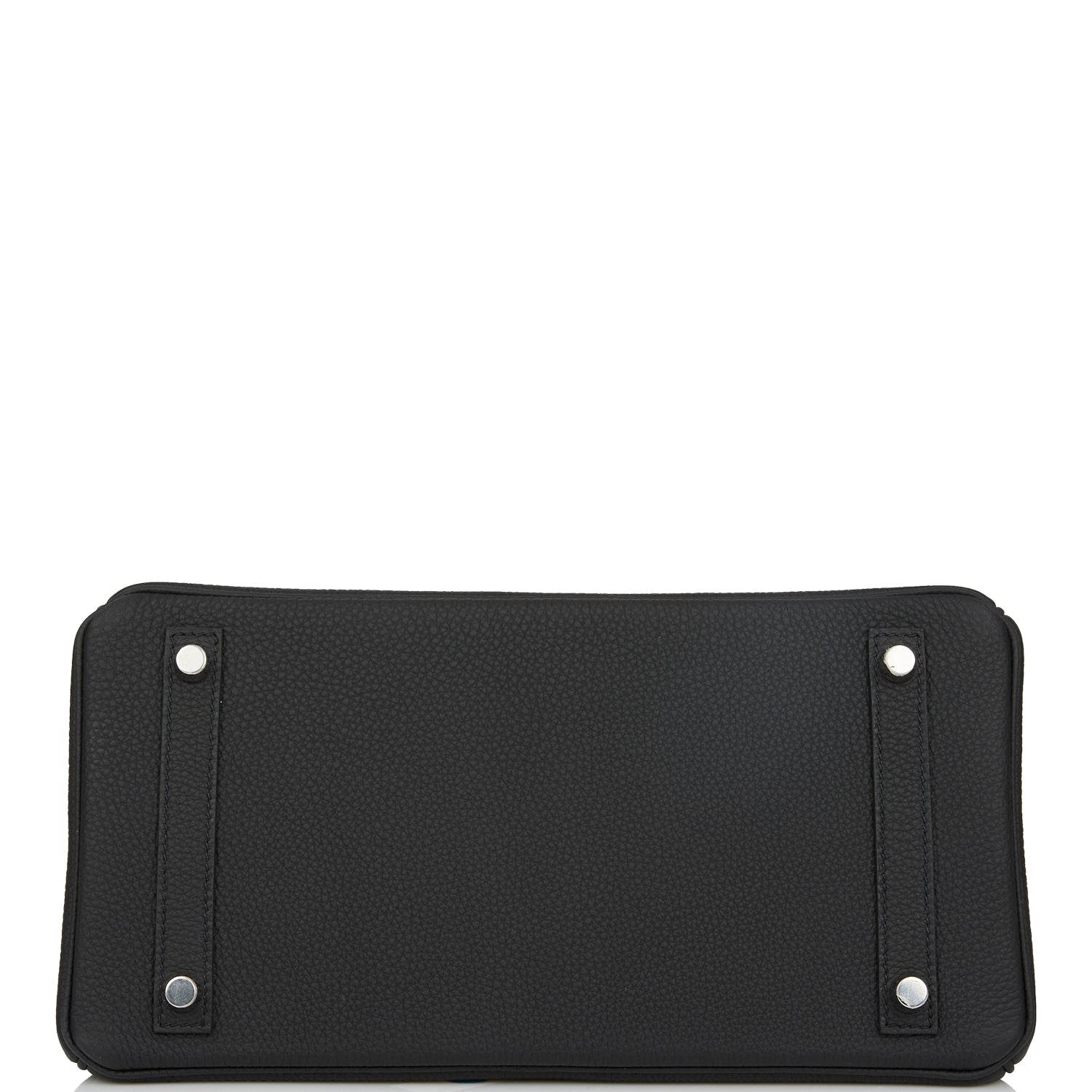 This Birkin is in Black togo leather with palladium hardware and has tonal stitching, front flap, two straps with center toggle closure, clochette with lock and two keys, and double rolled handles.