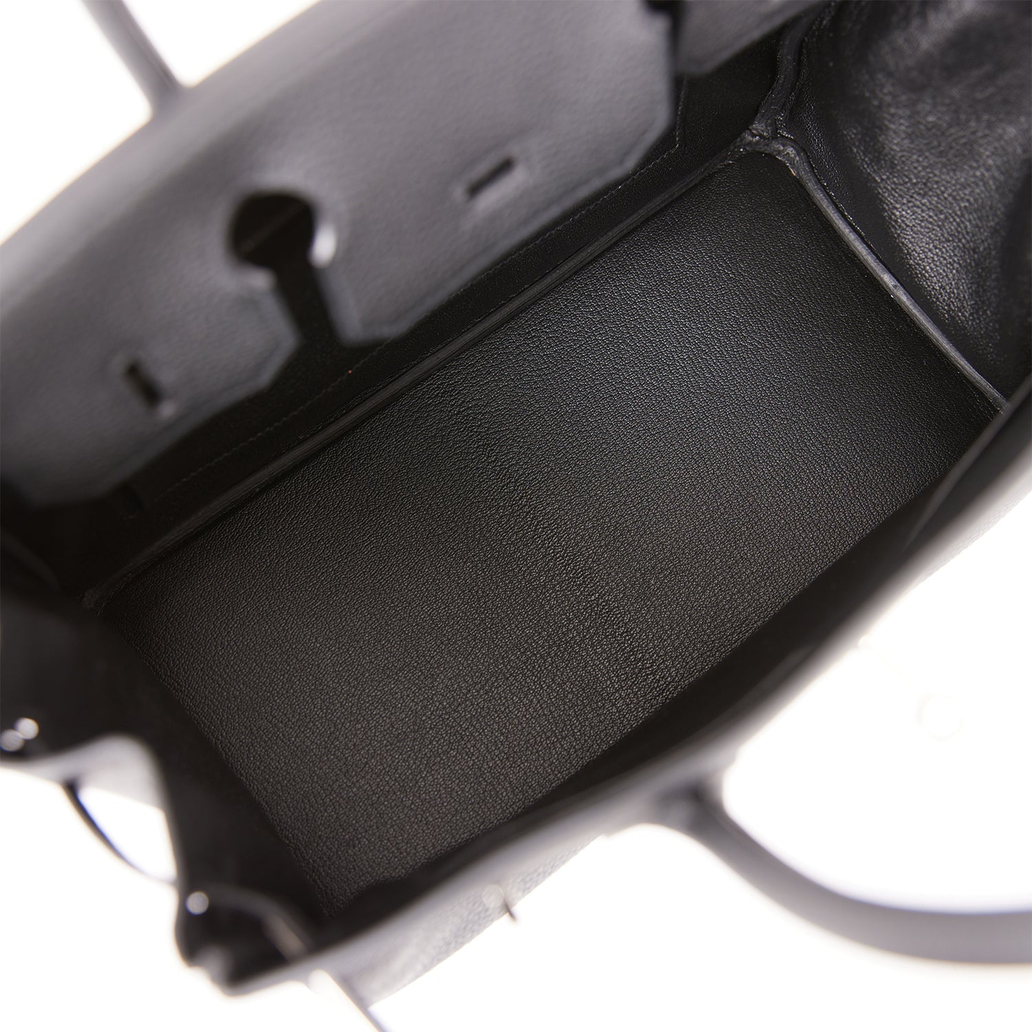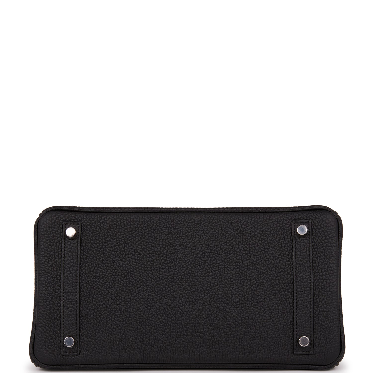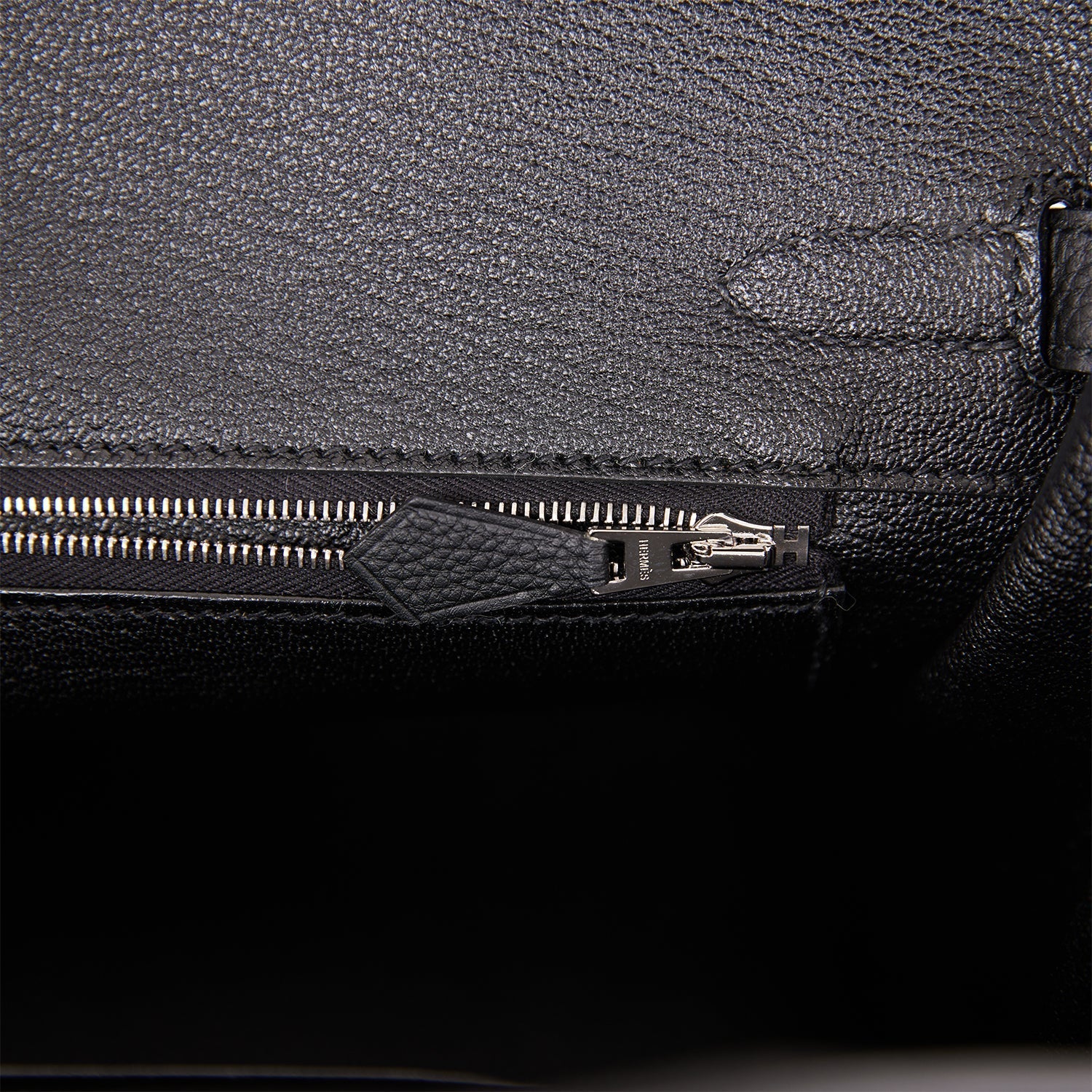 This Birkin is in Black togo leather with palladium hardware and has tonal stitching, front flap, two straps with center toggle closure, clochette with lock and two keys, and double rolled handles.