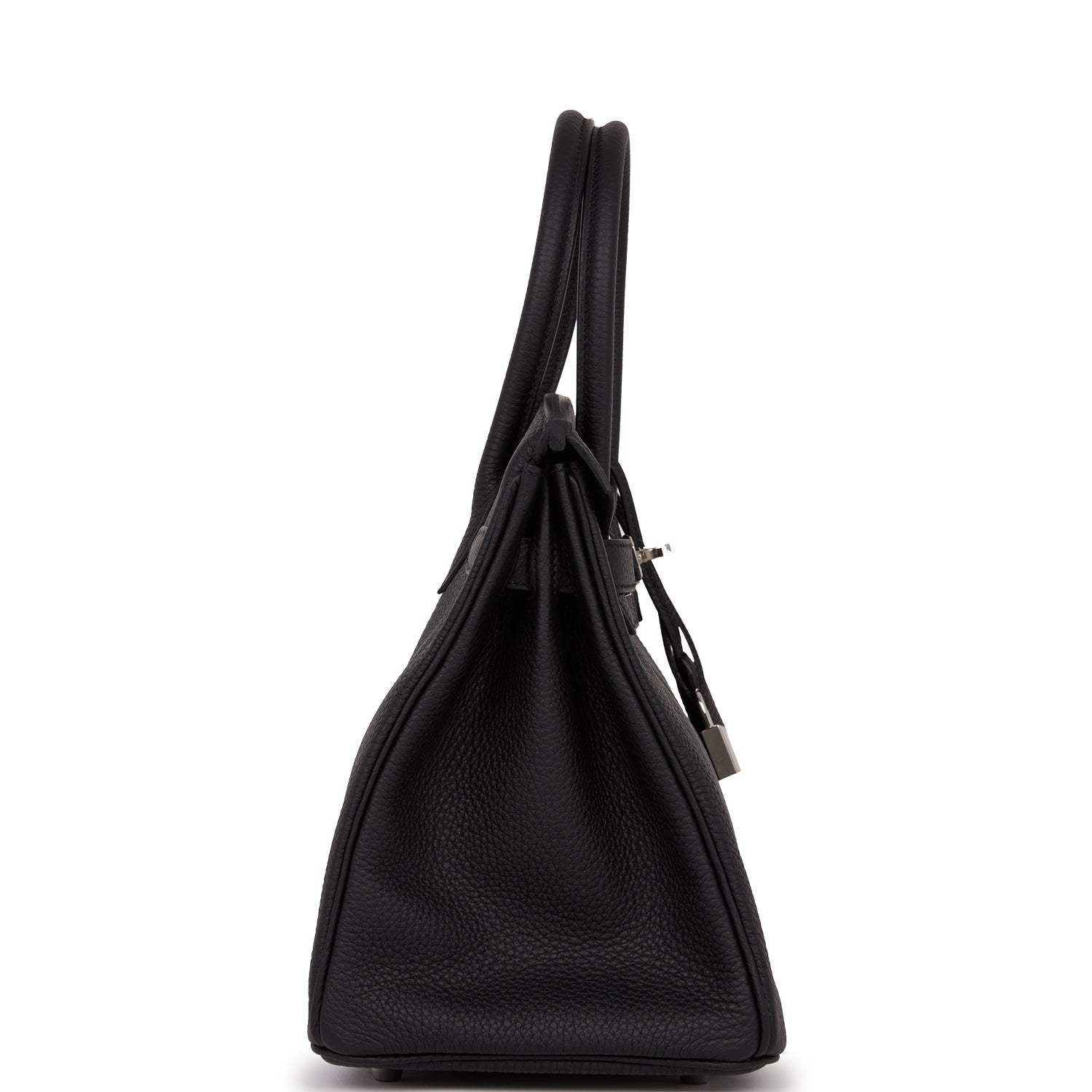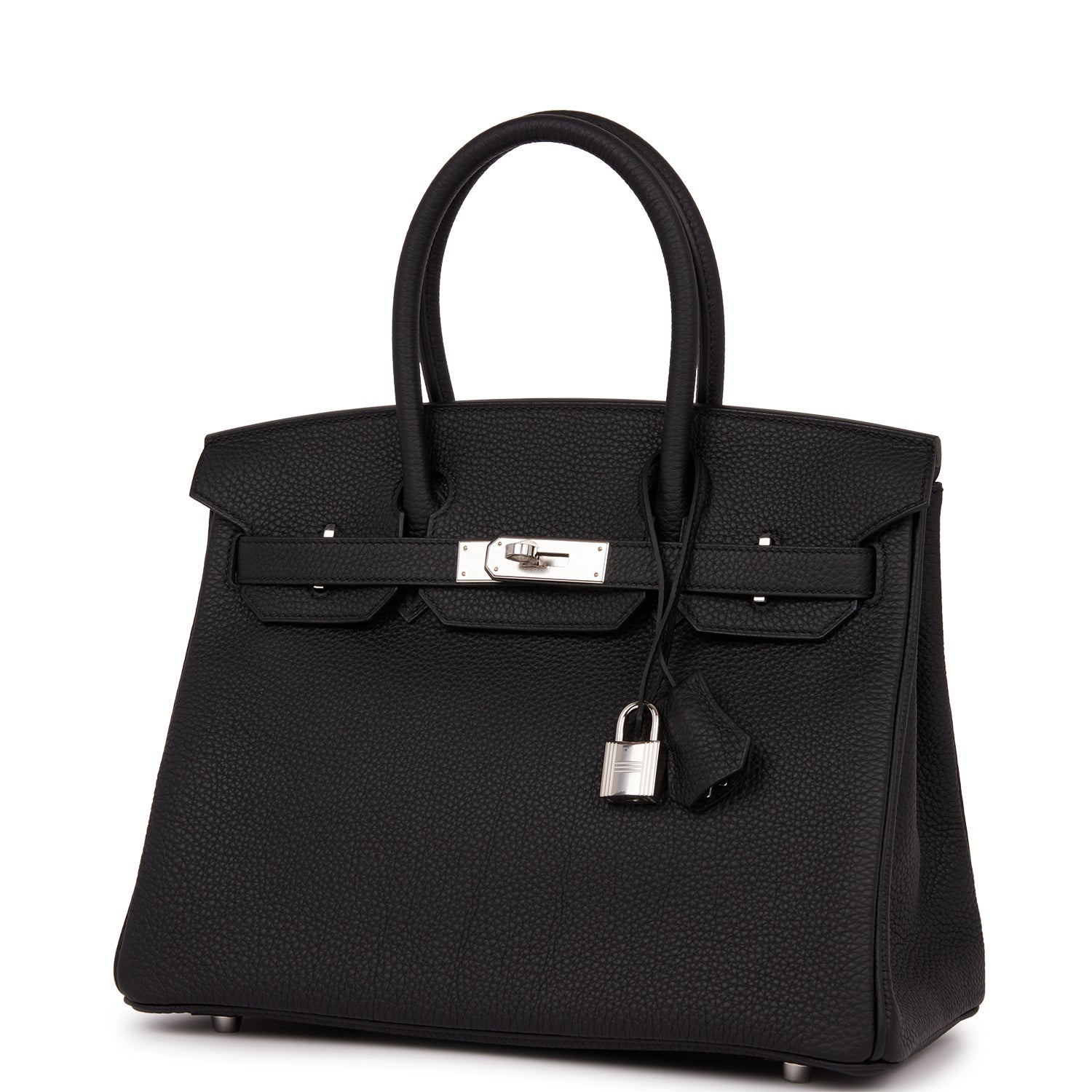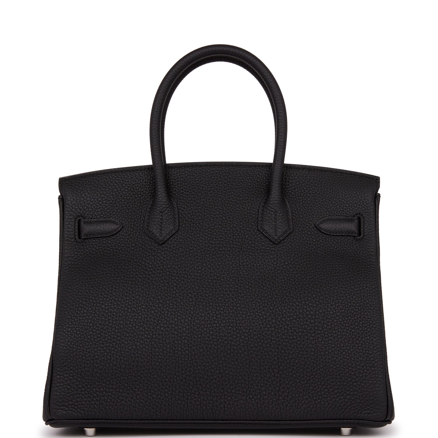 This Birkin is in Black togo leather with palladium hardware and has tonal stitching, front flap, two straps with center toggle closure, clochette with lock and two keys, and double rolled handles.