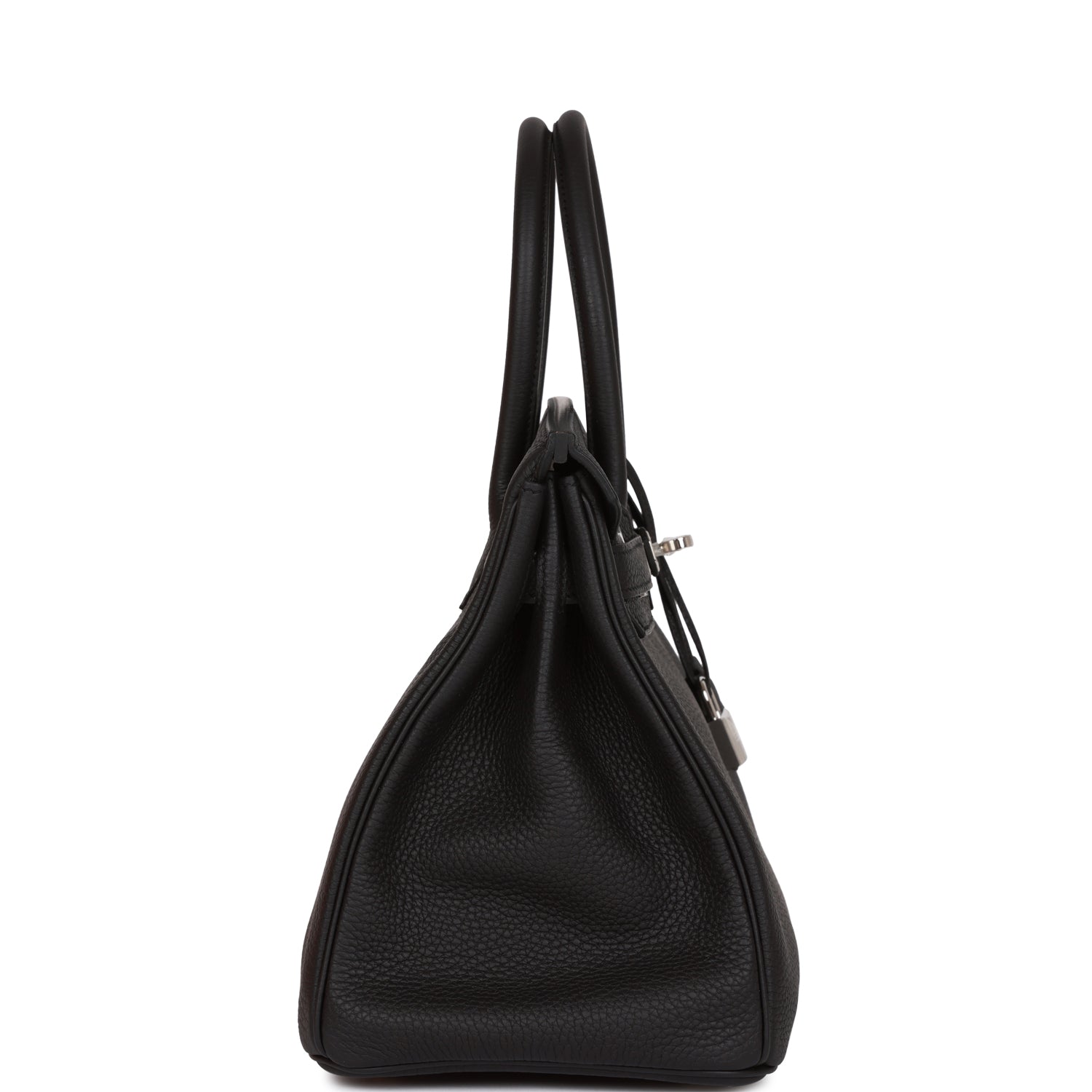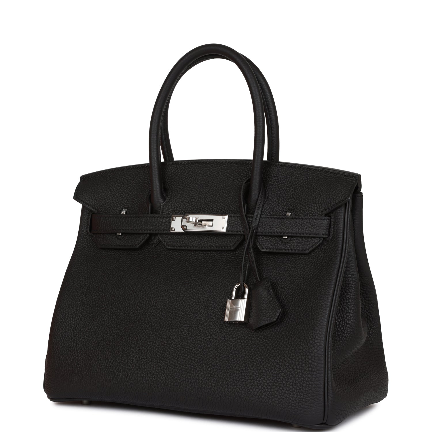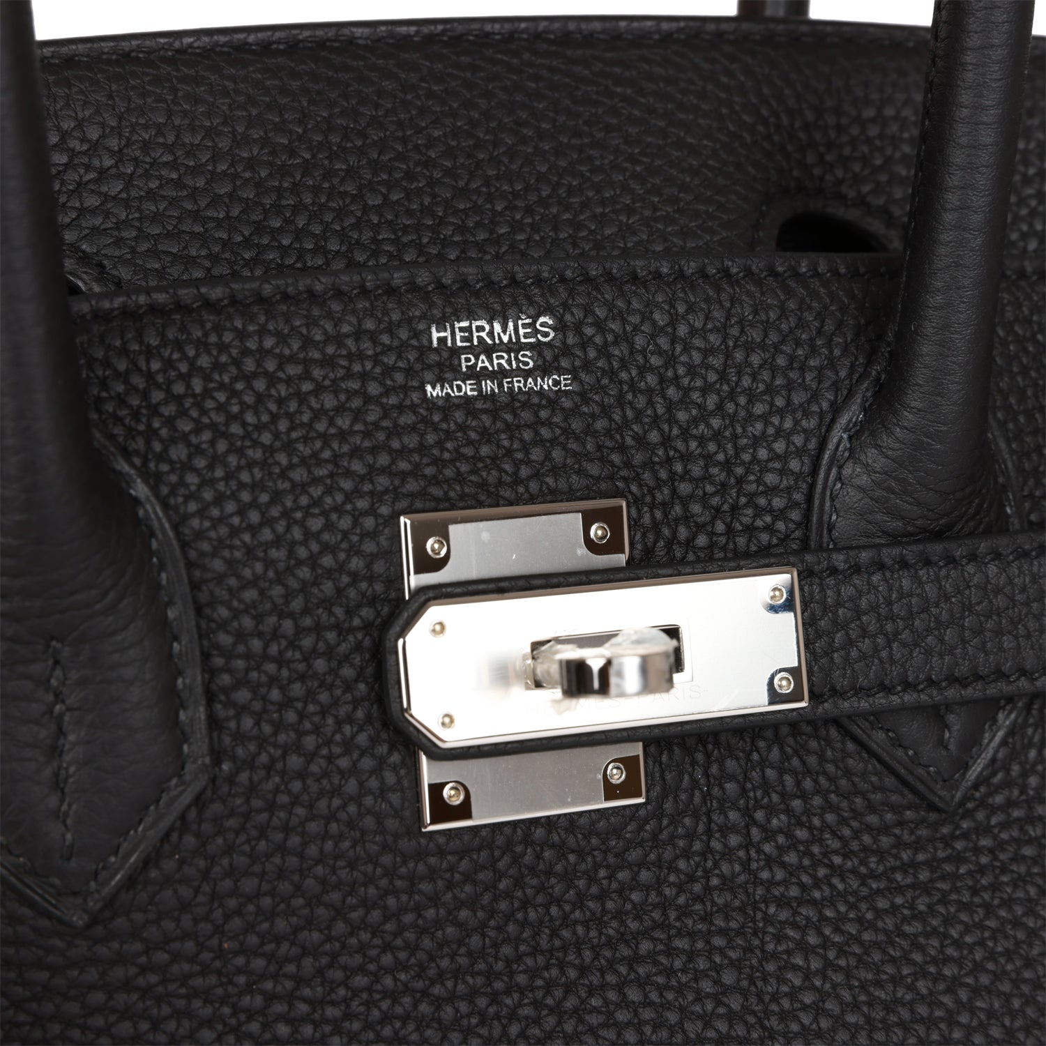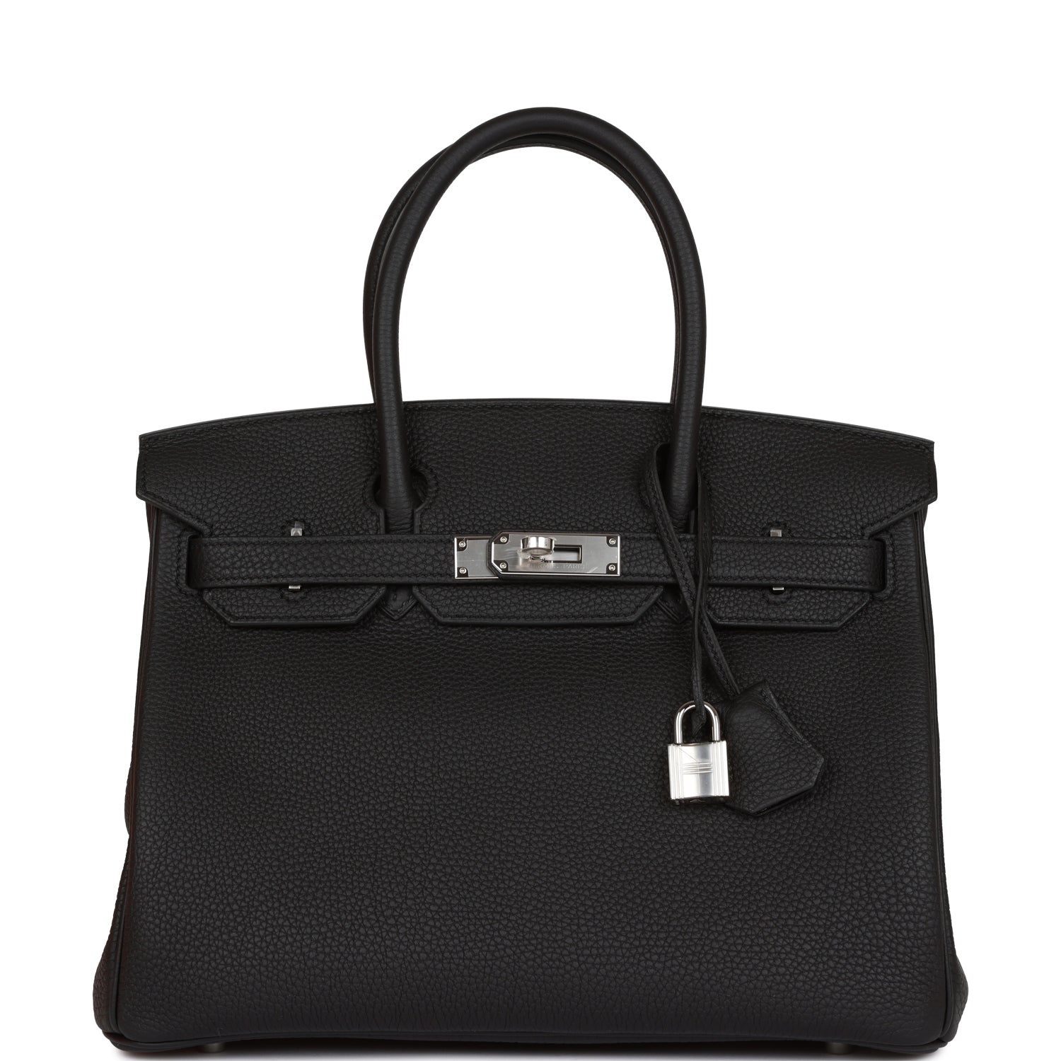 This Birkin is in Black togo leather with palladium hardware and has tonal stitching, front flap, two straps with center toggle closure, clochette with lock and two keys, and double rolled handles.