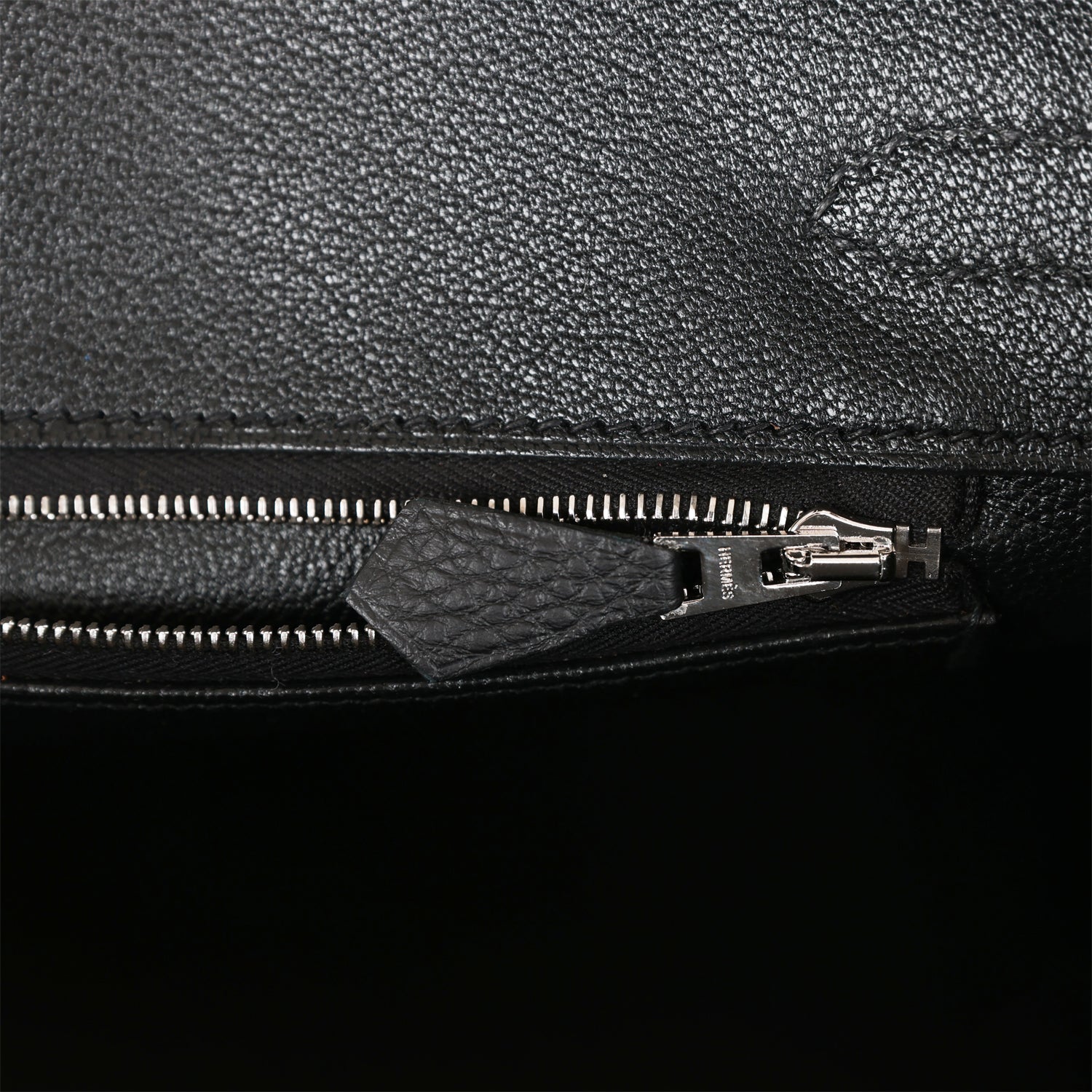 The interior is lined with black chevre and has one zip pocket with an Hermes engraved zipper pull and an open pocket on the opposite side.