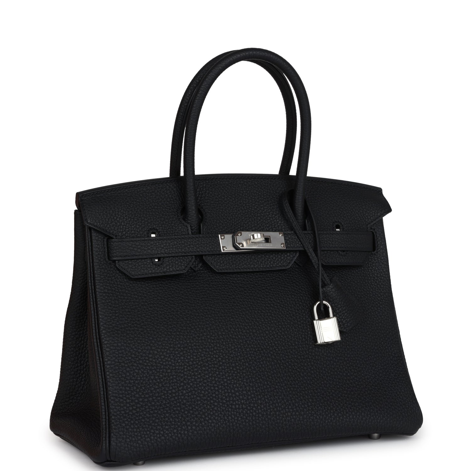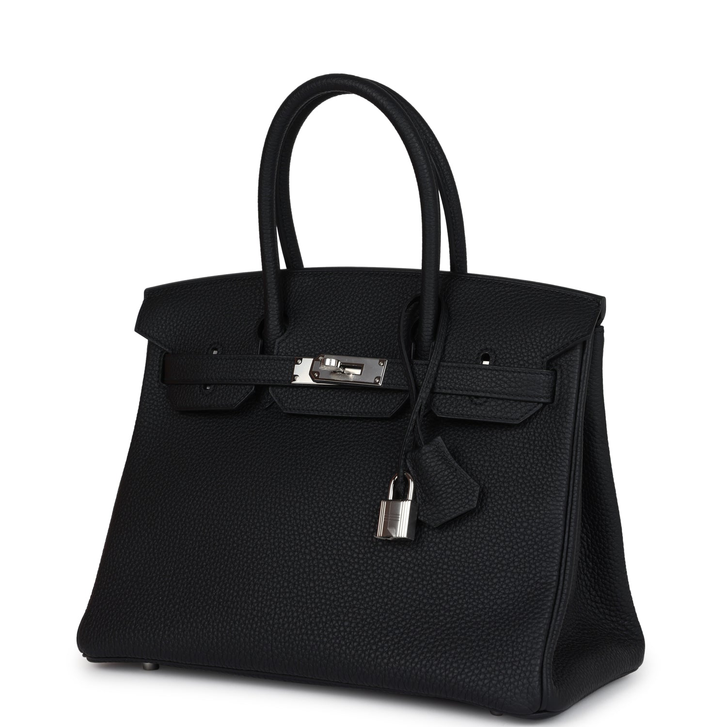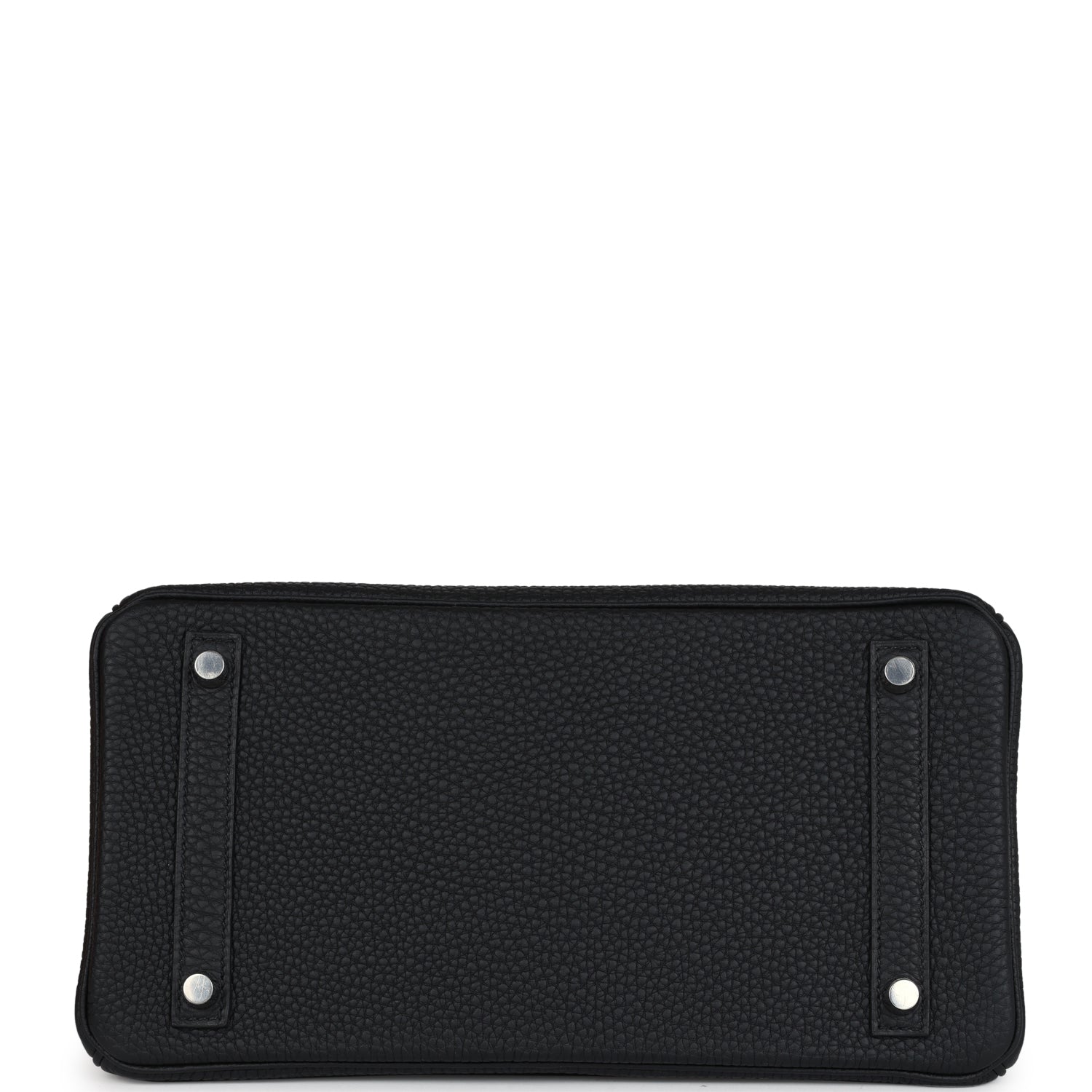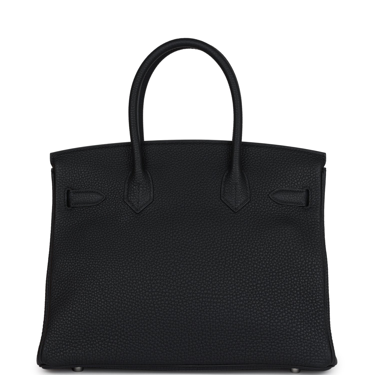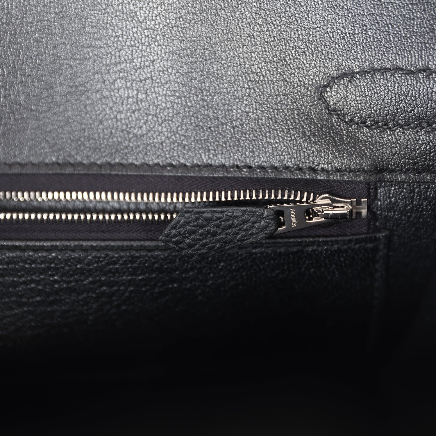 This Birkin is in Black togo leather with palladium hardware and has tonal stitching, front flap, two straps with center toggle closure, clochette with lock and two keys, and double rolled handles.