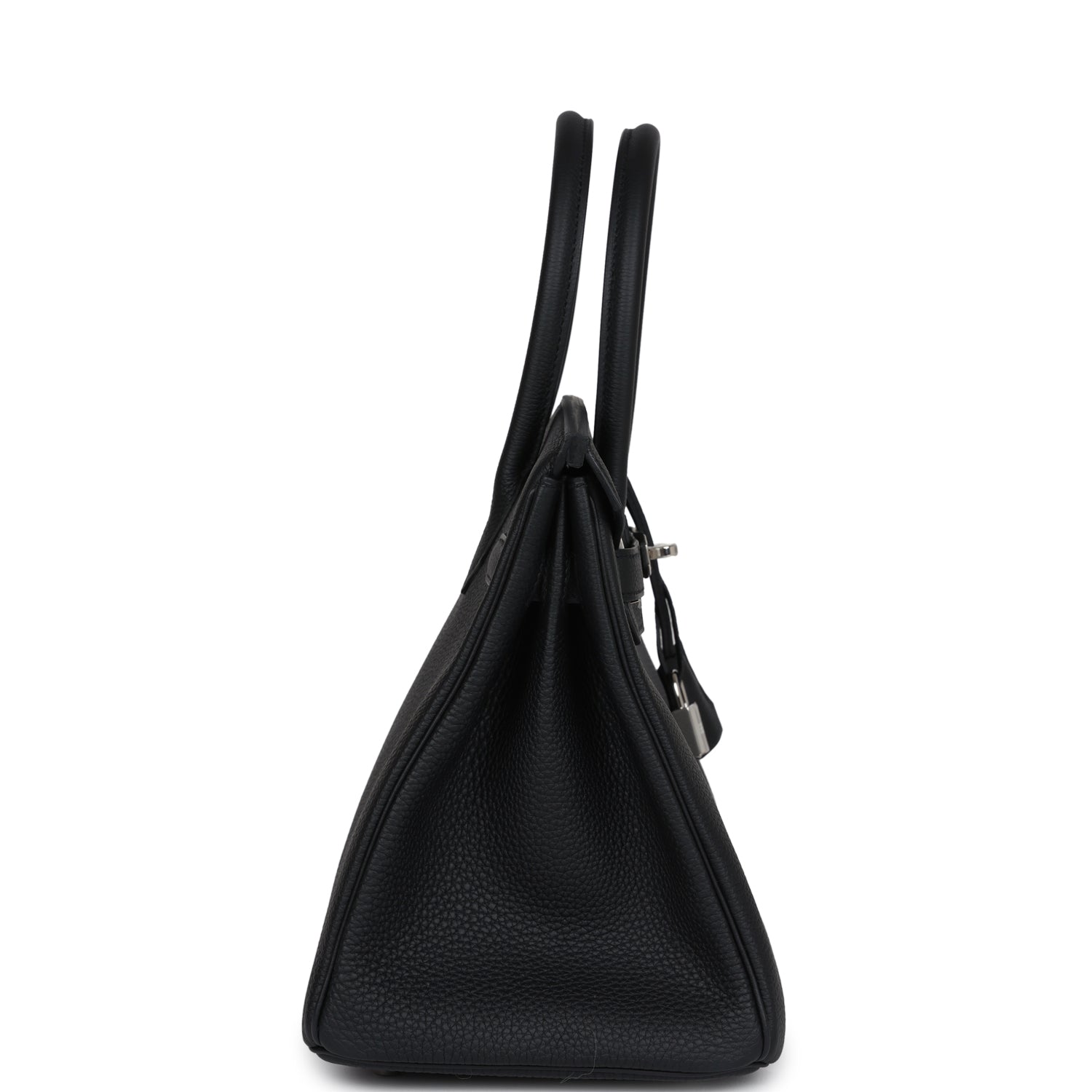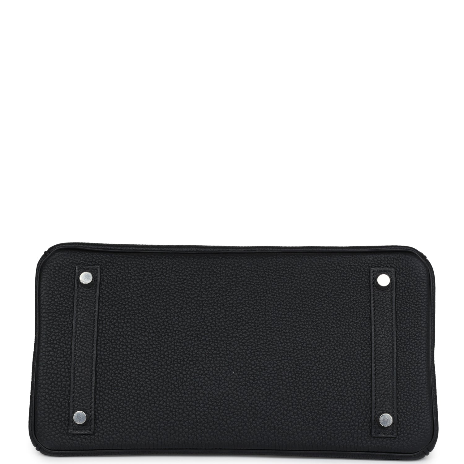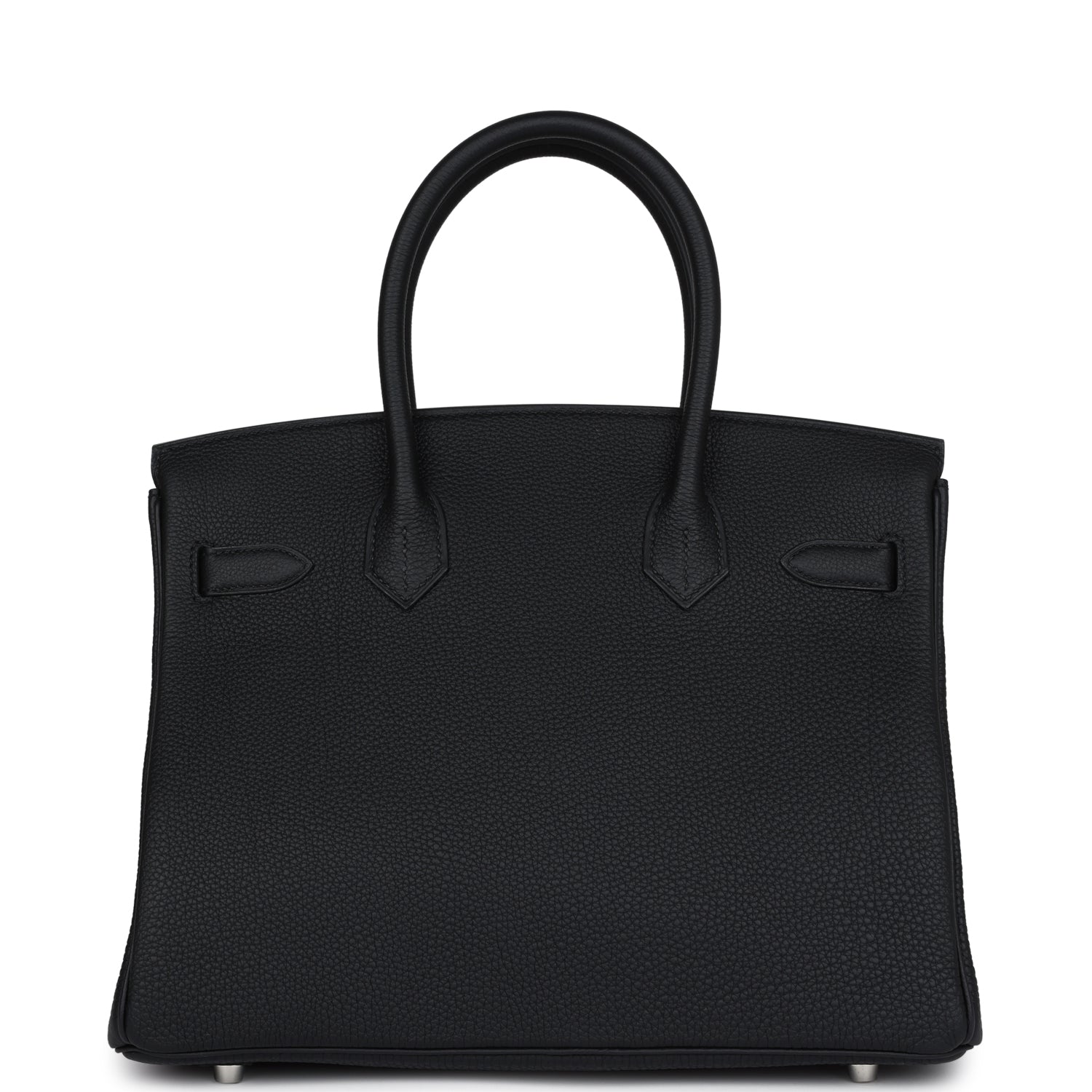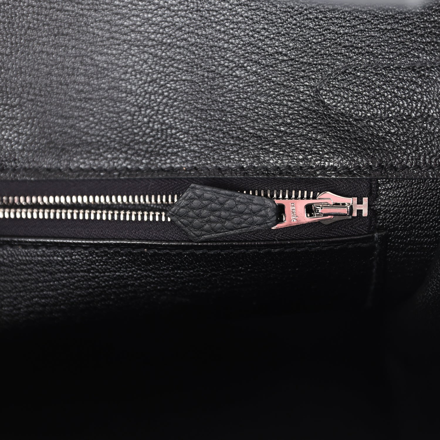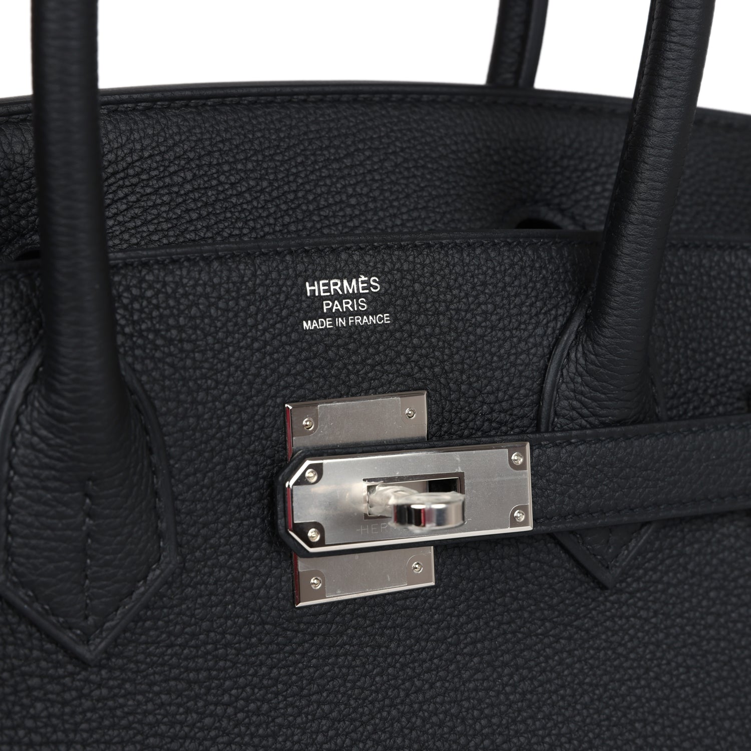 This Birkin is in Black togo leather with palladium hardware and has tonal stitching, front flap, two straps with center toggle closure, clochette with lock and two keys, and double rolled handles.