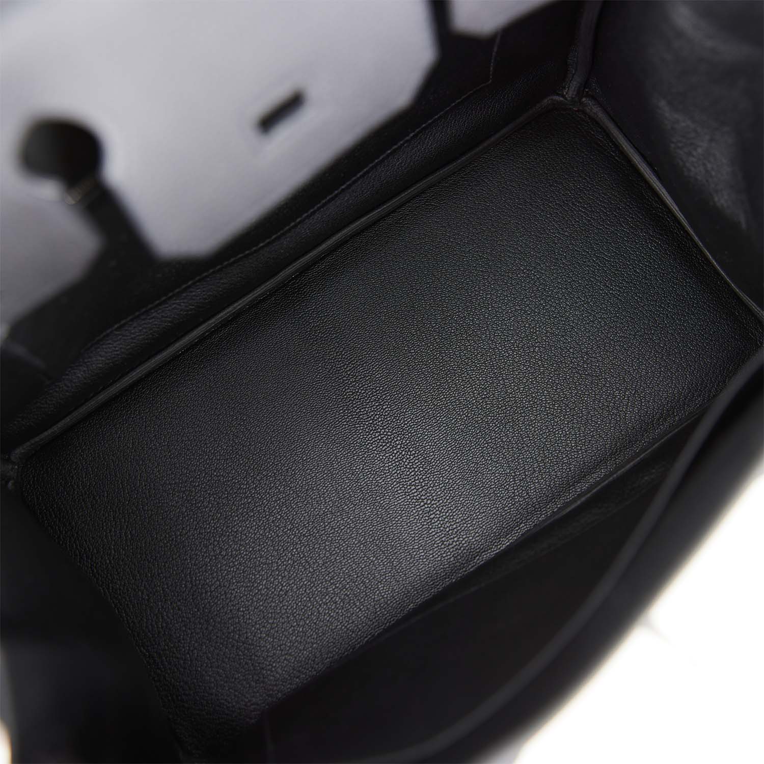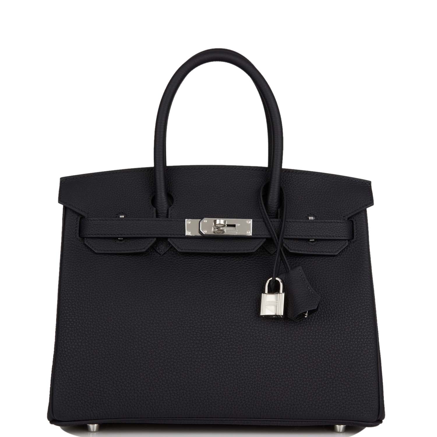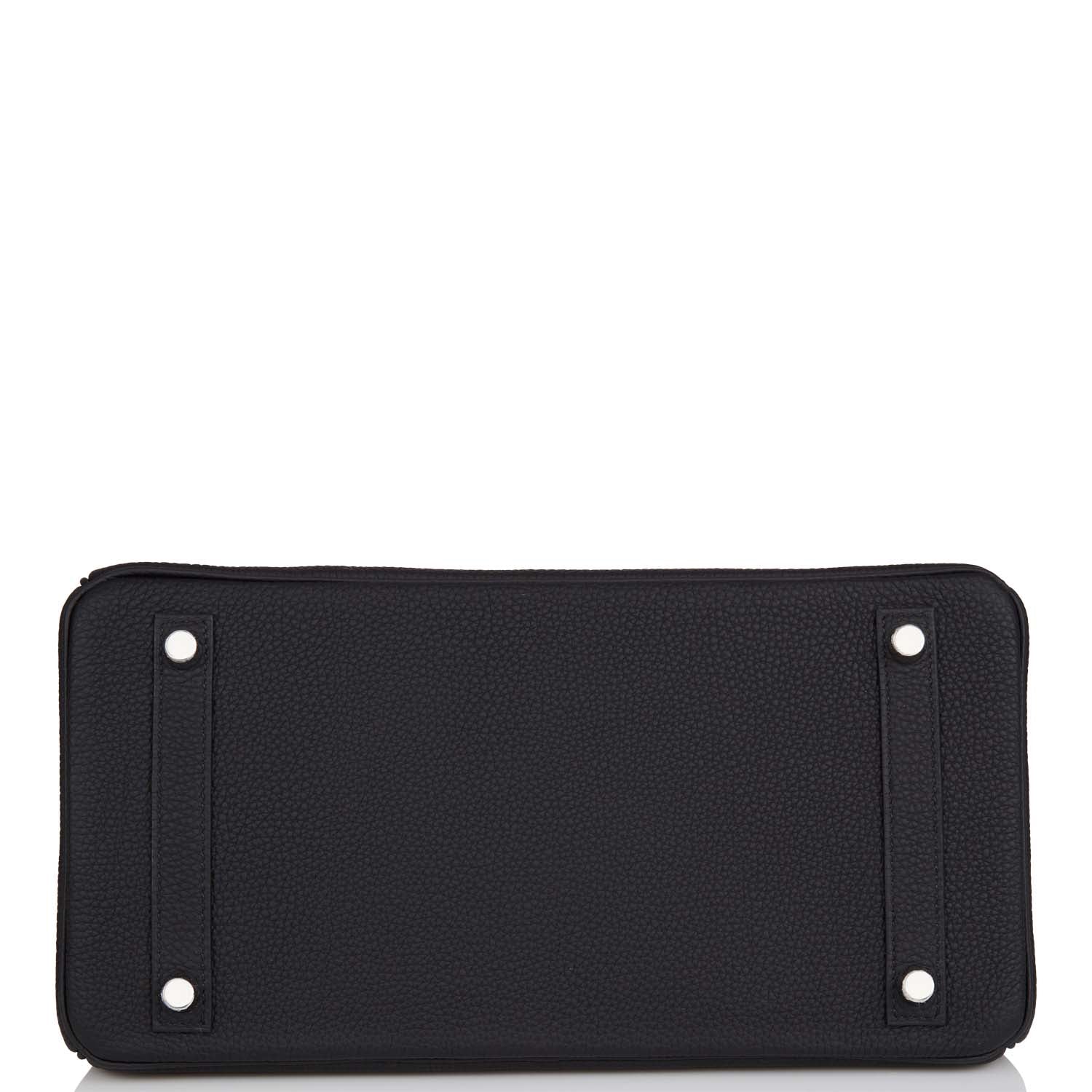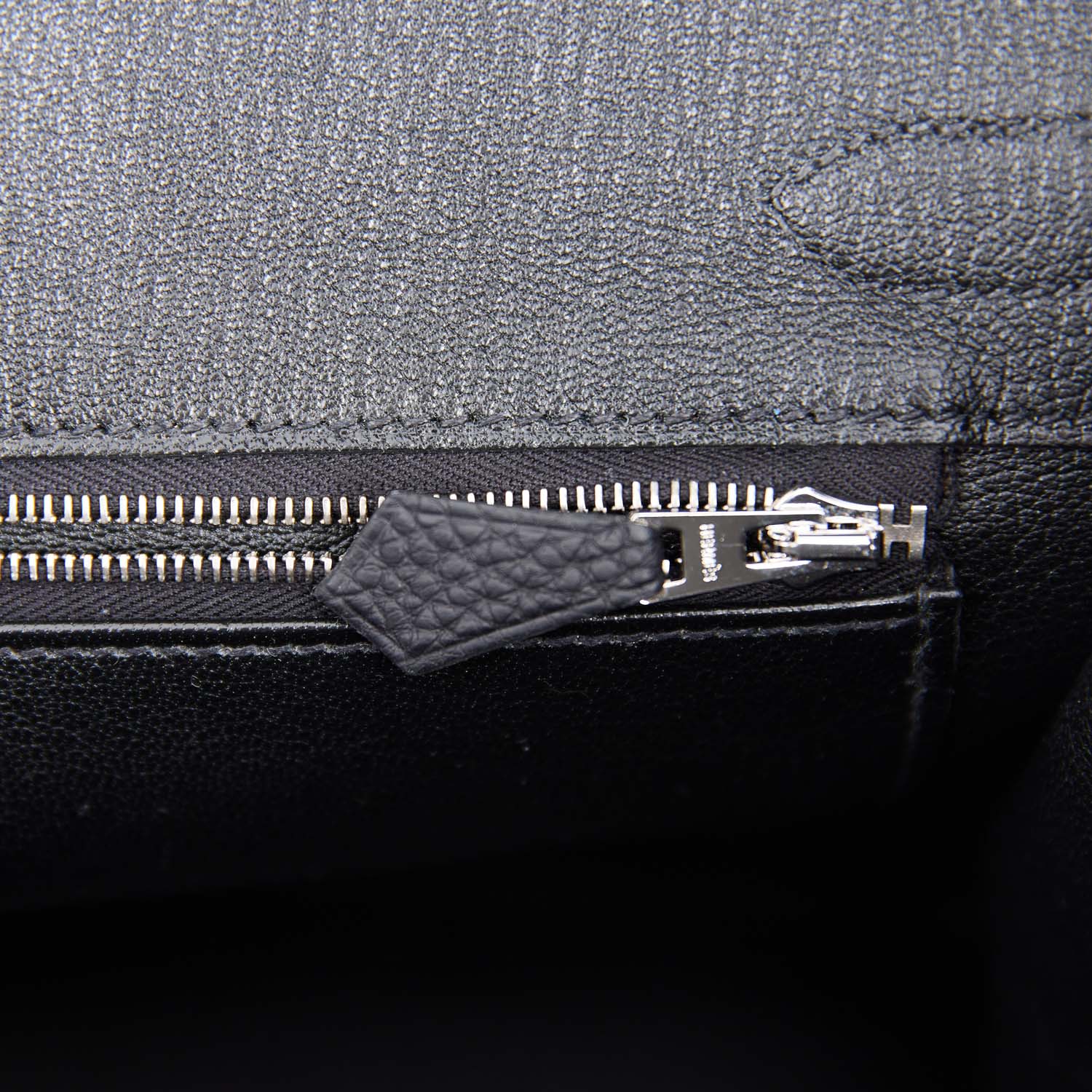 This Birkin is in Black togo leather with palladium hardware and has tonal stitching, front flap, two straps with center toggle closure, clochette with lock and two keys, and double rolled handles.