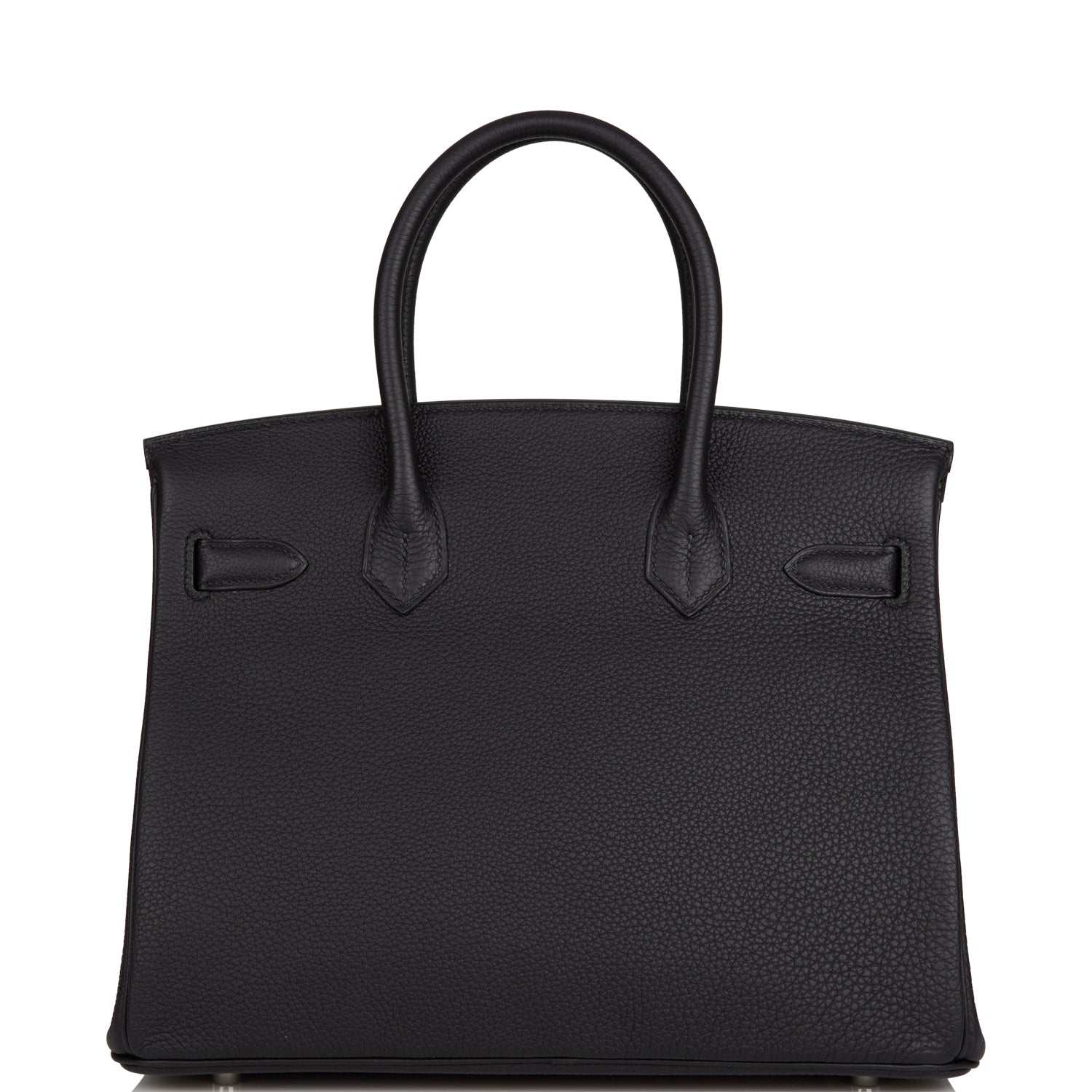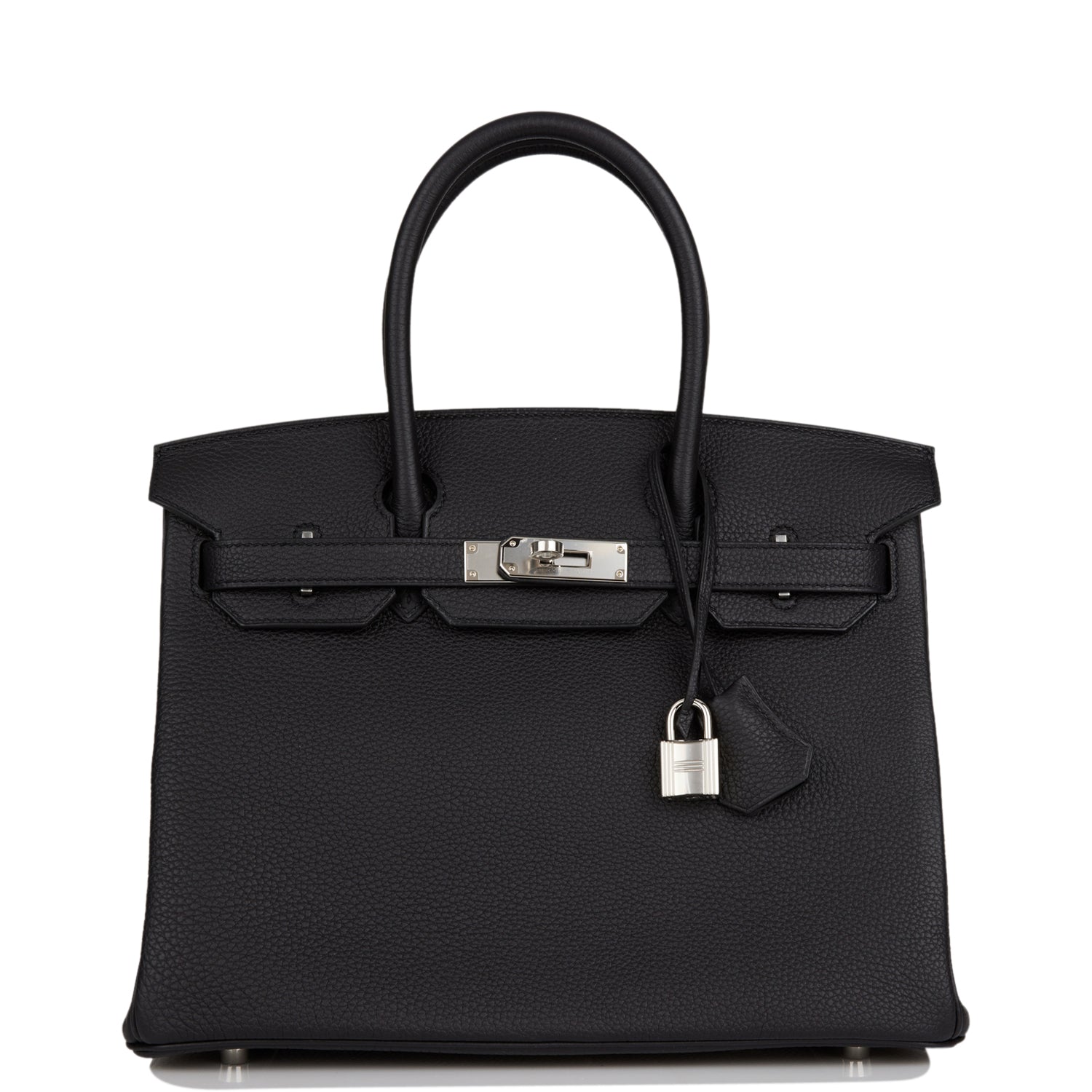 This Birkin is in Black togo leather with palladium hardware and has tonal stitching, front flap, two straps with center toggle closure, clochette with lock and two keys, and double rolled handles.