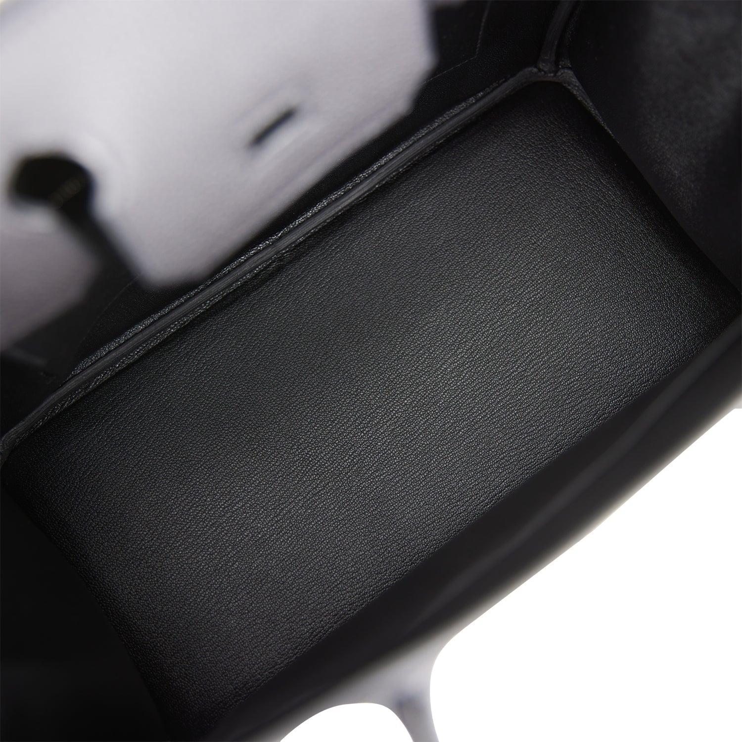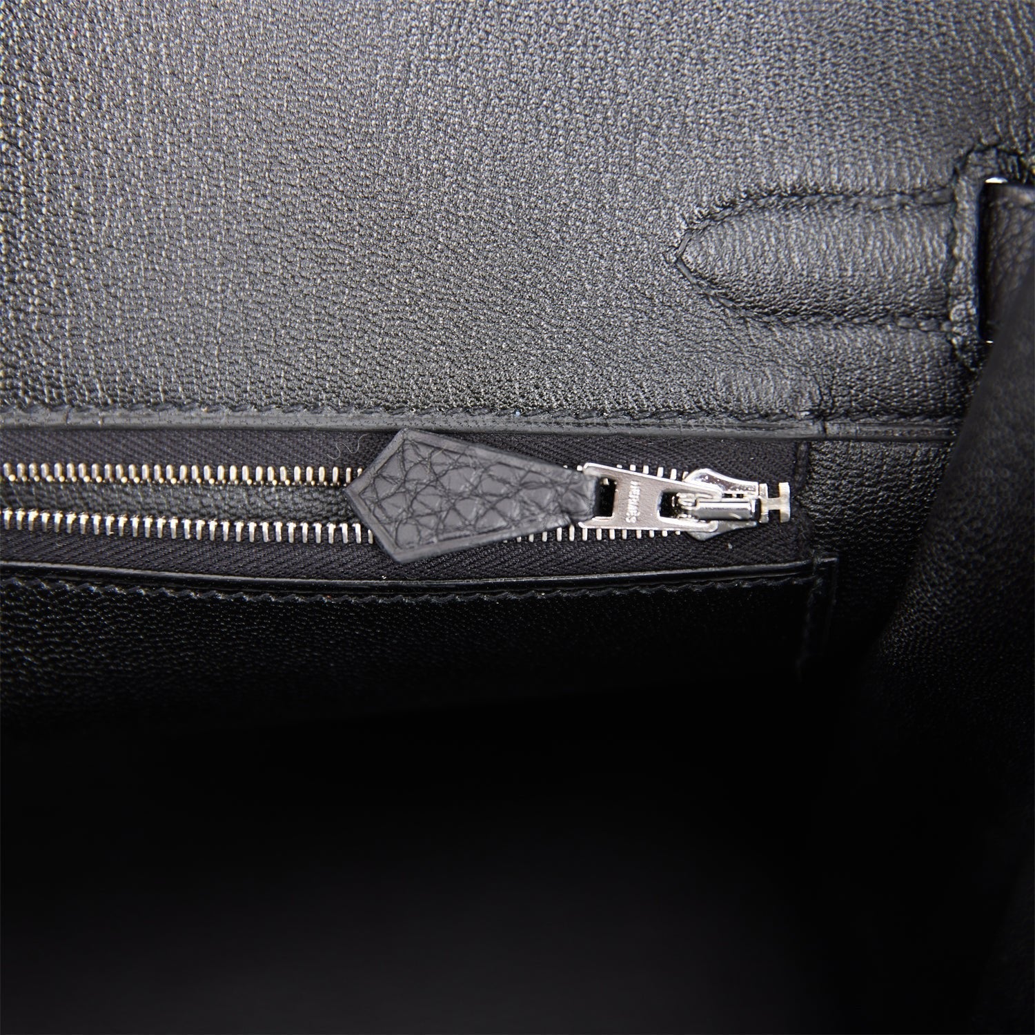 The interior is lined with black chevre and has one zip pocket with an Hermes engraved zipper pull and an open pocket on the opposite side.