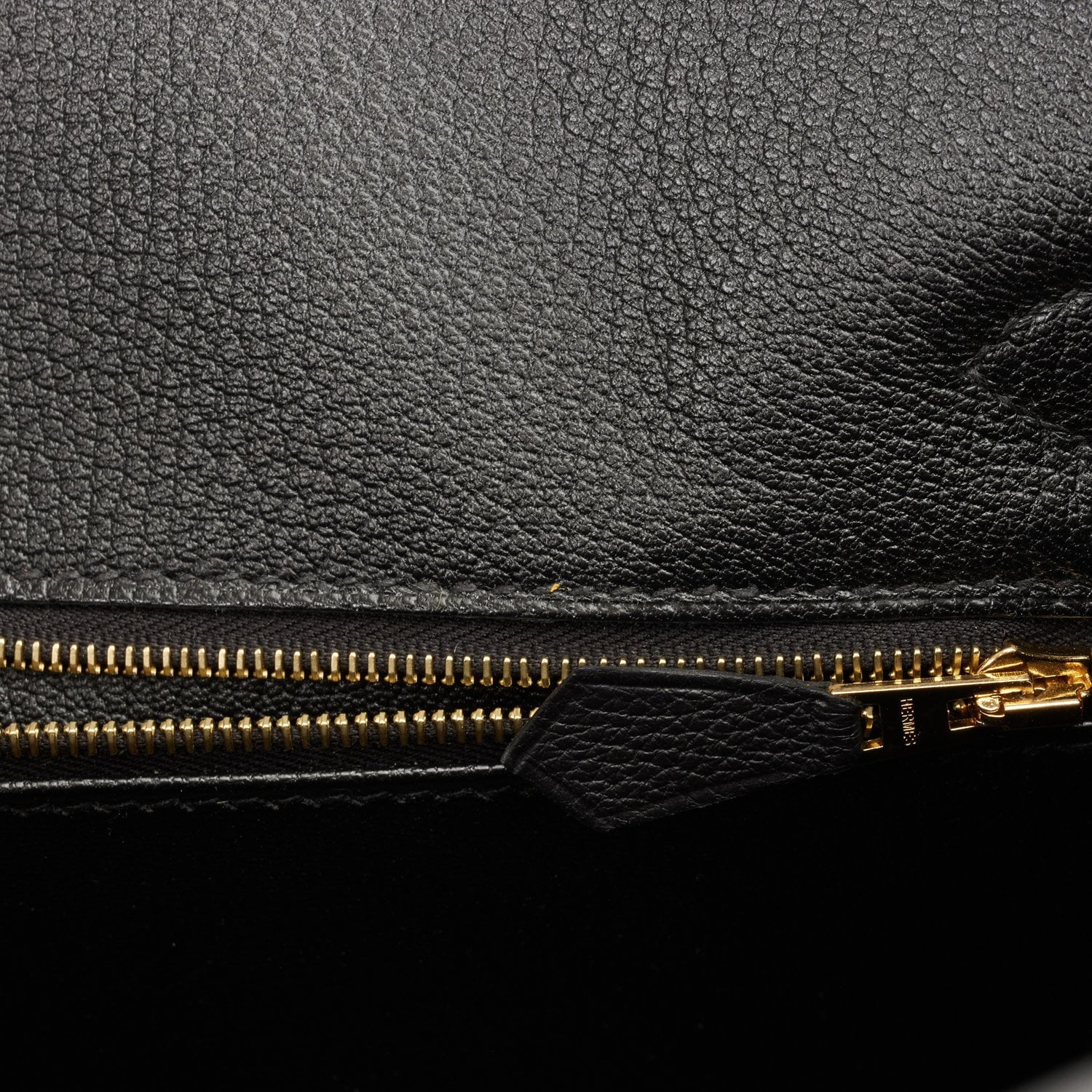 The interior is lined with black chevre and has one zip pocket with an Hermes engraved zipper pull and an open pocket on the opposite side.