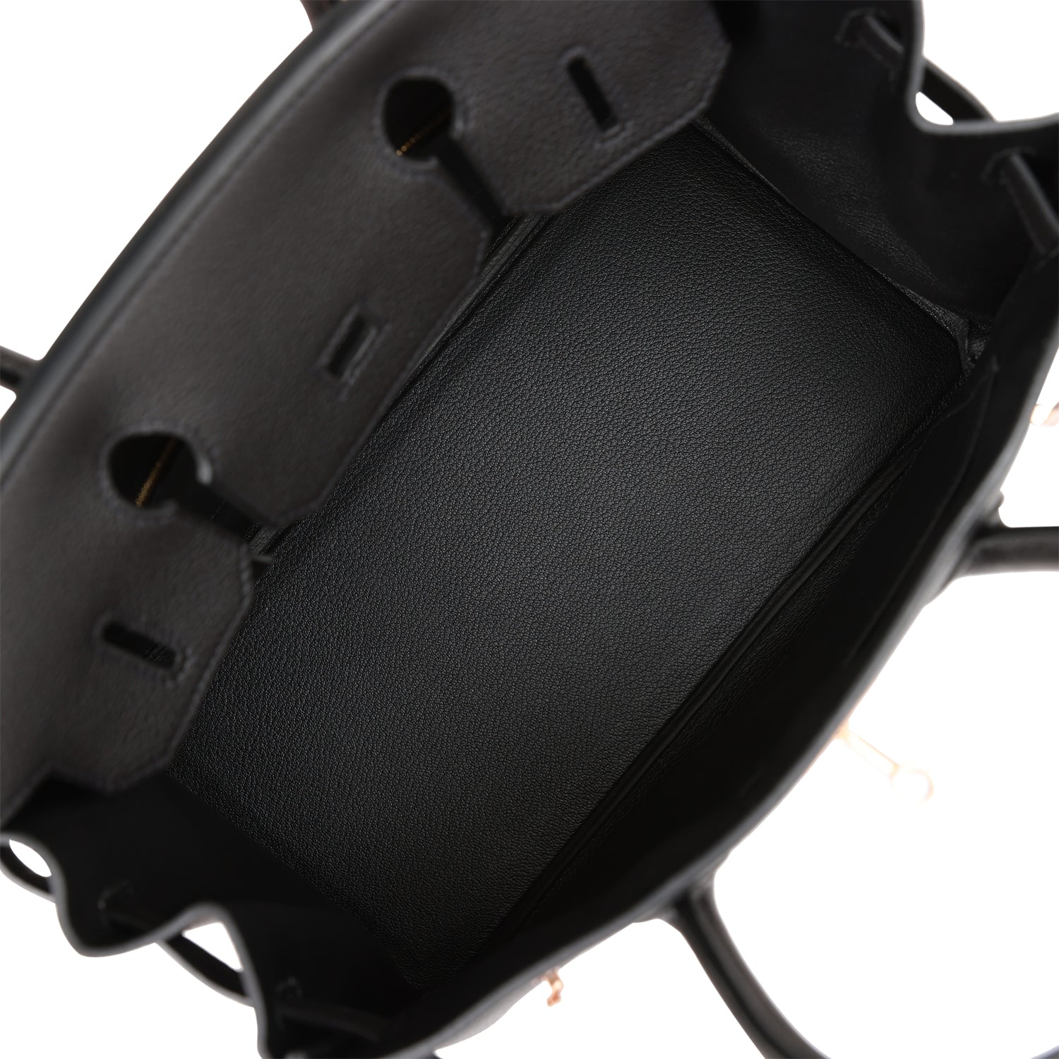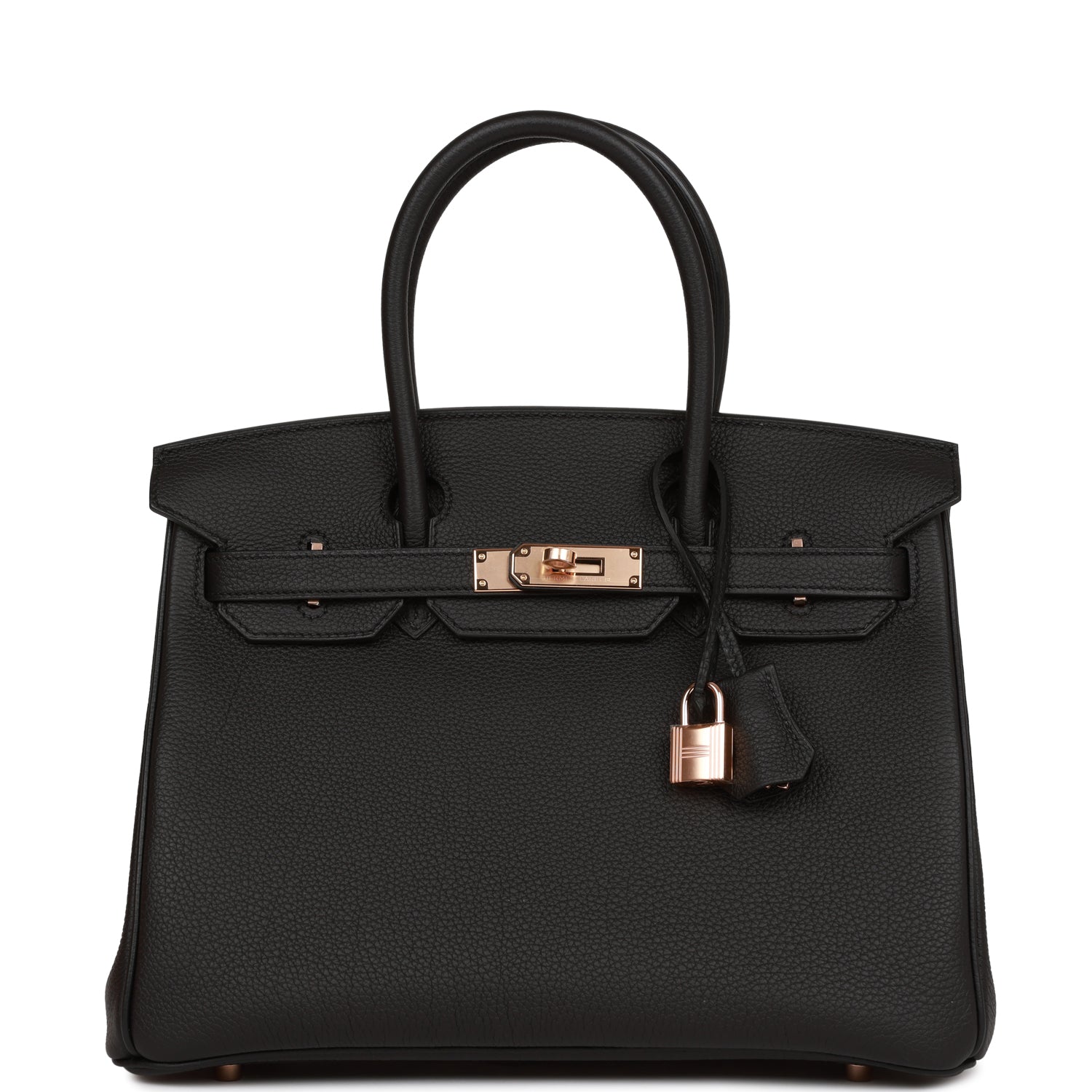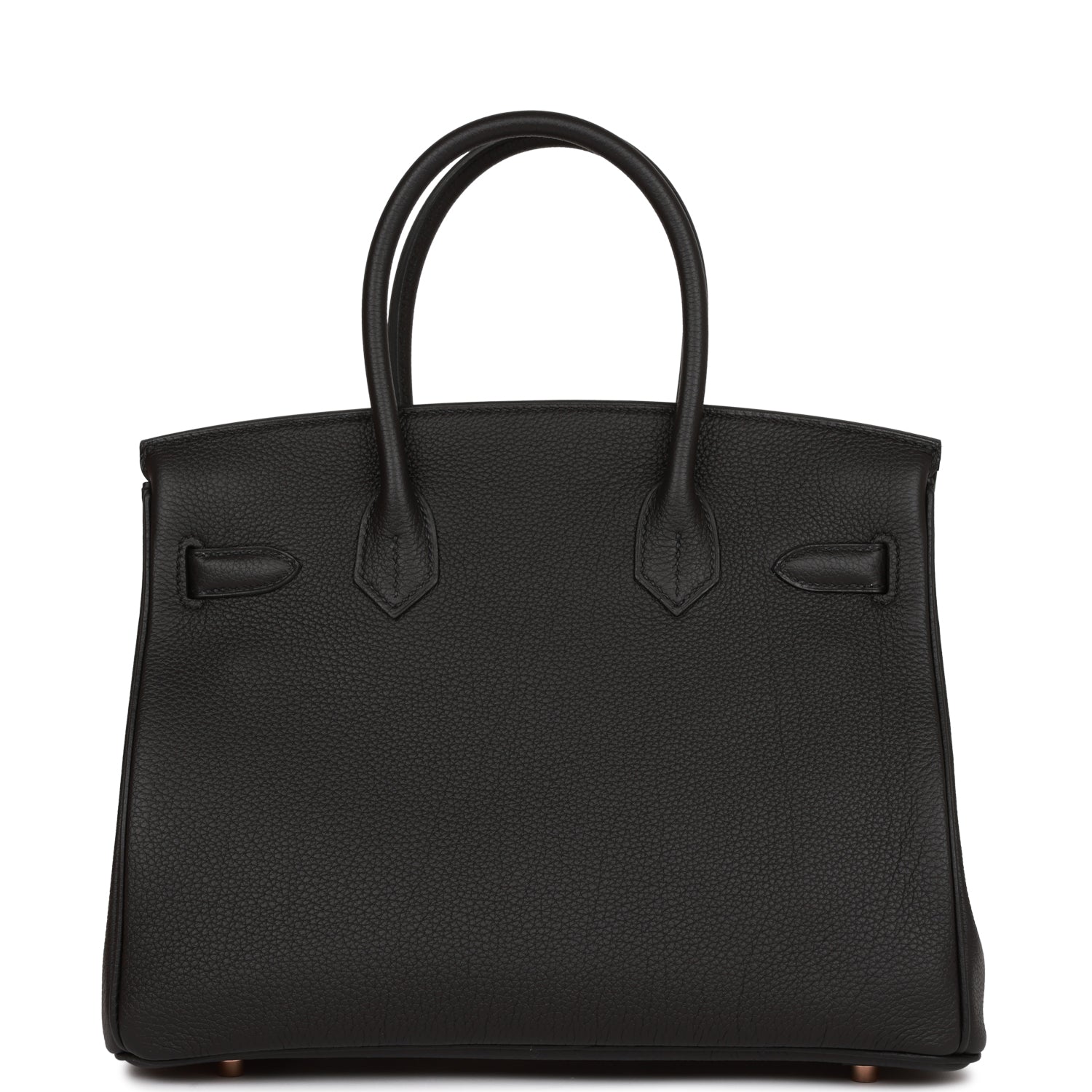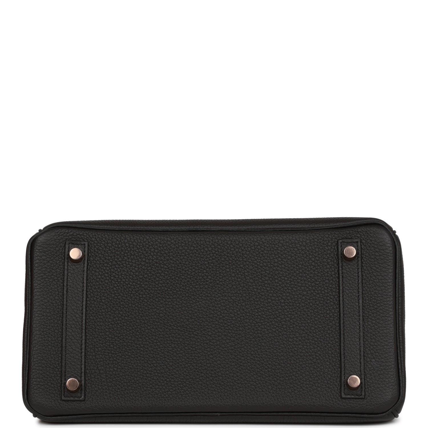 This Birkin is in Black togo leather with rose gold hardware and has tonal stitching, front flap, two straps with center toggle closure, clochette with lock and two keys, and double rolled handles.