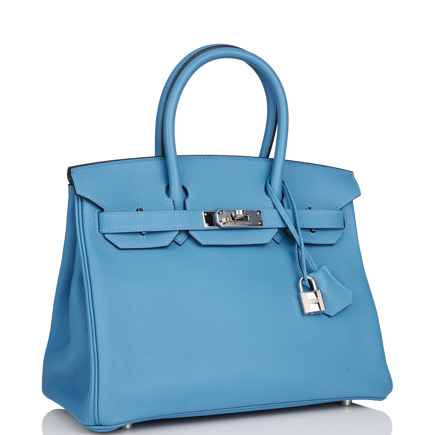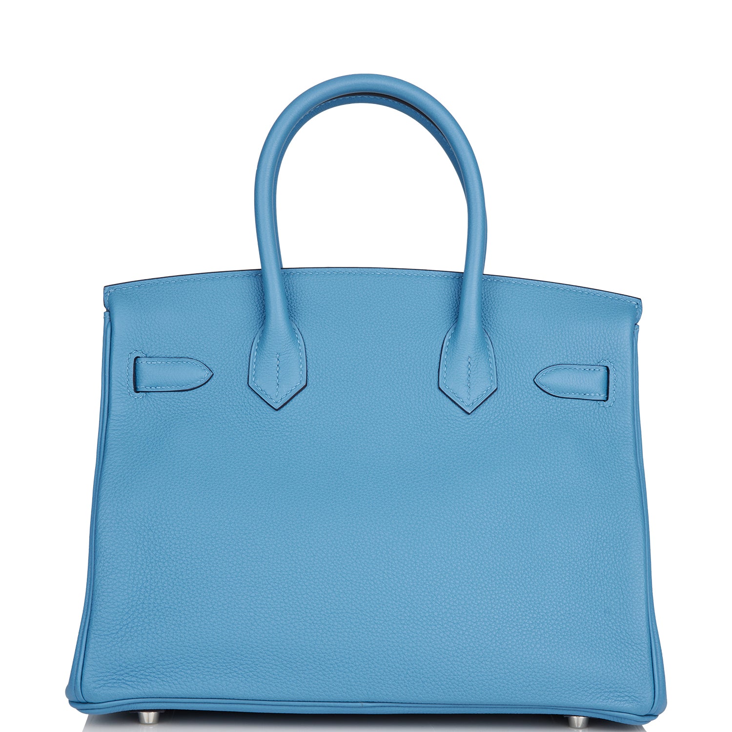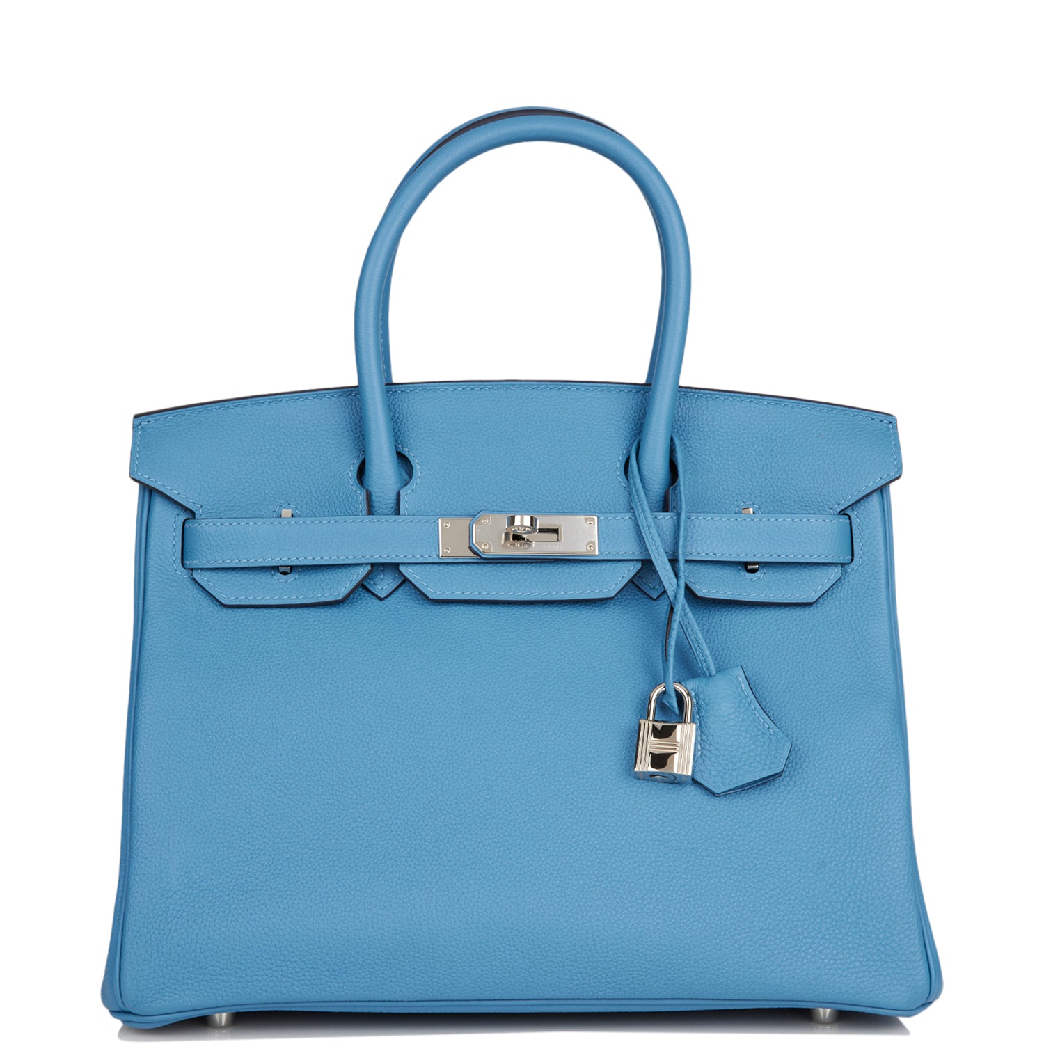 This Birkin is in Bleu Azur togo leather with palladium hardware and has tonal stitching, a front toggle closure, a clochette with lock and two keys, and double rolled handles.