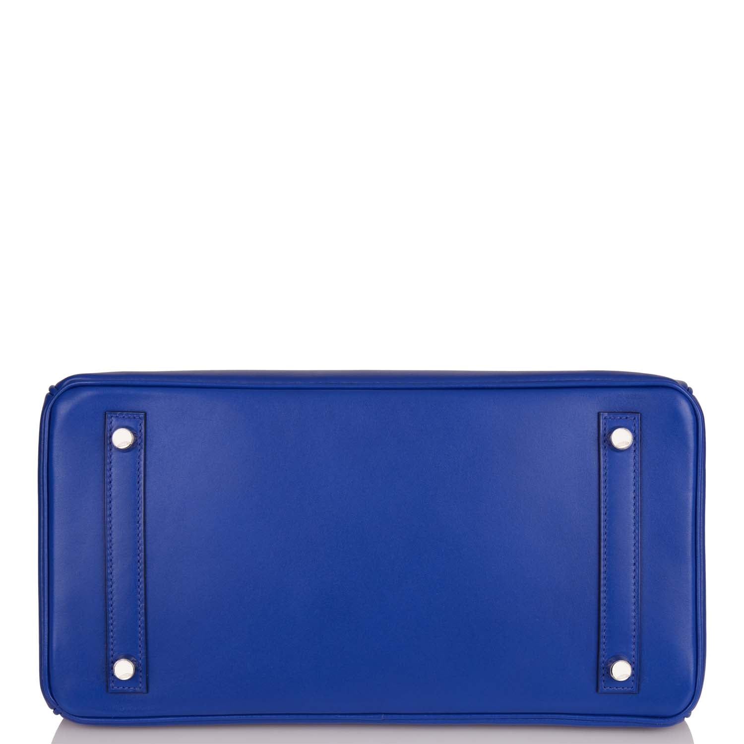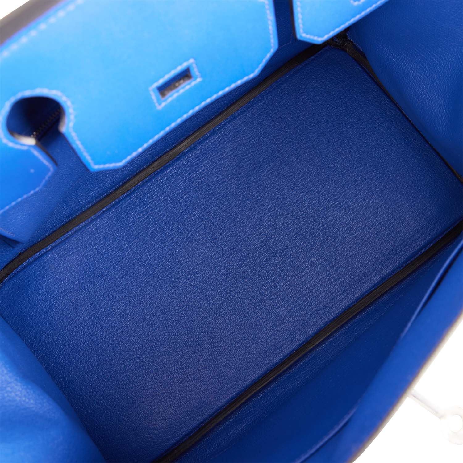 This Birkin is in Bleu Electric tadelakt leather with palladium hardware and has tonal stitching, front flap, two straps with center toggle closure, clochette with lock and two keys, and double rolled handles.