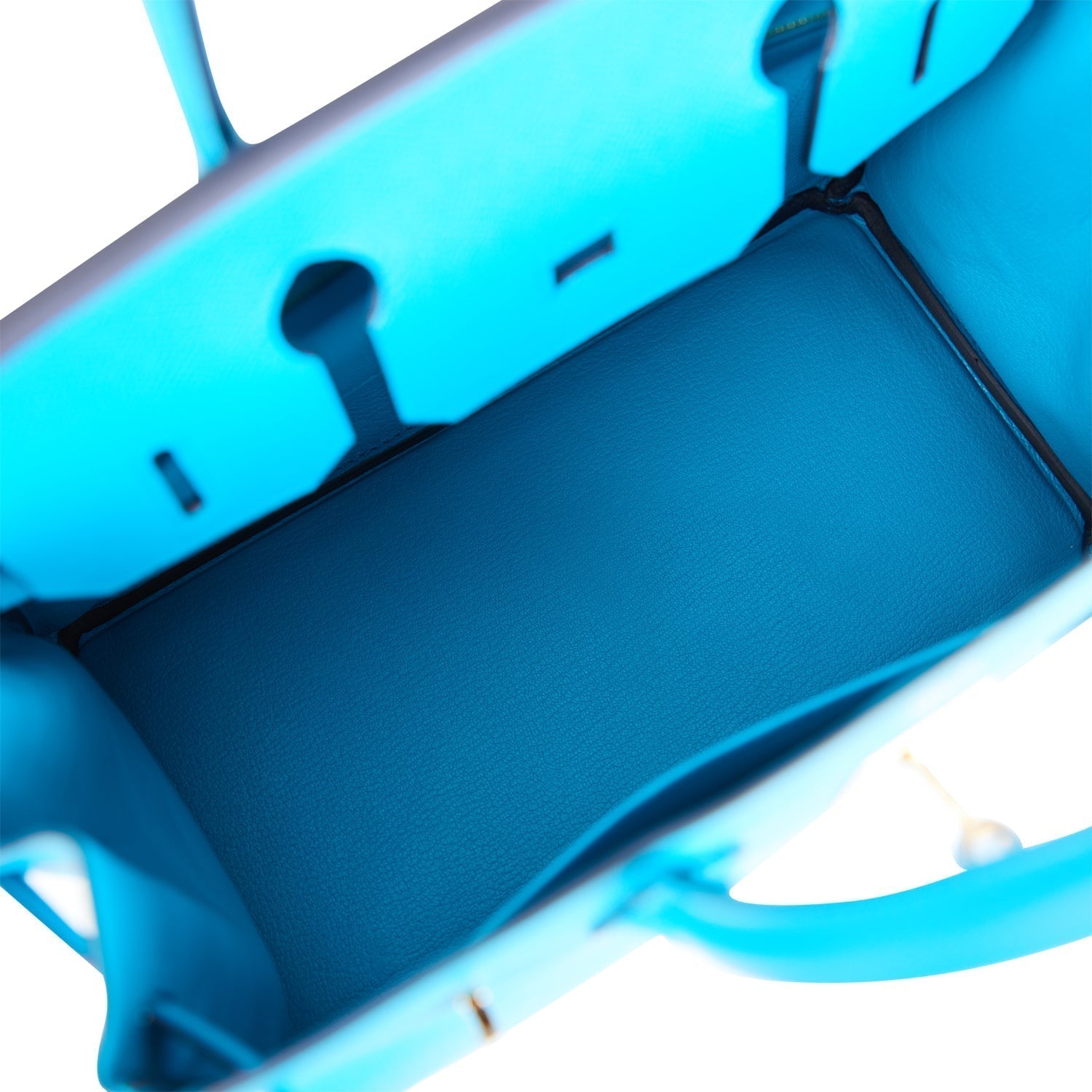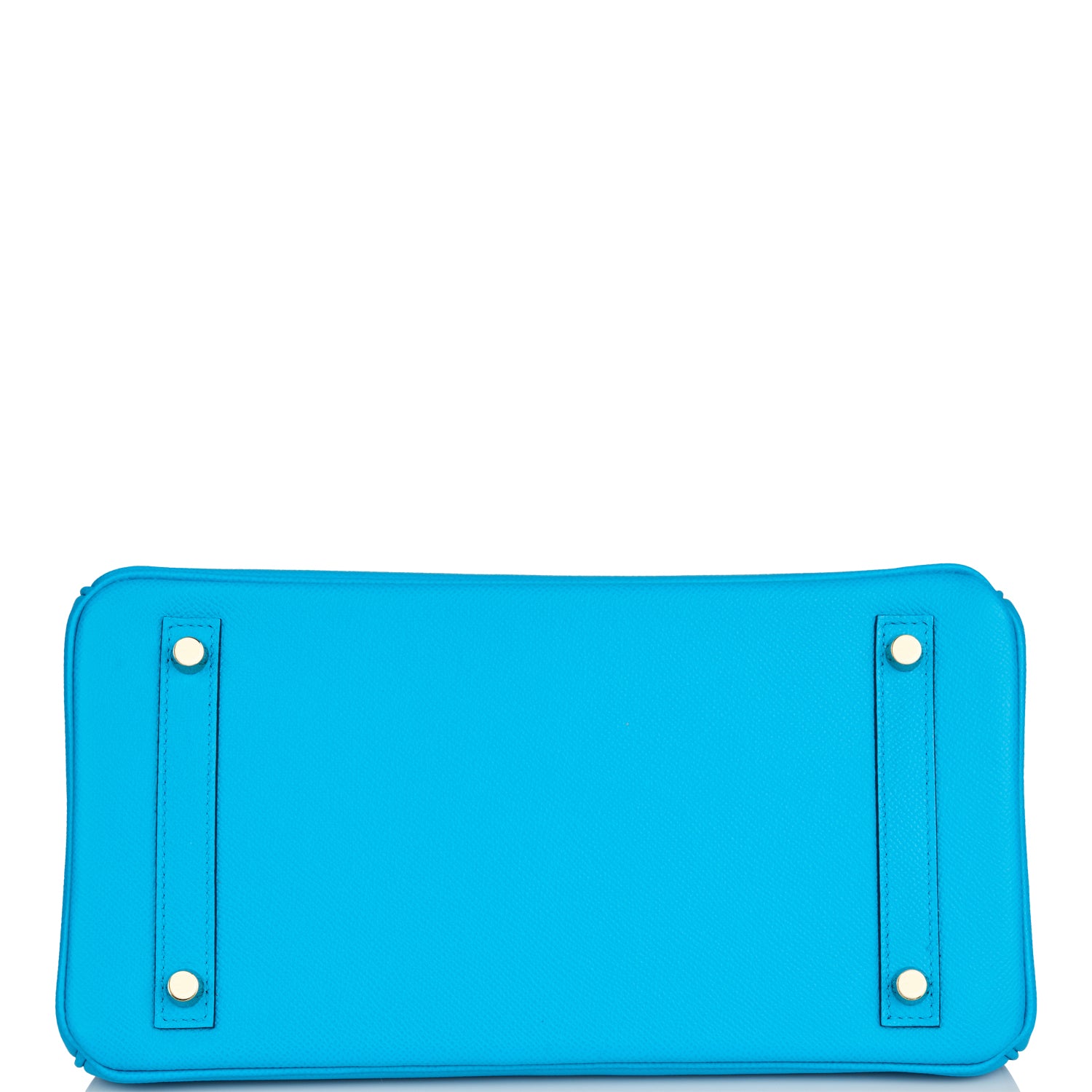 This Birkin is in Bleu Frida epsom leather with gold hardware and has tonal stitching, front flap, two straps with center toggle closure, clochette with lock and two keys, and double rolled handles.