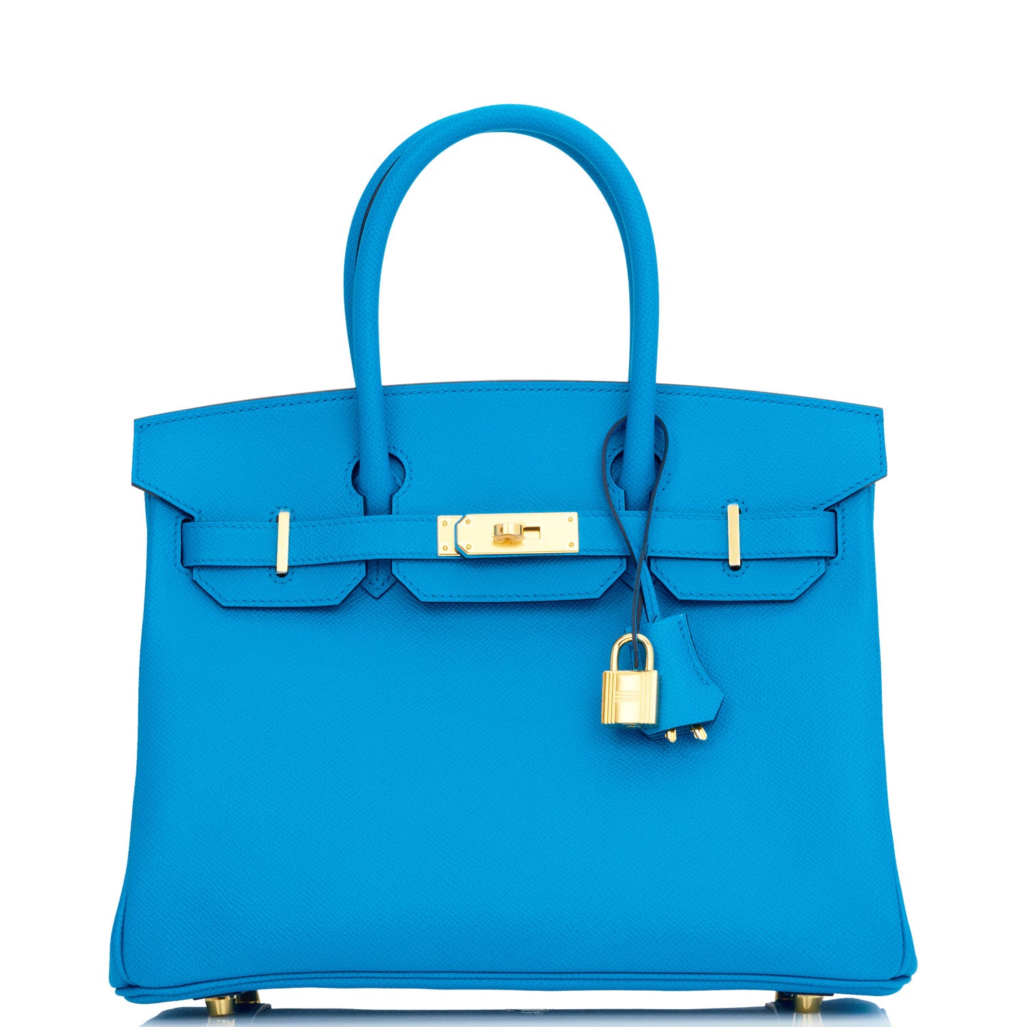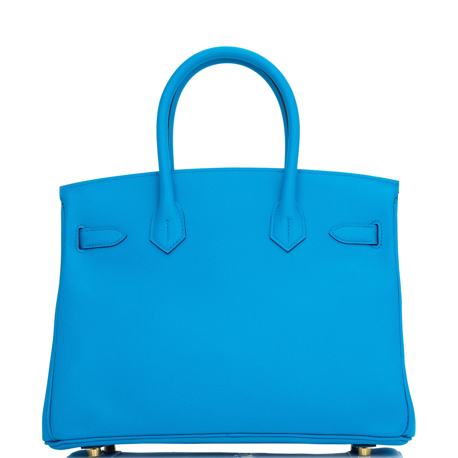 This Birkin is in Bleu Frida epsom leather with gold hardware and has tonal stitching, front flap, two straps with center toggle closure, clochette with lock and two keys, and double rolled handles.