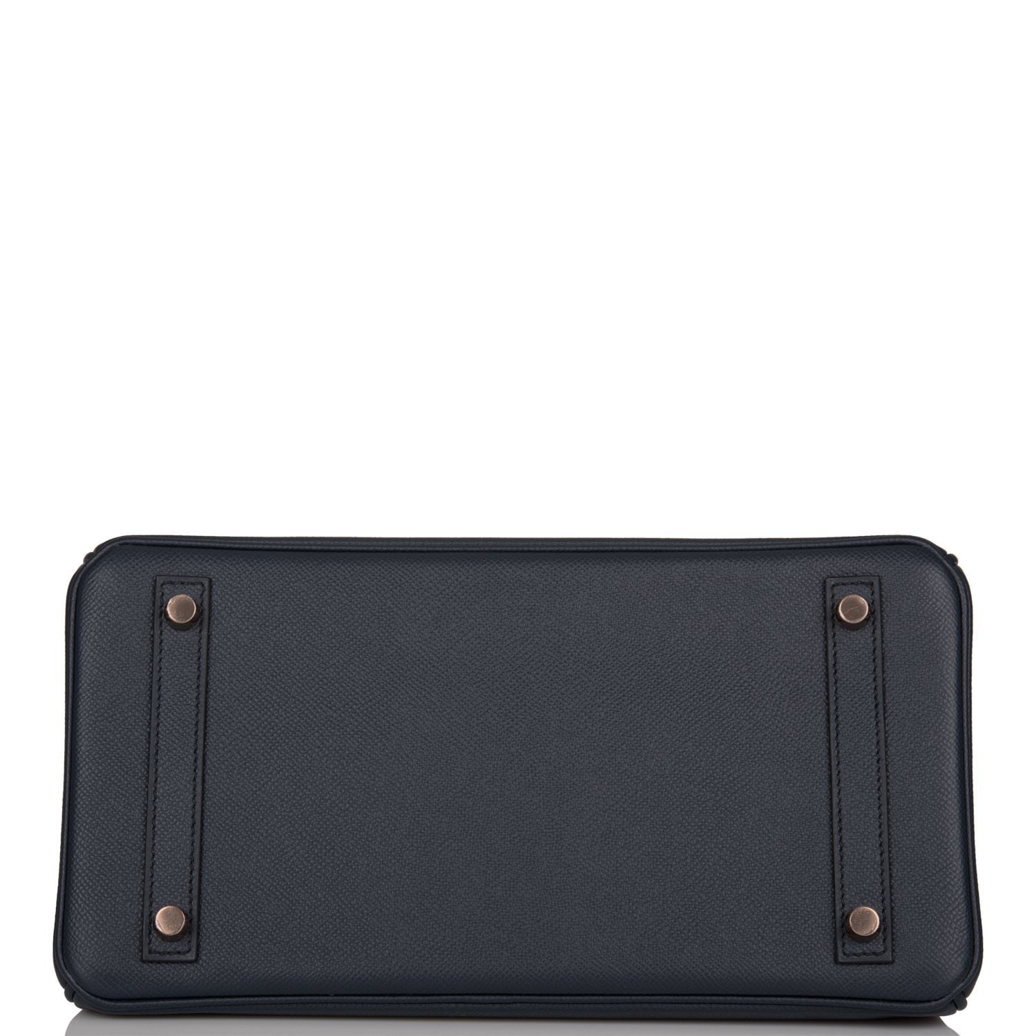 This Birkin is in Bleu Indigo epsom leather with rose gold hardware and has tonal stitching, front flap, two straps with center toggle closure, clochette with lock and two keys, and double rolled handles.