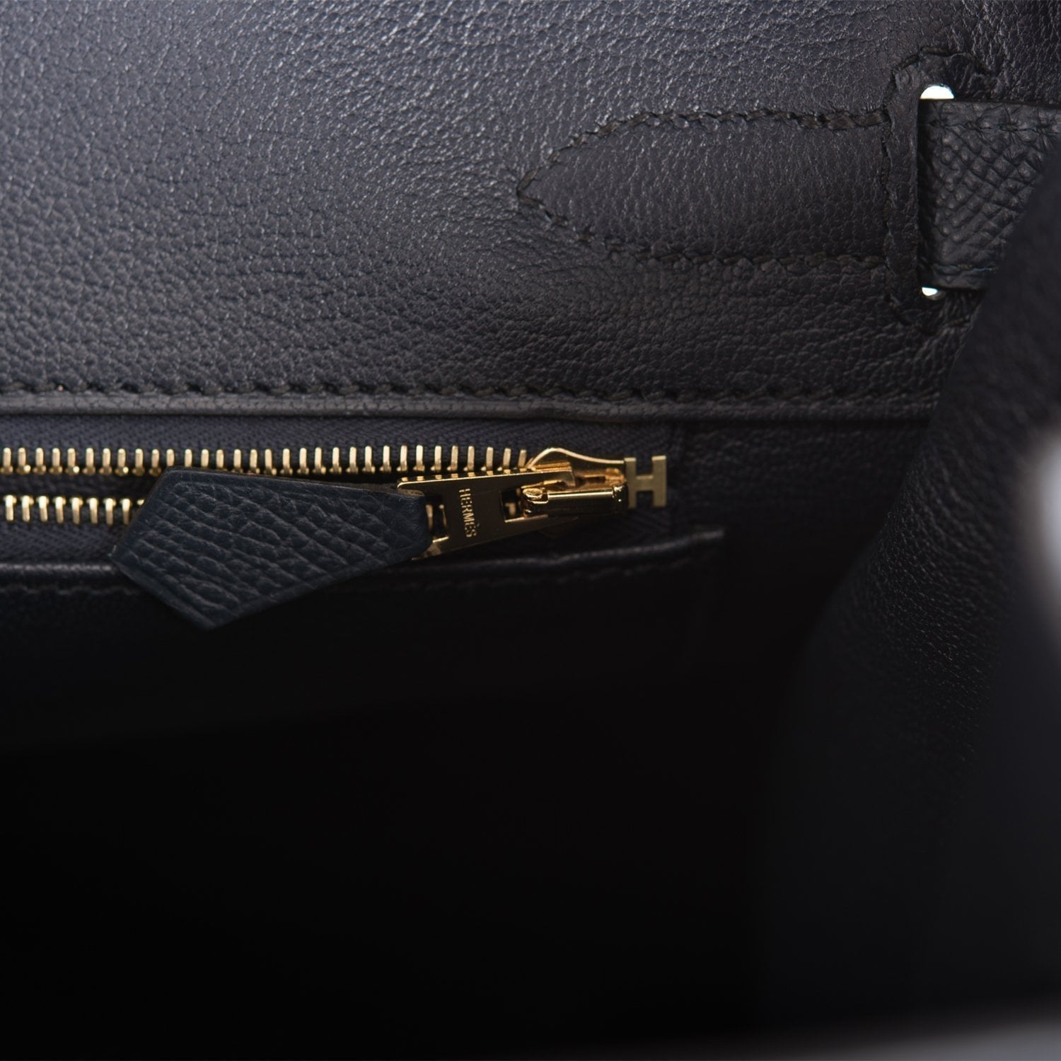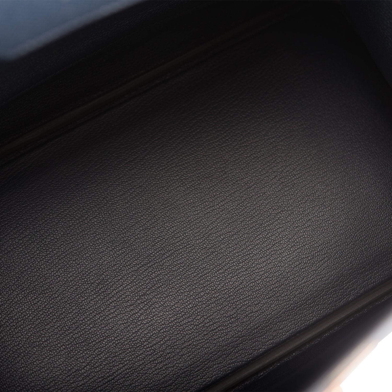 The interior is lined with Bleu Indigo chevre and has one zip pocket with an Hermes engraved zipper pull and an open pocket on the opposite side.